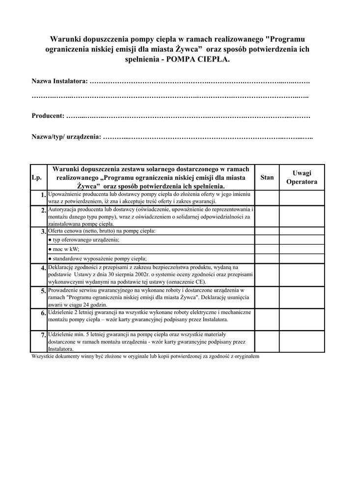 Warunki dopuszczenia pompy ciepła w ramach realizowanego "Programu ograniczenia niskiej emisji dla miasta Żywca” oraz sposób potwierdzenia ich spełnienia - POMPA CIEPŁA. Nazwa Instalatora: …………………………………………….…………….……………...…..……. ……….……..……………………………………………….…………….………………………..….. Producent: ……...….…..……………………………………….…………….………………..……… Nazwa/typ/ urządzenia: ………...…………………………………………………………..……...….. Lp. Warunki dopuszczenia zestawu solarnego dostarczonego w ramach realizowanego „Programu ograniczenia niskiej emisji dla miasta Żywca” oraz sposób potwierdzenia ich spełnienia. 1. Upoważnienie producenta lub dostawcy pompy ciepła do złożenia oferty w jego imieniu wraz z potwierdzeniem, iż zna i akceptuje treść oferty i zakres gwarancji. 2. Autoryzacja producenta lub dostawcy (oświadczenie, upoważnienie do reprezentowania i 3. montażu danego typu pompy), wraz z oświadczeniem o solidarnej odpowiedzialności za zainstalowana pompę ciepła. Oferta cenowa (netto, brutto) na pompę ciepła: ● typ oferowanego urządzenia; ● moc w kW; 4. 5. 6. ● standardowe wyposażenie pompy ciepła; Deklarację zgodności z przepisami z zakresu bezpieczeństwa produktu, wydaną na podstawie Ustawy z dnia 30 sierpnia 2002r. o systemie oceny zgodności oraz przepisami wykonawczymi wydanymi na podstawie tej ustawy (oznaczenie CE). Prowadzenie serwisu gwarancyjnego na wykonane roboty i dostarczone urządzenia w ramach "Programu ograniczenia niskiej emisji dla miasta Żywca". Deklarację usunięcia awarii w ciągu 24 godzin. Udzielenie 2 letniej gwarancji na wszystkie wykonane roboty elektryczne i mechaniczne montażu pompy ciepła – wzór karty gwarancyjnej podpisany przez Instalatora. 7. Udzielenie min. 5 letniej gwarancji na pompę ciepła oraz wszystkie materiały dostarczone w ramach montażu urządzenia - wzór karty gwarancyjne podpisany przez Instalatora. Wszystkie dokumenty winny być złożone w oryginale lub kopii potwierdzonej za zgodność z oryginałem Stan Uwagi Operatora