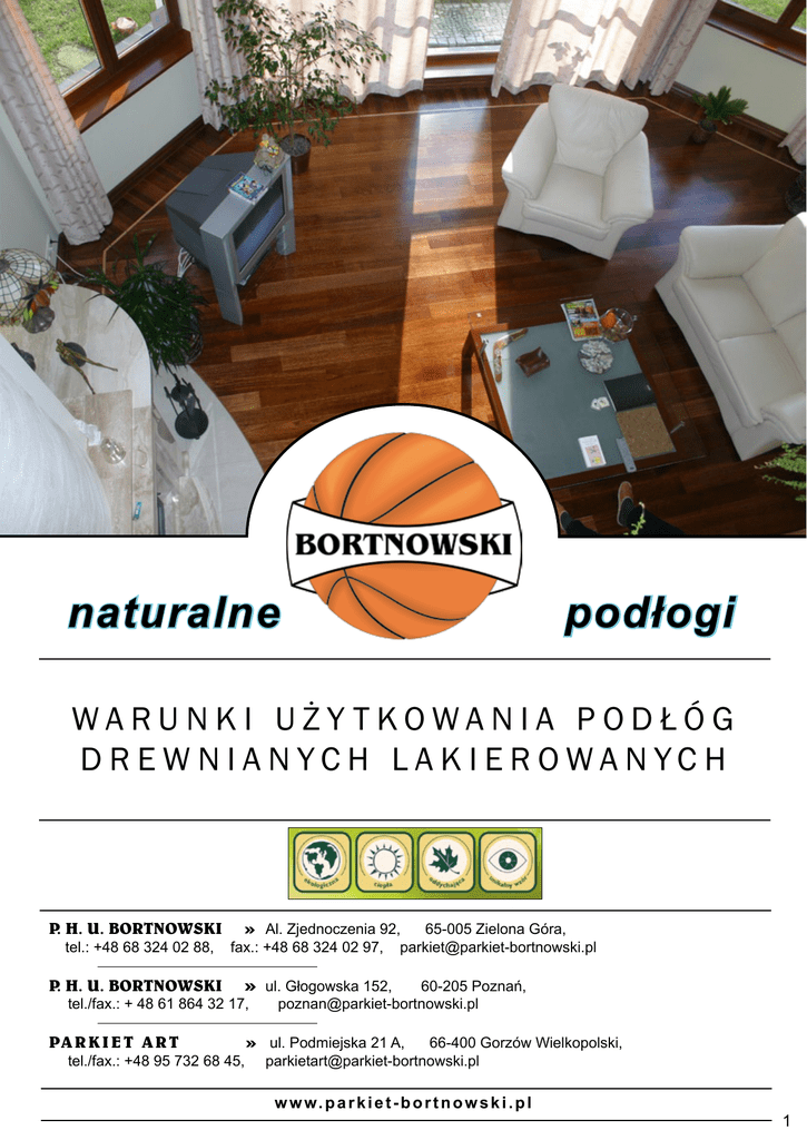 naturalne podłogi WARUNKI UŻY TKOWANIA PODŁÓG D R E W N I A N Y C h l akierowanyc h P. H. U. BORTNOWSKI tel.: +48 68 324 02 88, » Al. Zjednoczenia 92, 65-005 Zielona Góra, fax.: +48 68 324 02 97, [email protected] P. H. U. BORTNOWSKI » ul. Głogowska 152, PA R K I E T A R T » ul. Podmiejska 21 A, 66-400 Gorzów Wielkopolski, [email protected] tel./fax.: + 48 61 864 32 17, tel./fax.: +48 95 732 68 45, 60-205 Poznań, [email protected] w w w. p a r k i e t - b o r t n o w s k i . p l 1 WARUNKI UŻYTKOWANIA PODŁÓG DREWNIANYCH Zakupili Państwo ekologiczny wysokiej jakości naturalny parkiet wykonany w 100% z naturalnego drewna o wysokiej odporności użytkowej. Poza walorami estetycznymi parkiet jest także dobrym izolatorem termicznym, izolatorem akustycznym, dobrym regulatorem mikroklimatu i wilgotności powietrza i materiałem nie alergizującym. Co ważne jest przede wszystkim trwały i może być wielokrotnie odnawiany. Muszą państwo jednak mieć świadomość że nawet tego typu podłogi również zużywają się dlatego kilka podstawowych zasad powinno być przestrzeganych w celu wydłużenia jej żywotności: Drewno jest materiałem higroskopijnym, który rozszerza się gdy wilgotność powietrza rośnie lub kurczy gdy wilgotność spada. Może to powodować powstawanie szczelin, deformacje podłogi i drobne pęknięcia gdy wilgotność powierza jest za wysoka lub za niska w pewnym przedziale czasu. Może mieć to miejsce szczególnie zimą gdy wilgotność spada. Wówczas należy dowilżać pomieszczenia najlepiej za pomocą nawilżacza elektrycznego. Również w pomieszczeniach z klimatyzacją może wystąpić zjawisko zbyt niskiej wilgotności. Aby nie mieć problemów należy utrzymywać w pomieszczeniu klimat o wilgotności powietrza 45-60% i temperaturze ok. 18-22oC. Taki klimat jest najbardziej właściwy zarówno dla zdrowia naszych Klientów jak również dla podłóg drewnianych. Również z tego powodu zimą, pomieszczenie nie może pozostawać nie ogrzewane. Idealnym sposobem pielęgnacji jest używanie do czyszczenia tylko środków pielęgnacyjno – ochronnych wskazanych poniżej. Taka pielęgnacja powinna być powtarzana w zależności od natężenia ruchu. Po pielęgnacji nie może na powierzchni parkietu zalegać woda. Należy zapoznać się z instrukcją użytkowania załączoną do preparatu. Codzienna pielęgnacja może ograniczać się do zwykłego odkurzania bądź zamiatania podłogi. Piach lub brud powinien zostać pilnie usunięty ponieważ działając jak papier ścierny powoduje rysowanie podłogi i nie daje najlepszej optyki powierzchni. Konieczne jest podklejenie krzeseł i mebli podkładkami filcowymi, które muszą być wymieniane zawsze jak tylko są zużyte. Podłoga może zostać poddana kilku krotnej renowacji poprzez szlifowanie i ponowne lakierowanie. Ilość renowacji uzależniona jest od głębokości uszkodzeń mechanicznych oraz od jakości maszyny szlifującej. Proszę pamiętać, że stosowanie powyższych zaleceń znacznie wydłuża żywotność drewnianych podłóg i zmniejsza ryzyko pracy ale nie wyklucza jej całkowicie. Ze względu na brak możliwości kontroli klimatu w trakcie użytkowania przez sprzedającego, gwarancja obejmuje tylko naturalną „pracę” drewna w granicach PN-EN 13 226 i PN-EN 13 228. Przesuszanie lub zawilgocenie drewna wykraczające poza tę normę nie może być przedmiotem reklamacji. 1. Podłoga drewniana może być użytkowana tylko w obuwiu nieniszczącym mechanicznie, bez piasku i ostrych krawędzi. Piasek działa jak papier ścierny. Olej jest elementem eksploatacyjnym i jego trwałość zależy od prawidłowej pielęgnacji i sposobu użytkowania. W zależności od stopnia zużycia podlega on ciągłemu uzupełnianiu środkami pielęgnacyjnymi przez osoby utrzymujące czystość. Gwarancja nie obejmuje uszkodzeń mechanicznych. 2 2. Przed wejściami na parkiet powinny być umieszczone wycieraczki na całą szerokość korytarza w celu przechwytywania mokrego błota, brudu i piasku. 3. Usuwanie kurzu powinno być wykonywane lekko wilgotną ścierką z dodatkiem płynu pielęgnacyjnego. Podłogę należy sprzątać na sucho lub w miarę potrzeb na mokro nie używając dużej ilości wody a tylko mocno wykręconą szmatę ( nie używać tzw. „mopa” gdyż ze względu na niską wilgotność klepek może dojść do wykrawędziowania, wyłódkowania, a w skrajnym przypadku do wybrzuszenia parkietu). Nie mogą pod żadnym warunkiem po sprzątaniu pozostawać mokre ślady. Wszelkie uszkodzenia bądź zaplamienia podłogi spowodowane wylaniem wody i innych płynów lub działaniem wilgoci nie stanowią podstaw do reklamacji. 4. Ze względu na dążenie drewna do równowagi higroskopijnej. Z otaczającym powietrzem wilgotność powietrza powinna być w przedziale 45-60%, a temperatura w przedziale 18-22 oC. W tym celu zimą można używać sztucznych nawilżaczy. Ze względu na brak możliwości kontroli klimatu przez naszą firmę, gwarancja obejmuje tylko użytkowanie drewna w granicach normy PN-EN 13 226, PN-EN 13 228. Przesuszanie lub zawilgocenie drewna wykraczające poza tę normę i naturalna praca drewna w granicach normy nie może być przedmiotem reklamacji. 5. Wszelkie meble i urządzenia powinny być podklejone podkładkami filcowymi. 6. Do foteli na rolkach należy stosować kółka miękkie tzw. rolki gumowe i biurowe przeźroczyste maty podkładowe ROLL-STOP. 7. Pielęgnację lakieru, pod rygorem utraty gwarancji, należy przeprowadzać tylko środkiem Parkettglanz firmy LOBA. Nie wolno stosować typowych past do podłóg lub innych środków czyszczących na bazie silikonu! (mocno utrudni to następną renowację). 8. Zaleca się przynajmniej raz na 6 miesięcy przeprowadzić maszyną do polerowania parkietu, pielęgnację polegającą na maszynowym zabezpieczeniu krawędzi płynem antyadhezyjnym. 9.Nigdy nie należy przykrywać parkietu folią lub materiałami nieprzepuszczalnymi 