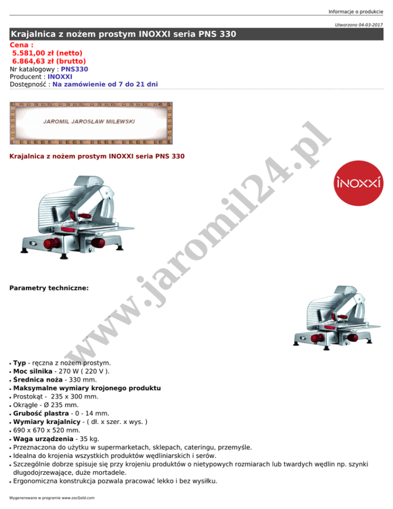 Informacje o produkcie Utworzono 04-03-2017 Krajalnica z nożem prostym INOXXI seria PNS 330 Cena : 5.581,00 zł (netto) 6.864,63 zł (brutto) 4. pl Nr katalogowy : PNS330 Producent : INOXXI Dostępność : Na zamówienie od 7 do 21 dni ● ● ● ● ● ● ● ● ● ● ● ● ● ● w w w Parametry techniczne: .ja ro m il2 Krajalnica z nożem prostym INOXXI seria PNS 330 Typ - ręczna z nożem prostym. Moc silnika - 270 W ( 220 V ). Średnica noża - 330 mm. Maksymalne wymiary krojonego produktu Prostokąt - 235 x 300 mm. Okrągłe - Ø 235 mm. Grubość plastra - 0 - 14 mm. Wymiary krajalnicy - ( dł. x szer. x wys. ) 690 x 670 x 520 mm. Waga urządzenia - 35 kg. Przeznaczona do użytku w supermarketach, sklepach, cateringu, przemyśle. Idealna do krojenia wszystkich produktów wędliniarskich i serów. Szczególnie dobrze spisuje się przy krojeniu produktów o nietypowych rozmiarach lub twardych wędlin np. szynki długodojrzewające, duże mortadele. Ergonomiczna konstrukcja pozwala pracować lekko i bez wysiłku. Wygenerowano w programie www.oscGold.com ● ● ● ● ● ● ● ● ● Najwyższy standart higieny dzięki nowoczesnym rozwiązaniom konstrukcyjnym. Bezpieczna praca. Wbudowana ostrzałka umożliwia skuteczne ostrzenie. Niskie koszty eksplatacji - tanie części eksplatacyjne ( nóż, kamienie ostrzące ). Nowoczesna stylizacja i elegancki wygląd. Urządzenie jest bardzo ciche w pracy. Pod względem bezpieczeństwa mechanicznego opisana krajalnica jest zgodna z uregulowaniami EWG nr 98/37, 73/23 i 89/336 oraz z normą europejską EN 1974. Zabezpieczenia elektryczne spełniają wymogi norm EN 60204 i EN 60335-2-64. Urządzenie produkowane jest w UE i w związku z tym ma oznaczenie CE- Conformité Européenne) umieszczone na wyrobie jest deklaracją producenta, że oznakowany produkt spełnia wymagania dyrektyw tzw. "Nowego Podejścia" Unii Europejskiej (UE). 4. pl Krótki opis: Krajalnice INOXXI to solidne maszyny przeznaczone do wydajnej codziennej pracy w placówkach handlowych. Znajdziesz wśród nich: ergonomiczne krajalnice ręczne z nożem pochylonym i prostym, wydajne krajalnice półautomatyczne oraz wyrafinowane maszyny w stylu retro – do wnętrz, w których styl ma szczególne znaczenie. ro m il2 O marce INOXXI: .ja INOXXI to profesjonalna obróbka żywności dostosowana do tempa życia i wysokich wymagań jakościowych konsumentów XXI w. To nowoczesne rozwiązania dla gastronomii, handlu i przemysłu spożywczego, które pozwalają profesjonalistom pracować szybko, wydajnie i na wysokim poziomie. w w INOXXI oferuje duży wybór urządzeń do profesjonalnej obróbki żywności, takich jak krajalnice, pakowarki próżniowe, maszyny do mielenia mięsa, urządzenia do rozbijania mięsa na kotlety, piły. Są to nowoczesne urządzenia wykorzystujące znane i sprawdzone technologie oraz rozwiązania innowacyjne, rozszerzające możliwości profesjonalnej obróbki i przygotowania żywności. Wszystkie przystosowane są do intensywnej codziennej pracy z profesjonalną wydajnością. Oto dlaczego warto pracować urządzeniami INOXXI: ● ● ● ● ● Pomagają spełnić wymagania surowych współczesnych norm dotyczących higieny i bezpieczeństwa produktów. Przyspieszają pracę. Niektóre urządzenia skracają nawet 5-krotnie czas przyrządzenia potraw i produktów żywnościowych, zachowując lub poprawiając jakość, smak i bezpieczeństwo przygotowanej żywności. Poprawiają efektywność ekonomiczną oszczędzając czas i pieniądze. Pomagają oszczędzać na kosztach pracy. Pozwalają zaoszczędzić na kosztach surowca. Dzięki pakowarkom próżniowym INOXXI można np. zapakować próżniowo produkty kupione latem i wykorzystać je zimą - praktycznie bez straty wartości smakowych i odżywczych kiedy te same produkty kosztują nawet 4 razy drożej! Przedłużenie trwałości potraw zmniejsza straty i oszczędza pieniądze! Ułatwiają pracę, pozwalają lepiej wykorzystać i zorganizować pracę personelu. Odpowiednie wykorzystanie nowych technologii (np. połączenie pakowania próżniowego i schładzania szokowego) pozwala jednej osobie obsłużyć w lokalu gastronomicznym taką liczbę osób, jakiej nie obsłużyłaby bez pomocy urządzeń INOXXI. Zwiększają mobilność: np. technologie pakowania prózniowego i schładzania szokowego to idealne rozwiązania dla firm cateringowych, które mogą oferować swoim klientom jeszcze szybsze, bardziej elastyczne i mobilne rozwiązania, bez straty jakości produktów lub zwiększonego ryzyka namnażania się bakterii. Ergonomiczne rozwiązania INOXXI zwiększają komfort pracy, zmniejszając jej uciążliwość i sprawiając, że personel może pracować wydajniej przez wiele godzin. Np. urządzenia INOXXI do zmiękczania mięsa w ● Informacje o produkcie ● sprawiają, że rozbijanie mięsa na kotlety staje się znacznie łatwiejsze, wielokrotnie mniej czaso- i pracochłonne. Urządzenia INOXXI są oferowane w wielu wersjach i wariantach różniących się dostępnymi funkcjami, wielkością i wydajnością, pozwalając dobrać odpowiednie urządzenie do potrzeb, wymagań i możliwości firm handlowych, gastronomicznych lub produkcyjnych. w w w .ja ro m il2 4. pl Urządzenia i rozwiązania INOXXI do obróbki termicznej i mechanicznej zaspokajają wiele codziennych potrzeb związanych z przygotowaniem żywności w gastronomii i handlu. Warto poznać wszystkie rozwiązania INOXXI, zapoznać się z ich zaletami i już dziś zacząć korzystać z możliwości, jakie daje firmom handlowym i sklepom dostępna technologia. Wygenerowano w programie www.oscGold.com