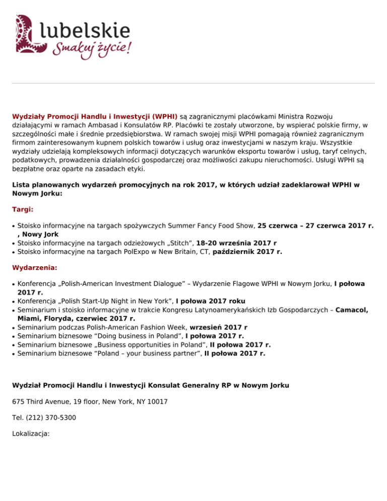 Wydziały Promocji Handlu i Inwestycji (WPHI) są zagranicznymi placówkami Ministra Rozwoju działającymi w ramach Ambasad i Konsulatów RP. Placówki te zostały utworzone, by wspierać polskie firmy, w szczególności małe i średnie przedsiębiorstwa. W ramach swojej misji WPHI pomagają również zagranicznym firmom zainteresowanym kupnem polskich towarów i usług oraz inwestycjami w naszym kraju. Wszystkie wydziały udzielają kompleksowych informacji dotyczących warunków eksportu towarów i usług, taryf celnych, podatkowych, prowadzenia działalności gospodarczej oraz możliwości zakupu nieruchomości. Usługi WPHI są bezpłatne oraz oparte na zasadach etyki. Lista planowanych wydarzeń promocyjnych na rok 2017, w których udział zadeklarował WPHI w Nowym Jorku: Targi: ● ● ● Stoisko informacyjne na targach spożywczych Summer Fancy Food Show, 25 czerwca – 27 czerwca 2017 r. , Nowy Jork Stoisko informacyjne na targach odzieżowych „Stitch”, 18-20 września 2017 r Stoisko informacyjne na targach PolExpo w New Britain, CT, październik 2017 r. Wydarzenia: ● ● ● ● ● ● ● Konferencja „Polish-American Investment Dialogue” – Wydarzenie Flagowe WPHI w Nowym Jorku, I połowa 2017 r. Konferencja „Polish Start-Up Night in New York”, I połowa 2017 roku Seminarium i stoisko informacyjne w trakcie Kongresu Latynoamerykańskich Izb Gospodarczych – Camacol, Miami, Floryda, czerwiec 2017 r. Seminarium podczas Polish-American Fashion Week, wrzesień 2017 r Seminarium biznesowe “Doing business in Poland”, I połowa 2017 r. Seminarium biznesowe „Business opportunities in Poland”, II połowa 2017 r. Seminarium biznesowe “Poland – your business partner”, II połowa 2017 r. Wydział Promocji Handlu i Inwestycji Konsulat Generalny RP w Nowym Jorku 675 Third Avenue, 19 floor, New York, NY 10017 Tel. (212) 370-5300 Lokalizacja: Rodzaj: WPHI Strona internetowa: http://www.newyork.trade.gov.pl [1] Drukuj [2] Pobierz PDF [3] Pobierz DOC [4] Źródło: http://www.invest.lubelskie.pl/pl/wydzial-promocji-handlu-i-inwestycji-konsulat-generalny-rp-w-nowym-jorku Odnośniki [1] http://www.newyork.trade.gov.pl [2] http://www.invest.lubelskie.pl/pl/print/897 [3] http://www.invest.lubelskie.pl/pl/printpdf/897 [4] http://www.invest.lubelskie.pl/pl/print/897?type=doc