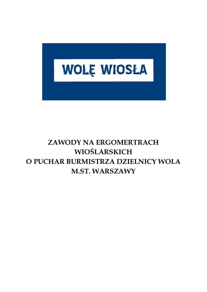 ZAWODY NA ERGOMERTRACH WIOŚLARSKICH O PUCHAR BURMISTRZA DZIELNICY WOLA M.ST. WARSZAWY REGULAMIN GIMNAZJA 1. Zawody zostaną rozegrane na ergometrach wioślarskich Concept II. 2. Ustawienie przesłony (oporu) dokonuje zawodnik przed startem do biegu. 3. Do zawodów można zgłosić dowolną ośmioosobową drużynę, w skład zespołu wchodzą zawodnicy z tej samej szkoły. 4. Zawody zostaną rozegrane w kategorii dziewcząt, i chłopców nie dopuszcza się udziału mieszanych składów sztafet. 5. Każda szkoła może zgłosić maksymalnie 1 zespół w kategorii chłopców oraz 1 zespół w kategorii dziewcząt. 6. W skład każdej drużyny musi wchodzić: 2 zawodników/zawodniczki z klas pierwszych, 2 zawodników/zawodniczki z klas drugich, 2 zawodników/zawodniczki z klas trzecich, 2 zawodników/zawodniczki bez uwagi na klasę. 7. Dystans dla każdego uczestnika wynosi 2 minuty i jest zaprogramowany w komputerze. 8. Zawody zostaną rozegrane w seriach. 9. Odległość wskazana przez komputer ergometru jest odległością oficjalną. 10. Awaria ergometru upoważnia zawodnika do ponownego samodzielnego pokonania dystansu po ostatnim biegu przewidzianym w programie. 11. O miejscu drużyny decyduje suma uzyskanych metrów przez członków zespołu. 12. Zwycięża drużyna która uzyska największą odległość. REGULAMIN LICEA 1. Zawody zostaną rozegrane na ergometrach wioślarskich Concept II. 2. Ustawienie przesłony (oporu) dokonuje zawodnik przed startem do biegu. 3. Do zawodów można zgłosić dowolna ośmioosobową drużynę, w skład zespołu wchodzą zawodnicy z tej samej szkoły. 4. Zawody zostaną rozegrane w kategorii dziewcząt, i chłopców nie dopuszcza się udziału mieszanych składów sztafet. 5. Każda szkoła może zgłosić maksymalnie 1 zespół w kategorii chłopców oraz 1 zespół w kategorii dziewcząt. 6. W skład każdej drużyny musi wchodzić: 2 zawodników/zawodnicze z klas pierwszych, 2 zawodników/ zawodniczek z klas drugich, 2 zawodników/ zawodniczek z klas trzecich, 2 zawodników/zawodniczek bez uwagi na klasę. 7. Dystans dla każdego uczestnika wynosi 3 minuty i jest zaprogramowany w komputerze. 8. Zawody zostaną rozegrane w seriach. 9. Odległość wskazana przez komputer ergometru jest odległością oficjalną. 10. Awaria ergometru upoważnia zawodnika do ponownego samodzielnego pokonania dystansu po ostatnim biegu przewidzianym w programie. 11. O miejscu drużyny decyduje suma uzyskanych metrów przez członków zespołu. 12. Zwycięża drużyna która uzyska największy dystans. UCZESTNICTWO 1. Warunkiem uczestnictwa jest przedstawienie organizatorowi czytelnie wypełnionego zgłoszenia, oraz zgody opiekunów na udział w zawodach. UWAGI KOŃCOWE 1. Dyplomy za udział zapewnia organizator. 2. Sprzęt, sędziów oraz obsługę zapewnia organizator. 3. Zawodnicy startujący w zawodach muszą posiadać ważną legitymację szkolną. 4. Kwestie sporne nie zawarte w niniejszym regulaminie będzie rozstrzygać komisja złożona z przedstawiciela organizatora oraz przedstawicieli (delegatów) szkoły. 5. Na 30 min przed startem do pierwszego wyścigu odbędzie się zebranie techniczne przedstawiciela organizatora z przedstawicielami szkół (delegatów).