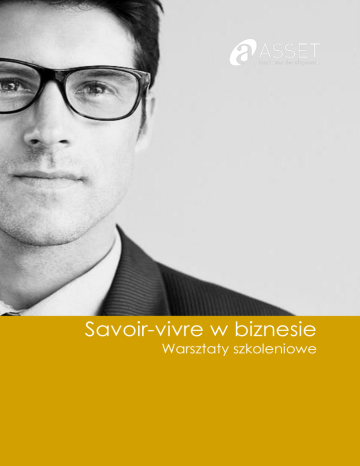 Management Martix® Nowoczesne zarządzanie zespołem Savoir-vivre w biznesie Warsztaty szkoleniowe ----------------------------------------------------------------------------------------------------------------------------------------Specjalistyczne szkolenia i konsultacje biznesowe ASSET Business Development Sp. z o.o. Warsaw Financial Center, ul. Emilii Plater 53, 00-113 Warszawa tel: (+48 22) 101 39 74 , [email protected], www.asset.pl Management Martix® Nowoczesne zarządzanie zespołem Savoir-vivre w biznesie. Warsztaty szkoleniowe Dlaczego warto opanować etykietę biznesu? - bo to się opłaca, bo tego biznes po prostu wymaga! bo nie popełnicie Państwo błędów, które mogą Was wiele kosztować, łącznie z utratą premii, możliwości dalszej kariery, dużej prowizji, czy nawet pracy. Zachowania zgodne z zasadami etykiety spowodują, że lepsze będą Wasze relacje z koleżankami i kolegami w pracy, z innymi pracownikami i, co ważne, z przełożonymi (co może się przełożyć na podwyżki i awanse). Badania przeprowadzone przez politechnikę w Darmstadcie wykazały w sposób jednoznaczny, że to właściwy styl i dobre maniery są czynnikiem decydującym o karierze. Wygląd zewnętrzny, zachowania oraz swoboda stanowią klucz do sukcesu. Korzyści Cenne wskazówki dotyczące profesjonalnego stroju oraz schludnego wyglądu Nauczysz się zasad prowadzenia korespondencji Nauczysz się jak postępować w każdej, nawet najtrudniejszej sytuacji towarzyskiej Poznasz zasady zachowania przy powitaniach, pożegnaniach i podczas rozmów biznesowych Kiedy należy wstać a kiedy możesz siedzieć Poznasz wszystkie elementy prawidłowego stroju w pracy Co robić aby niczym nie narazić się na śmieszność Co robić aby zawsze być pewnym siebie Materiały szkoleniowe Materiały dydaktyczne/podręcznik dokumentujące przekazaną wiedzę Testy i analizy własnych możliwości Imienny certyfikat ukończenia szkolenia Metody szkoleniowe Ćwiczenia indywidualne i zespołowe Elementy coachingu, Mindmapping Dyskusje i burze mózgów , studia przypadków Organizacja Czas trwania: 1 dzień Godzina: 09.30-16.30 Miejsce szkolenia: Warszawa. Centrum Koszt uczestnictwa: 500 PLN za osobę (+23% VAT) / 615 brutto od osoby Inwestycja zawiera: materiały szkoleniowe, obiad i przerwy kawowe (więcej informacji - patrz: warunki uczestnictwa) ----------------------------------------------------------------------------------------------------------------------------------------Specjalistyczne szkolenia i konsultacje biznesowe ASSET Business Development Sp. z o.o. Warsaw Financial Center, ul. Emilii Plater 53, 00-113 Warszawa tel: (+48 22) 101 39 74 , [email protected], www.asset.pl Management Martix® Nowoczesne zarządzanie zespołem Program szkolenia Wprowadzenie Określenie oczekiwań uczestników Zapoznanie uczestników z celami szkolenia Omówienie programu szkolenia i dydaktyki Komunikacja w biznesie Dobre maniery w rozmowach telefonicznych Elegancja korespondencji Etykieta słowa pisanego Bilety wizytowe i zaproszenia Zasady etykiety w korespondencji przez Internet Wizerunek biznesmena Jak prezentować siebie i swoją firmę Zasady ubioru w różnych sytuacjach biznesowych Elegancja zachowań werbalnych i niewerbalnych Wygląd zewnętrzny Prawidłowy dobór stroju i dodatków Podstawowe uchybienia w wyglądzie kobiety Podstawowe uchybienia w wyglądzie mężczyzny Znaczenie pozytywnego wizerunku Spójność mowy i zachowania Werbalne i niewerbalne sposoby zyskiwania przychylności Budowania sympatycznego klimatu rozmowy Siła pierwszego wrażenia w kontaktach zawodowych Co wpływa na dobre "pierwsze wrażenie" Zasady nawiązywania i podtrzymywania kontaktu Zachowanie w nieformalnych okolicznościach Kłanianie, odkłanianie i podawanie ręki Powitanie i przedstawienie klienta/kontrahenta/współpracownika Zasady pierwszeństwa i tytułowanie Etykieta na spotkaniach biznesowych Spotkania formalne i nieformalne Przyjęcia i imprezy okolicznościowe Dobór stroju względem okazji i pory dnia Dobre obyczaje przy stole Podsumowanie/Zakończenie ----------------------------------------------------------------------------------------------------------------------------------------Specjalistyczne szkolenia i konsultacje biznesowe ASSET Business Development Sp. z o.o. Warsaw Financial Center, ul. Emilii Plater 53, 00-113 Warszawa tel: (+48 22) 101 39 74 , [email protected], www.asset.pl Management Martix® Nowoczesne zarządzanie zespołem Prowadzący Tomek Franczak. Charyzmatyczny trener, niezwykle inspirujący coach biznesowy , specjalista w dziedzinie zarządzania zespołami handlowymi. Karierę zawodową rozpoczął na początku lat dziewięćdziesiątych zdobywając specjalistyczne doświadczenie w handlu produktami inwestycyjnymi poprzez zróżnicowane kanały dystrybucji oraz budując relacje z klientami ze sfer push i pull. Następnie po objęciu stanowiska Szefa działu Marketingu w koncernie SCHNEIDER ELECTRIC POLSKA przez kolejne lata zdobył bogate i unikalne doświadczenie w zarządzaniu projektami, wdrażaniem na rynek nowych produktów oraz organizacji ogólnopolskich i regionalnych akcji promocyjnych. Objęcie stanowiska Dyrektora Sprzedaży w prężnej firmie FMCG zajmującej się dystrybucją parafarmaceutyków na rynku masowym umożliwiło pogłębienie wiedzy dotyczącej funkcjonowania zespołów handlowych oraz narzędzi sprzedaży na tym najbardziej drapieżnym i dynamicznie rozwijającym się rynku co zaowocowało wieloma projektami z zakresu zarządzania sprzedażą i zespołem sprzedawców, negocjacji a także wykorzystania technik wywierania wpływu oraz skutecznej argumentacji. Posiada ponad 20 lat praktycznego doświadczenia zawodowego i prawie 400 osobiście realizowanych i nadzorowanych projektów doradczych, szkoleniowych i badawczych między innymi dla: AGORA, ALIOR BANK, AMBRA, BRE LEASING, CANAL+, CANON POLSKA , DELPHI, HOTEL BRISTOL, KOMATSU, NESTLE, PLAY/(P4), AMER SP