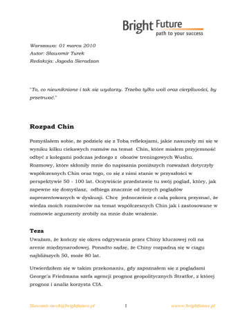 Warszawa: 01 marca 2010 Autor: Sławomir Turek Redakcja: Jagoda Sieradzan "To, co nieuniknione i tak się wydarzy. Trzeba tylko woli oraz cierpliwości, by przetrwać." Rozpad Chin Pomyślałem sobie, że podzielę się z Tobą refleksjami, jakie nasunęły mi się w wyniku kilku ciekawych rozmów na temat Chin, które miałem przyjemność odbyć z kolegami podczas jednego z obozów treningowych Wushu. Rozmowy, które skłoniły mnie do napisania poniższych rozważań dotyczyły współczesnych Chin oraz tego, co się z nimi stanie w przyszłości w perspektywie 50 - 100 lat. Oczywiście przedstawię tu swój pogląd, który, jak zapewne się domyślasz, odbiega znacznie od innych poglądów zaprezentowanych w dyskusji. Chcę jednocześnie z całą pokorą przyznać, że wiedza moich rozmówców na temat współczesnych Chin jak i zastosowane w rozmowie argumenty zrobiły na mnie duże wrażenie. Teza Uważam, że kończy się okres odgrywania przez Chiny kluczowej roli na arenie międzynarodowej. Ponadto sądzę, że Chiny rozpadną się w ciągu najbliższych 50, może 80 lat. Utwierdziłem się w takim przekonaniu, gdy zapoznałem się z poglądami George'a Friedmana szefa agencji prognoz geopolitycznych Stratfor, z której prognoz i analiz korzysta CIA. [email protected] 1 wwww.brightfuture.pl Argumenty Chiny są w naturalny sposób izolowane od świata (syberyjskie pustkowie, pustynie Azji Środkowej, Himalaje i Tybet, dżungle), co utrudnia im obecnie i będzie utrudniać w przyszłości odgrywanie specjalnej roli geopolitycznej. Poza tym ich gospodarka przegrzewa się i wkrótce już będzie tylko zwalniać. Rząd Chiński opiera się żądaniom USA, żeby umocnić juana obawiając się, że obniżyłoby to konkurencyjność chińskiej gospodarki. Bez mocnego juana będzie bardzo trudno utrzymać popyt wewnętrzny tego kraju na poziomie na tyle wysokim, żeby mógł on stanowić pewnego rodzaju bufor gospodarczy w przypadku załamania się eksportu. Nie można rządowi w Pekinie zarzucić, że nie stara się stymulować popytu wewnętrznego. Zwiększono administracyjnie liczbę świąt, zachęca się Chińczyków do podróżowania i wypoczywania podczas świąt. Moim skromnym zdaniem działania te są niewystarczające i konieczna jest zmiana polityki monetarnej. Mając 1 mld ludzi, którzy nie wykształcili w sobie potrzeb wyższego rzędu (biedni mieszkańcy wsi), trudno technikami „socjologicznymi” i działaniami administracyjnymi znacząco zwiększyć popyt wewnętrzny. Chiny kontynentalne reprezentujące ponad 90% chińskiego potencjału wzrostu gospodarczego i aż 97% ludności, choć już od dawna nie są ani komunistyczne ani ludowe, to także nie są w rozumieniu zachodnim państwem kapitalistycznym. Własność prywatna jest tam silnie ograniczona i nawet najskromniejszego biznesu nie da się prowadzić bez odpowiednich „znajomości”. Już od lat 70-tych XX wieku można mówić o powrocie do tradycyjnych, konfucjańskich metod sprawowania władzy. A ta władza wcale przedsiębiorczości typu kapitalistycznego nie lubi i raczej ją toleruje, niż wspiera. Zgodnie z etyką konfucjańską kariera urzędnika cieszy się w społeczeństwie dużo większą estymą, niż kariera przedsiębiorcy, czy inżyniera. Kiedy urzędnicy dojdą już do wniosku, że się dostatecznie [email protected] 2 wwww.brightfuture.pl wzbogacili na handlu, łapówkach i różnego rodzaju innych interesach uznają, że nie mają potrzeby dalszego utrzymywania kontaktu z “barbarzyńcami”. Stanie się to powodem konfliktu, który w końcu rozgorzeje pomiędzy chińskimi przedsiębiorcami i rosnącą w siłę klasą średnią, a konfucjańskim aparatem urzędniczym. Co do prognozowanej integracji Tajwanu z Chinami, sądzę, że gdy zmieni się władza na Tajwanie, zmieni się nastawienie do tej ryzykownej operacji. Proporcje pomiędzy poziomem życia Chin (zwłaszcza kontynentalnych) a Tajwanem są ogromne. Każdemu rozsądnie myślącemu politykowi czy ekonomiście przypomni się choćby przypadek RFN i NRD. Połączenie tych dwóch krajów do dziś odbija się czkawką zamożniejszemu RFN-owi. Łączenie takich enklaw zamożności jak Hongkong, Makao, Singapur , czy Tajwan z biednymi i przestarzałymi Chinami kontynentalnymi byłoby co najmniej mało rozsądne. Siła chińskiego świata finansów jest tak duża, że może przeciwstawić się aparatowi politycznemu. Według mnie raczej bogate wybrzeże będzie starało się coraz silniej separować od biednego kontynentu. Przecież jak masz motorówkę to nie przyczepisz do niej wielkiego kontenerowca, w dodatku niesterownego i przerdzewiałego. Taki kontenerowiec wcześniej czy później pociągnie cię na dno. Nie przemawia do mnie również pogląd o silnych trendach centralistycznych w Chinach. Jeśli te trendy byłyby tak mocne, to Hongkong nie zachowałby tak dużej odrębności, łącznie z utrzymywaniem swojej waluty. Poza tym, nawet jeśli mamy w pamięci wielkość “państwa środka”, fakt, że władza chińska musi co roku krwawo tłumić bodajże 1000 powstań chłopskich świadczy o silnych tendencjach odśrodkowych. A zatem: czy Chiny się rozpadną za 50-100 lat? A czy nasi rodzice uwierzyliby w 1950 roku, że rozpadnie się ZSRR? Zostawię na razie wątki geopolityczne na boku, aczkolwiek argumenty Friedmana dotyczące ponownego odegrania przez Japonię kluczowej roli w [email protected] 3 wwww.brightfuture.pl tym regionie są moim zdaniem przekonujące. Skoncentruję się na tym, co wynika z ekonomii i działania megatrendów, które powszechnie są uważane za siły sprawcze bardzo szybko zachodzących zmian na całym świecie. Jak wytłumaczyć wzrost gospodarczy w Chinach, gdy cały zachód przeżywa recesję? Główne źródła tego wzrostu to migracja ze wsi do miast, zapewniająca dużo taniej siły roboczej oraz gospodarka nie licząca się z kosztami degradacji środowiska. Oba te źródła „sukcesu” Chin 