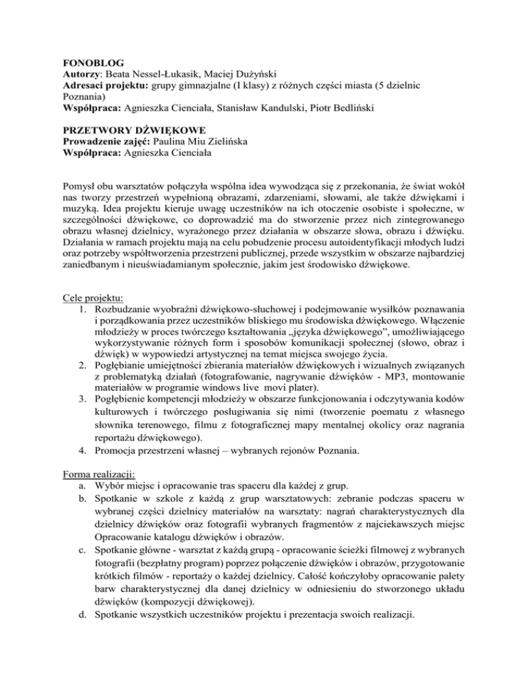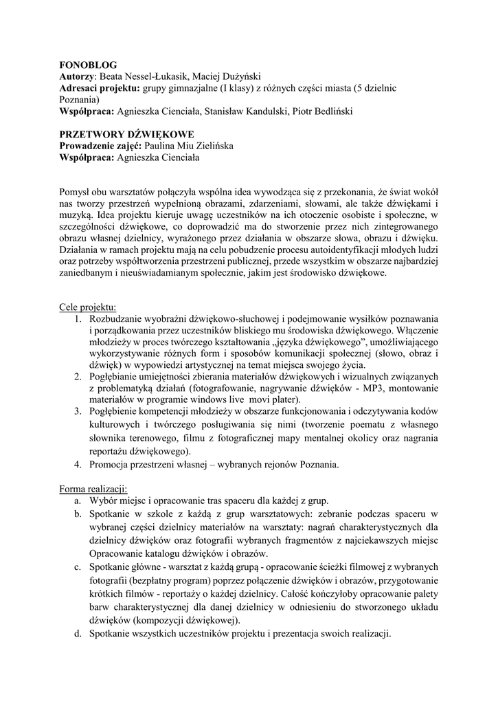 FONOBLOG Autorzy: Beata Nessel-Łukasik, Maciej Dużyński Adresaci projektu: grupy gimnazjalne (I klasy) z różnych części miasta (5 dzielnic Poznania) Współpraca: Agnieszka Cienciała, Stanisław Kandulski, Piotr Bedliński PRZETWORY DŹWIĘKOWE Prowadzenie zajęć: Paulina Miu Zielińska Współpraca: Agnieszka Cienciała Pomysł obu warsztatów połączyła wspólna idea wywodząca się z przekonania, że świat wokół nas tworzy przestrzeń wypełnioną obrazami, zdarzeniami, słowami, ale także dźwiękami i muzyką. Idea projektu kieruje uwagę uczestników na ich otoczenie osobiste i społeczne, w szczególności dźwiękowe, co doprowadzić ma do stworzenie przez nich zintegrowanego obrazu własnej dzielnicy, wyrażonego przez działania w obszarze słowa, obrazu i dźwięku. Działania w ramach projektu mają na celu pobudzenie procesu autoidentyfikacji młodych ludzi oraz potrzeby współtworzenia przestrzeni publicznej, przede wszystkim w obszarze najbardziej zaniedbanym i nieuświadamianym społecznie, jakim jest środowisko dźwiękowe. Cele projektu: 1. Rozbudzanie wyobraźni dźwiękowo-słuchowej i podejmowanie wysiłków poznawania i porządkowania przez uczestników bliskiego mu środowiska dźwiękowego. Włączenie młodzieży w proces twórczego kształtowania „języka dźwiękowego”, umożliwiającego wykorzystywanie różnych form i sposobów komunikacji społecznej (słowo, obraz i dźwięk) w wypowiedzi artystycznej na temat miejsca swojego życia. 2. Pogłębianie umiejętności zbierania materiałów dźwiękowych i wizualnych związanych z problematyką działań (fotografowanie, nagrywanie dźwięków - MP3, montowanie materiałów w programie windows live movi plater). 3. Pogłębienie kompetencji młodzieży w obszarze funkcjonowania i odczytywania kodów kulturowych i twórczego posługiwania się nimi (tworzenie poematu z własnego słownika terenowego, filmu z fotograficznej mapy mentalnej okolicy oraz nagrania reportażu dźwiękowego). 4. Promocja przestrzeni własnej – wybranych rejonów Poznania. Forma realizacji: a. Wybór miejsc i opracowanie tras spaceru dla każdej z grup. b. Spotkanie w szkole z każdą z grup warsztatowych: zebranie podczas spaceru w wybranej części dzielnicy materiałów na warsztaty: nagrań charakterystycznych dla dzielnicy dźwięków oraz fotografii wybranych fragmentów z najciekawszych miejsc Opracowanie katalogu dźwięków i obrazów. c. Spotkanie główne - warsztat z każdą grupą - opracowanie ścieżki filmowej z wybranych fotografii (bezpłatny program) poprzez połączenie dźwięków i obrazów, przygotowanie krótkich filmów - reportaży o każdej dzielnicy. Całość kończyłoby opracowanie palety barw charakterystycznej dla danej dzielnicy w odniesieniu do stworzonego układu dźwięków (kompozycji dźwiękowej). d. Spotkanie wszystkich uczestników projektu i prezentacja swoich realizacji. Krótki opis projektu: Fonoblog to propozycja warsztatów dla młodzieży w wieku 12-14 lat, którą interesuje posługiwanie się różnymi środkami komunikacji (słowem, obrazem i dźwiękiem). W ramach projektu odbędą się trzy spotkania z każdą z grup. Najpierw zostały zrealizowane spacery miejskie, czyli spotkania przygotowujące do udziału w warsztatach, podczas których uczestnicy zajęć zebrali niezbędne materiały do własnej pracy twórczej: poznali słowa związane z mapą okolicy, zebrali interesujące elementy pejzażu dźwiękowego, wykonali fotografie charakterystyczne dla wybranych miejsc. Następnie odbyły się główne warsztaty, które poprowadzili: animator, aktor i muzyk. Każda grupa klasowa zostanła podzielona na trzy zespoły, aby z zebranych materiałów można było stworzyć poemat, reportaż dźwiękowy oraz film o swojej dzielnicy. Efekty wszystkich warsztatów zostały zaprezentowane podczas jesiennego spotkania wszystkich uczestników zajęć w 2014 r. oraz na stronie internetowej. W roku 2015 w ramach warsztatów „Przetwory dźwiękowe” zostały stworzone kolejne projekty młodych twórców wspierających się zamieszczonym tu pakietem edukacyjnym. Opis warsztatów: Wstęp W ramach wprowadzenia uczestników w rytm pracy warsztatowej, każdy z uczestników zajęć otrzyma za zadanie przedstawienie siebie za pomocą materiału, który zdobył podczas spaceru miejskiego. Działanie właściwe Po wykonaniu przez wszystkich krótkich prezentacji prowadzący zajęcia spróbują z uczestnikami przekonać się, w jaki sposób trzy różne formy komunikacji mogą tworzyć przekaz o swoim najbliższym otoczeniu – własnej dzielnicy. W tym celu uczestnicy zajęć zostają podzieleni na trzy zespoły. Każda z grup otrzymuje inne zadanie do wykonania / inny materiał (słownik terenowy, fotografie, dźwięki). Zadaniem zespołu jest przygotowanie opowieści o swojej dzielnicy przy wykorzystaniu zebranych materiałów (poematu, filmu oraz reportażu dźwiękowego). Podsumowanie Po wykonaniu zadania w zespołach każda z grup prezentuje efekt swoje pracy, a prowadzący podsumowują zebrane doświadczenia podkreślając odmienność poszczególnych prac (brak translacji słowa na obraz czy obrazu na dźwięk). Na koniec uczestnicy zajęć zostają poproszeni o dopasowanie palety barw do stworzonego poemat, filmu oraz reportażu dźwiękowego w celu potwierdzenia lub zaprzeczenia tezy o odrębności poszczególnych form komunikacyjnych.