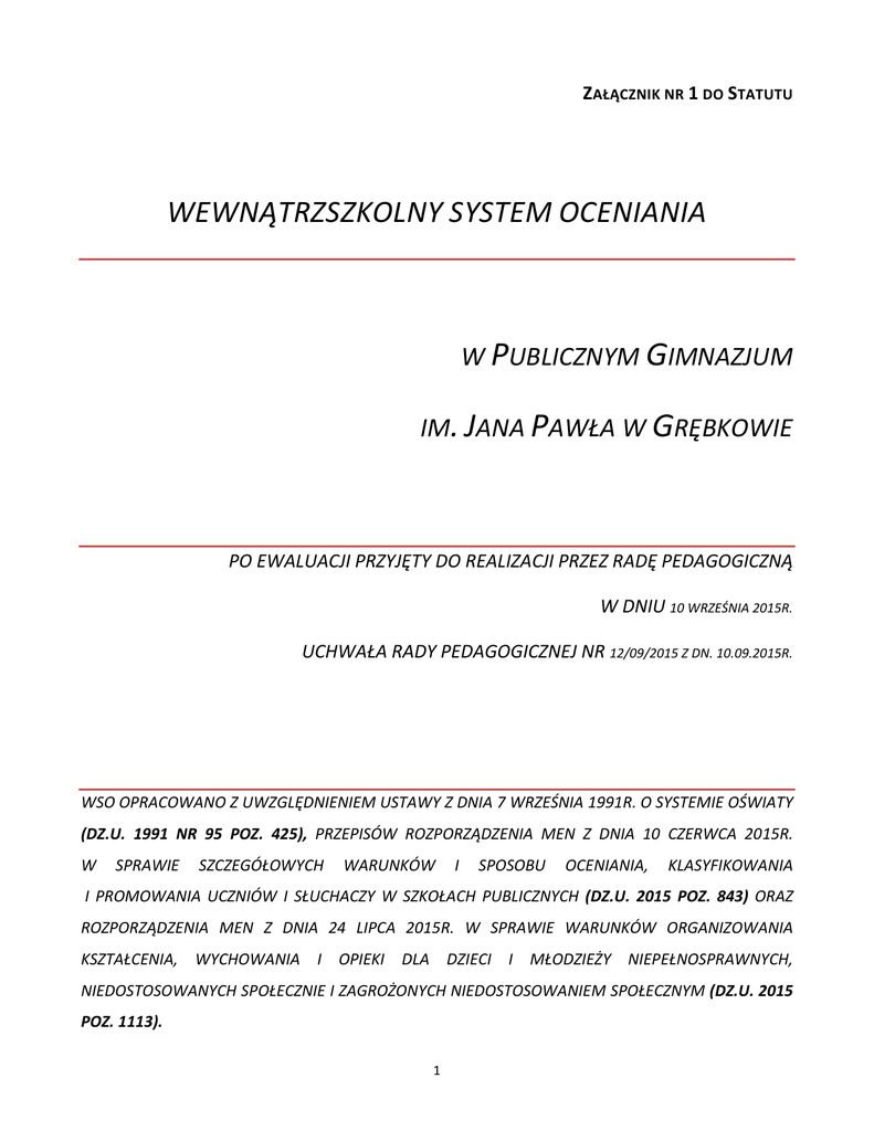 ZAŁĄCZNIK NR 1 DO STATUTU WEWNĄTRZSZKOLNY SYSTEM OCENIANIA W PUBLICZNYM GIMNAZJUM IM. JANA PAWŁA W GRĘBKOWIE PO EWALUACJI PRZYJĘTY DO REALIZACJI PRZEZ RADĘ PEDAGOGICZNĄ W DNIU 10 WRZEŚNIA 2015R. UCHWAŁA RADY PEDAGOGICZNEJ NR 12/09/2015 Z DN. 10.09.2015R. WSO OPRACOWANO Z UWZGLĘDNIENIEM USTAWY Z DNIA 7 WRZEŚNIA 1991R. O SYSTEMIE OŚWIATY (DZ.U. 1991 NR 95 POZ. 425), PRZEPISÓW ROZPORZĄDZENIA MEN Z DNIA 10 CZERWCA 2015R. W SPRAWIE SZCZEGÓŁOWYCH WARUNKÓW I SPOSOBU OCENIANIA, KLASYFIKOWANIA I PROMOWANIA UCZNIÓW I SŁUCHACZY W SZKOŁACH PUBLICZNYCH (DZ.U. 2015 POZ. 843) ORAZ ROZPORZĄDZENIA MEN Z DNIA 24 LIPCA 2015R. W SPRAWIE WARUNKÓW ORGANIZOWANIA KSZTAŁCENIA, WYCHOWANIA I OPIEKI DLA DZIECI I MŁODZIEŻY NIEPEŁNOSPRAWNYCH, NIEDOSTOSOWANYCH SPOŁECZNIE I ZAGROŻONYCH NIEDOSTOSOWANIEM SPOŁECZNYM (DZ.U. 2015 POZ. 1113). 1 ROZDZIAŁ I OGÓLNE ZASADY FUNKCJONOWANIA WSO §1 1. Wewnątrzszkolny System Oceniania, zwany dalej WSO, obowiązuje w Publicznym Gimnazjum im. Jana Pawła II w Grębkowie od dnia 10 września 2015r. 2. WSO stanowi załącznik do Statutu Publicznego Gimnazjum im. Jana Pawła II w Grębkowie. 3. WSO jest zgodny z Konwencją o Prawach Dziecka przyjętą przez Zgromadzenie Ogólne Narodów Zjednoczonych dnia 20 listopada 1989 roku (Dz. U. z dnia 23.12.91 r. nr 120, poz. 526 i 527) z Ustawą z dnia 7 września 1991r. o systemie oświaty (Dz.U. 1991 Nr 95 poz. 425), Rozporządzeniem Ministra Edukacji Narodowej z dnia 10 czerwca 2015r. w sprawie szczegółowych warunków i sposobu oceniania, klasyfikowania i promowania uczniów i słuchaczy w szkołach publicznych (Dz.U. 2015 poz. 843) oraz z Rozporządzeniem Ministra Edukacji narodowej z dnia 24 lipca 2015r. w sprawie warunków organizowania kształcenia, wychowania i opieki dla dzieci i młodzieży niepełnosprawnych, niedostosowanych społecznie i zagrożonych niedostosowaniem społecznym (Dz.U. 2015 poz. 1113), ze Statutem i Regulaminem Gimnazjum. 4. Integralną częścią WSO jest Przedmiotowy System Oceniania, zwany dalej PSO, określający szczegółowe wymagania dla wszystkich zajęć edukacyjnych w Gimnazjum, ale z wszystkich przedmiotów obowiązuje zasada: 0 – 29% ocena niedostateczna, 30% –49 % ocena dopuszczająca, 50% – 70% ocena dostateczna, 71% – 91 % ocena dobra, 92% – 99% ocena bardzo dobra, 100 %- ocena celująca. 5. Oceny są jawne zarówno dla ucznia jak i jego rodziców (prawnych opiekunów). 6. Ocenianie bieżące odbywa się systematycznie i planowo, uwzględnia różne formy aktywności ucznia. 7. Rodzice (prawni opiekunowie) są systematycznie informowani o postępach w nauce i zachowaniu dzieci według zasad określonych w rozdziale VII. 8. Przy ustalaniu oceny z wychowania fizycznego, zajęć technicznych, plastyki, muzyki i zajęć artystycznych należy przede wszystkim brać pod uwagę wysiłek wkładany przez ucznia w wywiązywanie się z obowiązków wynikających ze specyfiki tych zajęć, a w przypadku wychowania fizycznego – także systematyczność udziału ucznia w zajęciach oraz aktywność ucznia w działaniach podejmowanych przez szkołę na rzecz kultury fizycznej. 2 9. 10. Nauczyciel uzasadnia ustaloną ocenę uczniowi i jego rodzicom (prawnym opiekunom). Sprawdzone i ocenione pisemne prace kontrolne oraz inna dokumentacja dotycząca oceniania ucznia jest udostępniona uczniowi lub jego rodzicom (prawnym opiekunom) według zasad określonych w rozdziale VII. 11. Oceny z religii regulują odrębne przepisy. 12. Zasady przeprowadzania egzaminu gimnazjalnego określają odrębne przepisy. 3 ROZDZIAŁ II CELE I ZAKRES WSO §1 1. Wewnątrzszkolny System Oceniania ma na celu uczynienie z oceny szkolnej akceptowanego przez rodzica (prawnego opiekuna) i ucznia narzędzia kierowania rozwojem intelektualnym i psychicznym poprzez: A. Jasne i zrozumiałe dla ucznia formułowanie wymagań na poszczególne oceny szkolne. B. Informowanie ucznia o poziomie jego osiągnięć edukacyjnych i jego zachowaniu oraz o postępach w tym zakresie. C. Motywowanie ucznia do dalszych postępów w nauce i zachowaniu. D. Udzielanie uczniowi pomocy w nauce poprzez przekazanie uczniowi informacji o tym, co zrobił dobrze i jak powinien się dalej uczyć. E. Udzielanie wskazówek do samodzielnego planowania własnego rozwoju. F. Dostarczanie rodzicom (prawnym opiekunom) i nauczycielom informacji o postępach i trudnościach w nauce i zachowaniu oraz o szczególnych uzdolnieniach ucznia. G. Umożliwienie nauczycielom doskonalenia organizacji i metod pracy dydaktyczno - wychowawczej. §2 1. Ocenianie wewnątrzszkolne w Publicznym Gimnazjum im. Jana Pawła II w Grębkowie obejmuje: A. Formułowanie przez nauczycieli wymagań edukacyjnych niezbędnych do uzyskania poszczególnych śródrocznych i rocznych ocen klasyfikacyjnych z obowiązkowych i dodatkowych zajęć edukacyjnych, tzn.: • wymagań programowych określonych w podstawie programowej kształcenia ogólnego, • wymagań edukacyjnych wynikających z realizowanych w szkole programów nauczania- obowiązkowych oraz dodatkowych zajęć edukacyjnych. B. Ustalenie kryteriów oceniania zachowania. C. Bieżące ocenianie i ustalanie śródrocznych ocen klasyfikacyjnych z obowiązkowych i dodatkowych zajęć edukacyjnych oraz śródrocznej oceny klasyfikacyjnej zachowania wg skali podanej w rozdziale VIII §1 ust. 6 i 7. D. Przeprowadzanie egzaminów klasyfikacyjnych i poprawkowych. 4 E. Ustalanie warunków i trybu uzyskania wyższych niż przewidywane rocznych ocen klasyfikacyjnych z obowiązkowych i dodatkowych zajęć edukacyjnych oraz rocznej oceny klasyfikacyjnej zachowania. F. Ustalanie warunków i sposobu przekazywania rodzicom (prawnym opiekunom) informacji o postępach i trudnościach w nauce i zachowaniu ucznia oraz o szczególnych uzdolnieniach ucznia. G. Ustalanie rocznych ocen klasyfikacyjnych z obowiązkowych i dodatkowych zajęć edukacyjnych oraz rocznej oceny klasyfikacyjnej zachowania według skali podanej w rozdziale VIII