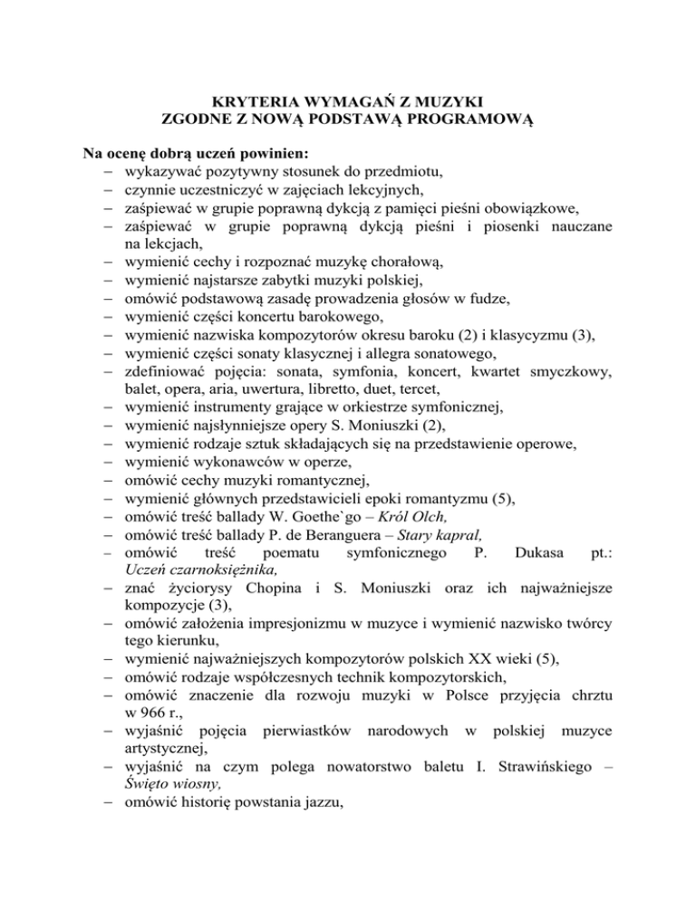 KRYTERIA WYMAGAŃ Z MUZYKI ZGODNE Z NOWĄ PODSTAWĄ PROGRAMOWĄ Na ocenę dobrą uczeń powinien: wykazywać pozytywny stosunek do przedmiotu, czynnie uczestniczyć w zajęciach lekcyjnych, zaśpiewać w grupie poprawną dykcją z pamięci pieśni obowiązkowe, zaśpiewać w grupie poprawną dykcją pieśni i piosenki nauczane na lekcjach, wymienić cechy i rozpoznać muzykę chorałową, wymienić najstarsze zabytki muzyki polskiej, omówić podstawową zasadę prowadzenia głosów w fudze, wymienić części koncertu barokowego, wymienić nazwiska kompozytorów okresu baroku (2) i klasycyzmu (3), wymienić części sonaty klasycznej i allegra sonatowego, zdefiniować pojęcia: sonata, symfonia, koncert, kwartet smyczkowy, balet, opera, aria, uwertura, libretto, duet, tercet, wymienić instrumenty grające w orkiestrze symfonicznej, wymienić najsłynniejsze opery S. Moniuszki (2), wymienić rodzaje sztuk składających się na przedstawienie operowe, wymienić wykonawców w operze, omówić cechy muzyki romantycznej, wymienić głównych przedstawicieli epoki romantyzmu (5), omówić treść ballady W. Goethe`go – Król Olch, omówić treść ballady P. de Beranguera – Stary kapral, omówić treść poematu symfonicznego P. Dukasa pt.: Uczeń czarnoksiężnika, znać życiorysy Chopina i S. Moniuszki oraz ich najważniejsze kompozycje (3), omówić założenia impresjonizmu w muzyce i wymienić nazwisko twórcy tego kierunku, wymienić najważniejszych kompozytorów polskich XX wieki (5), omówić rodzaje współczesnych technik kompozytorskich, omówić znaczenie dla rozwoju muzyki w Polsce przyjęcia chrztu w 966 r., wyjaśnić pojęcia pierwiastków narodowych w polskiej muzyce artystycznej, wyjaśnić na czym polega nowatorstwo baletu I. Strawińskiego – Święto wiosny, omówić historię powstania jazzu, wyjaśnić na czym polega improwizacja, omówić historię powstania muzyki rockowej. Na ocenę bardzo dobrą uczeń powinien ponadto: wyjaśnić cechy muzyki polifonicznej na podstawie słuchanego utworu Wacława z Szamotuł – Już się zmierzcha, wymienić stałe części mszy, zauważyć wejścia tematu w słuchanej Fudze c-moll moll. J. S. Bacha, wymienić formy muzyki baroku, wyjaśnić pojęcie muzyki homofonicznej, rozpoznać poszczególne części słuchanej uwertury Egmont – L. van Beethovena na przedstawionym schemacie rysunkowym, śledzić części słuchanych utworów na schematach graficznych, omówić związki muzyki z poezją na podstawie ballady F. Schuberta – Król olch, omówić związki treści wiersza z muzyką ballady S. Moniuszki – Stary kapral, omówić założenia romantycznych szkół narodowych i wymienić głównych przedstawicieli, omówić twórczość F. Chopina i S. Moniuszki, określić plany dźwiękowe a Arii na strunie G – z III suity orkiestrowej J. S. Bacha, zauważyć plany dźwiękowe poszczególnych grup instrumentów w standardzie jazzowym G. Millera – Moonlight serenade, rozpoznać następujące dzieła artystyczne: Anonim – Bogurodzica, Wincenty z Kielc – Gaude Mater Polonia, Wacław z Szamotuł – Już się zmierzcha, A. Vivaldi – Cztery pory roku – koncert E-dur nr 1 – Wiosna, L. van Beethoven – Uwertura Egmont, L. van Beethoven V symfonia c-moll op.67 cz.I – Allegro, S. Moniuszko – aria Stefana z opery Straszny Dwór, S. Moniuszko – aria Jotka z opery Halka, F. Schubert – Król olch, S. Moniuszko – Stary kapral, A. Borowin – Tańce połowieckie z opery Kniaź Igor, F. Chopin – Scherzo h-moll, W. Wieniawski – Legenda, śledząc schematy graficzne zauważyć wejścia poszczególnych części następujących utworów: E. Grieg – Koncert fortepianowy a-moll cz. I, W. A. Mozart – Symfonia g-moll KV 550 cz. I – Allegro, H. Wieniawski – Polonez koncertowy D- dur op. 9, F. Chopin – II koncert fortepianowy e-moll op. 11 cz. I, Na ocenę celującą uczeń powinien umieć ponadto: rozróżniać cechy muzyki różnych epok, wartościować i oceniać słuchaną muzykę, uczestniczyć w koncertach muzycznych (lub wysłuchać) i przedstawić przynajmniej jedną recenzje koncertu w semestrze, systematyzować i integrować posiadaną wiedzę, umieć konstruować zadania, wykonać przynajmniej jedną pracę w semestrze dotyczącą zagadnień muzycznych. Na ocenę dostateczną uczeń powinien: wykazywać pozytywny stosunek do przedmiotu, uczestniczyć w zajęciach lekcyjnych, zaśpiewać w grupie poprawną dykcją z pamięci pieśni obowiązkowe, zaśpiewać w grupie poprawną dykcją pieśni i piosenki nauczane na lekcjach, wymienić cechy i rozpoznać muzykę chorałową, wymienić najstarsze zabytki muzyki polskiej, omówić podstawową zasadę prowadzenia głosów w fudze, wymienić nazwiska kompozytorów okresu baroku (2) i klasycyzmu (2), zdefiniować pojęcia: symfonia, koncert, kwartet smyczkowy, balet, opera, aria, duet, tercet, wymienić instrumenty grające w orkiestrze symfonicznej, wymienić najsłynniejsze opery S. Moniuszki (2), omówić cechy muzyki romantycznej, wymienić głównych przedstawicieli epoki romantyzmu (3), omówić treść ballady W. Goethe`go – Król Olch lub P. de Beranguera – Stary kapral, znać życiorysy Chopina i S. Moniuszki oraz ich najważniejsze kompozycje (2), wymienić najważniejszych kompozytorów polskich XX wieki (3), omówić znaczenie dla rozwoju muzyki w Polsce przyjęcia chrztu w 966 r., wyjaśnić pojęcia pierwiastków narodowych artystycznej, omówić historię powstania jazzu, wyjaśnić na czym polega improwizacja, omówić historię powstania muzyki rockowej. w polskiej muzyce Na ocenę dopuszczającą uczeń powinien: wykazywać pozytywny stosunek do przedmiotu, uczestniczyć w zajęciach lekcyjnych, zaśpiewać w grupie z pamięci pieśni obowiązkowe, zaśpiewać w grupie pieśni i piosenki nauczane na lekcjach, wymienić cechy i rozpoznać muzykę chorałową, wymienić najstarsze zabytki muzyki polskiej, omówić podstawową zasadę