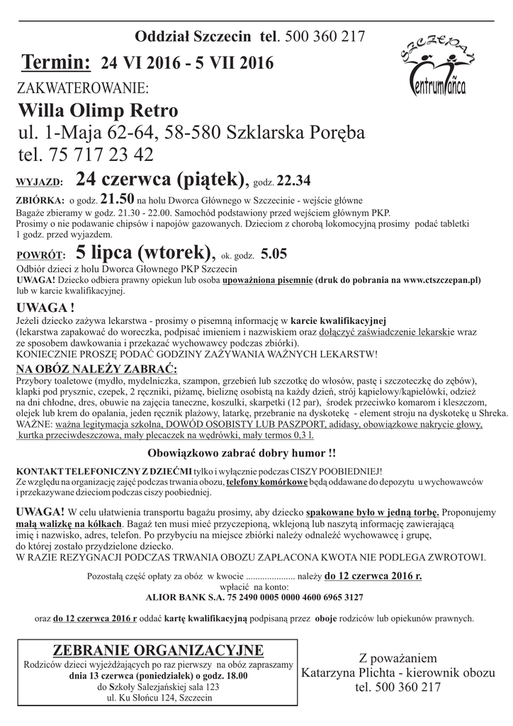 Oddział Szczecin tel. 500 360 217 Termin: 24 VI 2016 - 5 VII 2016 ZAKWATEROWANIE: Willa Olimp Retro ul. 1-Maja 62-64, 58-580 Szklarska Poręba tel. 75 717 23 42 WYJAZD: 24 czerwca (piątek), godz. 22.34 ZBIÓRKA: o godz. 21.50 na holu Dworca Głównego w Szczecinie - wejście główne Bagaże zbieramy w godz. 21.30 - 22.00. Samochód podstawiony przed wejściem głównym PKP. Prosimy o nie podawanie chipsów i napojów gazowanych. Dzieciom z chorobą lokomocyjną prosimy podać tabletki 1 godz. przed wyjazdem. 5 lipca (wtorek), POWRÓT: ok. godz. Odbiór dzieci z holu Dworca Głownego PKP Szczecin 5.05 UWAGA! Dziecko odbiera prawny opiekun lub osoba upoważniona pisemnie (druk do pobrania na www.ctszczepan.pl) lub w karcie kwalifikacyjnej. UWAGA ! Jeżeli dziecko zażywa lekarstwa - prosimy o pisemną informację w karcie kwalifikacyjnej (lekarstwa zapakować do woreczka, podpisać imieniem i nazwiskiem oraz dołączyć zaświadczenie lekarskie wraz ze sposobem dawkowania i przekazać wychowawcy podczas zbiórki). KONIECZNIE PROSZĘ PODAĆ GODZINY ZAŻYWANIA WAŻNYCH LEKARSTW! NA OBÓZ NALEŻY ZABRAĆ: Przybory toaletowe (mydło, mydelniczka, szampon, grzebień lub szczotkę do włosów, pastę i szczoteczkę do zębów), klapki pod prysznic, czepek, 2 ręczniki, piżamę, bieliznę osobistą na każdy dzień, strój kąpielowy/kąpielówki, odzież na dni chłodne, dres, obuwie na zajęcia taneczne, koszulki, skarpetki (12 par), środek przeciwko komarom i kleszczom, olejek lub krem do opalania, jeden ręcznik plażowy, latarkę, przebranie na dyskotekę - element stroju na dyskotekę u Shreka. WAŻNE: ważna legitymacja szkolna, DOWÓD OSOBISTY LUB PASZPORT, adidasy, obowiązkowe nakrycie głowy, kurtka przeciwdeszczowa, mały plecaczek na wędrówki, mały termos 0,3 l. Obowiązkowo zabrać dobry humor !! KONTAKT TELEFONICZNY Z DZIEĆMI tylko i wyłącznie podczas CISZY POOBIEDNIEJ! Ze względu na organizację zajęć podczas trwania obozu, telefony komórkowe będą oddawane do depozytu u wychowawców i przekazywane dzieciom podczas ciszy poobiedniej. UWAGA! W celu ułatwienia transportu bagażu prosimy, aby dziecko spakowane było w jedną torbę. Proponujemy małą walizkę na kółkach. Bagaż ten musi mieć przyczepioną, wklejoną lub naszytą informację zawierającą imię i nazwisko, adres, telefon. Po przybyciu na miejsce zbiórki należy odnaleźć wychowawcę i grupę, do której zostało przydzielone dziecko. W RAZIE REZYGNACJI PODCZAS TRWANIA OBOZU ZAPŁACONA KWOTA NIE PODLEGA ZWROTOWI. Pozostałą część opłaty za obóz w kwocie ..................... należy do 12 czerwca 2016 r. wpłacić na konto: ALIOR BANK S.A. 75 2490 0005 0000 4600 6965 3127 oraz do 12 czerwca 2016 r oddać kartę kwalifikacyjną podpisaną przez oboje rodziców lub opiekunów prawnych. ZEBRANIE ORGANIZACYJNE Rodziców dzieci wyjeżdżających po raz pierwszy na obóz zapraszamy dnia 13 czerwca (poniedziałek) o godz. 18.00 do Szkoły Salezjańskiej sala 123 ul. Ku Słońcu 124, Szczecin Z poważaniem Katarzyna Plichta - kierownik obozu tel. 500 360 217