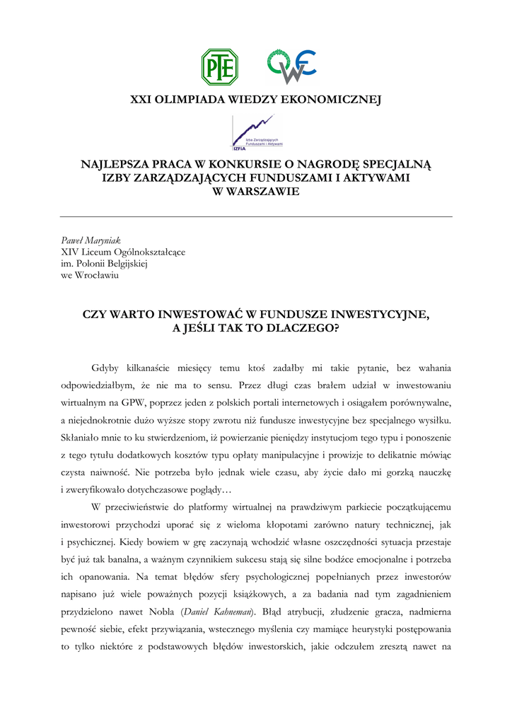 XXI OLIMPIADA WIEDZY EKONOMICZNEJ NAJLEPSZA PRACA W KONKURSIE O NAGRODĘ SPECJALNĄ IZBY ZARZĄDZAJĄCYCH FUNDUSZAMI I AKTYWAMI W WARSZAWIE Paweł Maryniak XIV Liceum Ogólnokształcące im. Polonii Belgijskiej we Wrocławiu CZY WARTO INWESTOWAĆ W FUNDUSZE INWESTYCYJNE, A JEŚLI TAK TO DLACZEGO? Gdyby kilkanaście miesięcy temu ktoś zadałby mi takie pytanie, bez wahania odpowiedziałbym, Ŝe nie ma to sensu. Przez długi czas brałem udział w inwestowaniu wirtualnym na GPW, poprzez jeden z polskich portali internetowych i osiągałem porównywalne, a niejednokrotnie duŜo wyŜsze stopy zwrotu niŜ fundusze inwestycyjne bez specjalnego wysiłku. Skłaniało mnie to ku stwierdzeniom, iŜ powierzanie pieniędzy instytucjom tego typu i ponoszenie z tego tytułu dodatkowych kosztów typu opłaty manipulacyjne i prowizje to delikatnie mówiąc czysta naiwność. Nie potrzeba było jednak wiele czasu, aby Ŝycie dało mi gorzką nauczkę i zweryfikowało dotychczasowe poglądy… W przeciwieństwie do platformy wirtualnej na prawdziwym parkiecie początkującemu inwestorowi przychodzi uporać się z wieloma kłopotami zarówno natury technicznej, jak i psychicznej. Kiedy bowiem w grę zaczynają wchodzić własne oszczędności sytuacja przestaje być juŜ tak banalna, a waŜnym czynnikiem sukcesu stają się silne bodźce emocjonalne i potrzeba ich opanowania. Na temat błędów sfery psychologicznej popełnianych przez inwestorów napisano juŜ wiele powaŜnych pozycji ksiąŜkowych, a za badania nad tym zagadnieniem przydzielono nawet Nobla (Daniel Kahneman). Błąd atrybucji, złudzenie gracza, nadmierna pewność siebie, efekt przywiązania, wstecznego myślenia czy mamiące heurystyki postępowania to tylko niektóre z podstawowych błędów inwestorskich, jakie odczułem zresztą nawet na własnej skórze. Jak to dobrze ujął znany publicysta Tadeusz Mosz: „Jesteś swoim największym wrogiem”. Nie mówiąc juŜ o tym, Ŝe gdy na rynku panuje hossa zyski moŜe wykorzystywać kaŜdy, gdy sytuacja się pogarsza, a na rynek wkracza niepewność „pod znakiem byka” pozostają jedynie najlepsi. Dopiero wtedy na wierzch wychodzi brak umiejętności i wiedzy z zakresu analizy fundamentalnej czy teŜ technicznej. Nie bez znaczenia są równieŜ ograniczenia zasobów, trudno bowiem posiadając kilka tysięcy złotych w sposób rentowny obracać portfelem, gdy cenne procenty zŜerają nam prowizje. Nie wspominam juŜ nawet o podstawowej dla inwestycji zasadzie dywersyfikacji. Jak bowiem rozdzielić powiedzmy 3 tysiące zł na 10 walorów, tak Ŝeby nie zostać poŜartym przez prowizję? Przychodzi mi do głowy jedynie jedna sensowna odpowiedź – nie da się! Wydawałoby się, Ŝe mój dotychczasowy wywód nie ma związku z funduszami inwestycyjnymi. OtóŜ są to rzeczy jak najbardziej powiązane. Instytucją taką bowiem dowodzą profesjonaliści. Oczywiście są oni w duŜej mierze naraŜeni na te same pułapki co zwykły człowiek, jednak ich doświadczenie, wiedza i umiejętności pozwalają znacząco ograniczyć te defekty ludzkiego umysłu. Dlatego teŜ pomimo, Ŝe korzystanie z funduszu jest kosztowne, a ograniczenia związane z działaniem tak duŜych instytucji uniemoŜliwiają im uzyskiwania zysków znacząco ponad normę (choć nie zawsze), warto jednak skorzystać z ich oferty. Trzeba to jednak czynić z głową, jednak nie mniej ostroŜnie niŜ w wypadku bezpośrednich transakcji na rynkach kapitałowych, gdyŜ fundusz moŜe przynieść równieŜ stratę, której wynikiem będzie uszczerbek w posiadanym przez nas kapitale. Rynek funduszy inwestycyjnych oferuje wiele róŜnorodnych form inwestowania, od tych o minimalnym ryzyku (fundusze rynku pienięŜnego) do tych o wysokim ryzyku i duŜej zmienności (fundusze akcji). Istotnym elementem rynku tych instytucji są równieŜ fundusze typu hedge, których celem jest osiąganie zysków bez względu na stan giełdy, a takŜe wiele innych lokujących swe środki w nieruchomości, surowce i inne inwestycje alternatywne. Jak wykazały badania empiryczne na rynkach finansowych obowiązuje tzw. prawo regresji do średniej. Oznacza to, Ŝe fundusz osiągający ponadprzeciętne zyski wcześniej czy później zapewne powróci do stopy zwrotu charakterystycznej dla wykazywanej przez instrument bazowy (np. indeks giełdowy). Choć istnieją inwestorzy jak np. Warren Buffet, którzy sukcesywnie przebijają rynkowe stopy zwrotu to są to postacie wyjątkowe i sam fakt ich pojawienia się na rynku wywołuje u inwestorów „hurraoptymizm”, który nasila wzrost ich wyników. Badania przeprowadzone przez Marka Hulberta dowiodły, Ŝe fundusze, które w krótkim okresie czasu (około roku) osiągały ponadprzeciętne zyski, w perspektywie długookresowej spisywały się znacząco poniŜej średniej. Warto zatem przy wyborze funduszu kierować się nie danymi z ostatnich okresów, a długookresową stopą zwrotu, która świadczy o stabilności i kompetencjach kadry zarządzającej. Fundusz inwestycyjny nie powinien być równieŜ traktowany jako inwestycja krótkookresowa. Jak wynika z danych publikowanych w magazynie Forbes prawdopodobieństwo poniesienia realnych strat w horyzoncie rocznym wynosi ok. 25 % dla funduszu akcyjnego (straty mogą wynieść nawet grubo ponad 30 %), a 20 % dla funduszu zrównowaŜonego i obligacji (ze względu na duŜy udział obligacji o stałym oprocentowaniu w portfelu). Dla okresu 3-letniego prawdopodobieństwo to jest nieco mniejsze, a za optymalny czas inwestycji moŜna uznać 5 lat, który powinien zapewnić co najmniej zwrot zainwestowanego kapitału, choć oczywiście nie ma 100 % pewności. Przy obecnym stanie gospodarki trzeba by być ślepym, aby nie zauwaŜyć, Ŝe giełda nie jest bezpiecznym źródłem dochodu. Dopóki sytuacja się nie ustabilizuje lepiej ograniczyć inwestycje w ten segment, gdyŜ zgodnie z wspomnianą zasadą regresji do średniej nawet najlepiej zarządzany fundusz nie będz