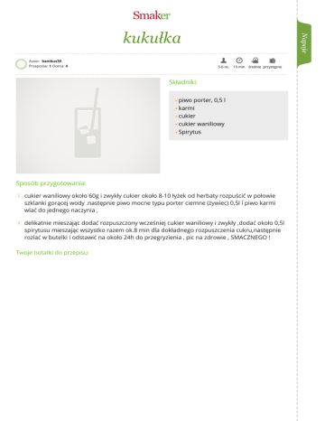 kukułka Autor: bambus30 Przepisów: 1 Ocena: 4 5-6 os. 15 min średnie przystępne Składniki: piwo porter, 0,5 l karmi cukier cukier waniliowy Spirytus Sposób przygotowania: 1 cukier waniliowy około 60g i zwykły cukier około 8-10 łyżek od herbaty rozpuścić w połowie szklanki gorącej wody .następnie piwo mocne typu porter ciemne (żywiec) 0,5l i piwo karmi wlać do jednego naczynia , 2 delikatnie mieszając dodać rozpuszczony wcześniej cukier waniliowy i zwykły ,dodać około 0,5l spirytusu mieszając wszystko razem ok.8 min dla dokładnego rozpuszczenia cukru,następnie rozlać w butelki i odstawić na około 24h do przegryzienia , pic na zdrowie , SMACZNEGO ! Twoje notatki do przepisu: