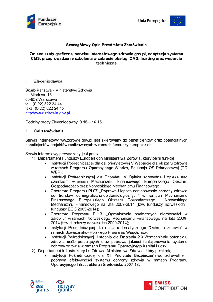 Szczegółowy Opis Przedmiotu Zamówienia Zmiana szaty graficznej serwisu internetowego zdrowie gov.pl, adaptacja systemu CMS, przeprowadzenie szkolenia w zakresie obsługi CMS, hosting oraz wsparcie techniczne I. Zleceniodawca: Skarb Państwa - Ministerstwo Zdrowia ul. Miodowa 15 00-952 Warszawa tel.: (0-22) 522 24 44 faks: (0-22) 522 24 45 http://www.zdrowie.gov.pl Godziny pracy Zleceniodawcy: 8.15 – 16.15 II. Cel zamówienia Serwis internetowy ww.zdrowie.gov.pl jest skierowany do beneficjentów oraz potencjalnych beneficjentów projektów realizowanych w ramach funduszy europejskich. Serwis internetowy prowadzony jest przez: 1) Departament Funduszy Europejskich Ministerstwa Zdrowia, który pełni funkcję: Instytucji Pośredniczącej dla osi priorytetowej V Wsparcie dla obszaru zdrowia w ramach Programu Operacyjnego Wiedza, Edukacja OŚ Priorytetowej (PO WER); Instytucji Pośredniczącej dla Priorytetu V Opieka zdrowotna i opieka nad dzieckiem w ramach Mechanizmu Finansowego Europejskiego Obszaru Gospodarczego oraz Norweskiego Mechanizmu Finansowego; Operatora Programu PL07 ,,Poprawa i lepsze dostosowanie ochrony zdrowia do trendów demograficzno-epidemiologicznych” w ramach Mechanizmu Finansowego Europejskiego Obszaru Gospodarczego i Norweskiego Mechanizmu Finansowego na lata 2009-2014 (tzw. funduszy norweskich i funduszy EOG 2009-2014); Operatora Programu PL13 ,,Ograniczanie społecznych nierówności w zdrowiu” w ramach Norweskiego Mechanizmu Finansowego na lata 20092014 (tzw. funduszy norweskich 2009-2014); Instytucji Pośredniczącej dla obszaru tematycznego “Ochrona zdrowia” w ramach Szwajcarsko- Polskiego Programu Współpracy; Instytucji Pośredniczącej II stopnia dla Działania 2.3 Wzmocnienie potencjału zdrowia osób pracujących oraz poprawa jakości funkcjonowania systemu ochrony zdrowia w ramach Programu Operacyjnego Kapitał Ludzki. 2) Departament Infrastruktury i e-Zdrowia Ministerstwa Zdrowia, który pełni rolę: Instytucji Pośredniczącej dla XII Priorytetu Bezpieczeństwo zdrowotne i poprawa efektywności systemu ochrony zdrowia w ramach Programu Operacyjnego Infrastruktura i Środowisko 2007-13; III. Instytucji Pośredniczącej dla Osi priorytetowej IX Wzmocnienie strategicznej infrastruktury ochrony zdrowia w ramach Programu Operacyjnego Infrastruktura i Środowisko 2014-2020. Podstawy prawne Serwis www.zdrowie.gov.pl musi być zgodny z następującymi przepisami prawnymi i wytycznymi: 1) Ustawą z dnia 17 lutego 2005 r. o informatyzacji działalności podmiotów realizujących zadania publiczne (Dz.U. 2013 poz. 235 z późn. zm.) wraz z aktami wykonawczymi; 2) Ustawą z dnia 18 lipca 2002 r. o świadczeniu usług drogą elektroniczną (Dz.U. 2013 poz. 1422) wraz z aktami wykonawczymi; 3) Ustawą z dnia 29 sierpnia 1997 r. o ochronie danych osobowych (Dz.U. 2014 poz. 1182 z późn. zm.); 4) Rozporządzeniem Rady Ministrów z dnia 12 kwietnia 2012 r. w sprawie Krajowych Ram Interoperacyjności, minimalnych wymagań dla rejestrów publicznych i wymiany informacji w postaci elektronicznej oraz minimalnych wymagań dla systemów teleinformatycznych (Dz.U. 2012 poz. 526); 5) Standardami W3C; w zakresie określonym w § 16 ust. 2 pkt 2 Rozporządzenia Rady Ministrów z dnia 12 kwietnia 2012 r. w sprawie Krajowych Ram Interoperacyjności, minimalnych wymagań dla rejestrów publicznych i wymiany informacji w postaci elektronicznej oraz minimalnych wymagań dla systemów teleinformatycznych (Dz.U. 2012 poz. 526) 6) Standardami WCAG 2.0, w zakresie określonym w § 19 Rozporządzenia Rady Ministrów z dnia 12 kwietnia 2012 r. w sprawie Krajowych Ram Interoperacyjności, minimalnych wymagań dla rejestrów publicznych i wymiany informacji w postaci elektronicznej oraz minimalnych wymagań dla systemów teleinformatycznych (Dz.U. 2012 poz. 526). IV. Przedmiot zamówienia Przedmiotem zamówienia jest zmiana szaty graficznej istniejącego serwisu internetowego www.zdrowie.gov.pl., w oparciu o szablon graficzny (załącznik nr 1 do SOPZ) opracowany przez Ministerstwo Infrastruktury i Rozwoju, który zostanie przystosowany do potrzeb serwisu www.zdrowie.gov.pl. Zgodnie z rekomendacjami Ministerstwa Infrastruktury i Rozwoju strona Instytucji Pośredniczącej powinna stanowić spójny element systemu stron internetowych Funduszy Europejskich w Polsce na lata 2014-2020. Serwis www.zdrowie.gov.pl powinien mieć podobną strukturę i wygląd do stron Portalu Funduszy Europejskich, który jest dostępny pod adresem www.funduszeeuropejskie.gov.pl. Całość powinna stanowić jednolity system. Zamówienie obejmuje: 1. Przystosowanie do potrzeb serwisu www.zdrowie.gov.pl szablonu graficznego, opracowanego przez Ministerstwo Infrastruktury i Rozwoju; 2. Adaptacja istniejącego systemu zarządzania treścią S@M CMS do potrzeb nowej szaty graficznej serwisu www.zdrowie.gov.pl; 3. Przeprowadzenie szkolenia w zakresie obsługi CMS w tym modułów i funkcjonalności, które zostały wdrożone i wykorzystane przy tworzeniu serwisu www.zdrowie.gov.pl dla 4 pracowników Zleceniodawcy; 4. Usługę hostingową od dnia 1.01.2016 r. do dnia 31.12.2018 r. 5. Usługę wsparcia technicznego od dnia zawarcia umowy do dnia 31.12.2018 r. 2 Projekt współfinansowany przez Unię Europejską w ramach Europejskiego Funduszu Społecznego oraz Funduszu Spójności, przez Szwajcarię w ramach Szwajcarsko – Polskiego Programu Współpracy, przez Norwegię, Islandię i Liechtenstein ze środków Mechanizmu Finansowego EOG i Norweskiego Mechanizmu Finansowego oraz budżet państwa. V. WYMAGANIA TECHNOLOGICZNE Serwis internetowy zostanie przygotowany w oparciu o otwarte standardy W3C: np. HTML 5 i CSS 3. Serwis internetowy ma być dostępny dla osób z niepełnosprawnościami (WCAG 2.0). Ponadto musi być zgodna z wymogami polskiego prawa (punkt III niniejszego dokumentu). V.1. Responsive Web Design (RWD) i breakpointy Serwis musi być zaprojektowany przy wykorzystaniu zasad Responsive Web Design (RW