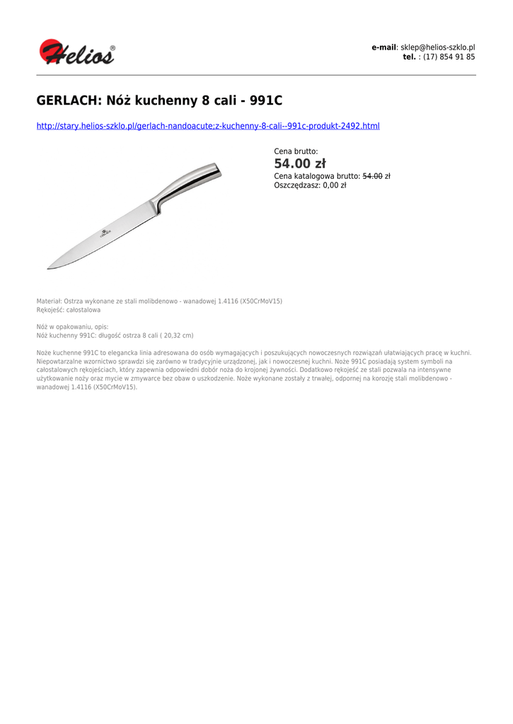 e-mail: [email protected] tel. : (17) 854 91 85 GERLACH: Nóż kuchenny 8 cali - 991C http://stary.helios-szklo.pl/gerlach-nandoacute;z-kuchenny-8-cali--991c-produkt-2492.html Cena brutto: 54.00 zł Cena katalogowa brutto: 54.00 zł Oszczędzasz: 0,00 zł Materiał: Ostrza wykonane ze stali molibdenowo - wanadowej 1.4116 (X50CrMoV15) Rękojeść: całostalowa Nóż w opakowaniu, opis: Nóż kuchenny 991C: długość ostrza 8 cali ( 20,32 cm) Noże kuchenne 991C to elegancka linia adresowana do osób wymagających i poszukujących nowoczesnych rozwiązań ułatwiających pracę w kuchni. Niepowtarzalne wzornictwo sprawdzi się zarówno w tradycyjnie urządzonej, jak i nowoczesnej kuchni. Noże 991C posiadają system symboli na całostalowych rękojeściach, który zapewnia odpowiedni dobór noża do krojonej żywności. Dodatkowo rękojeść ze stali pozwala na intensywne użytkowanie noży oraz mycie w zmywarce bez obaw o uszkodzenie. Noże wykonane zostały z trwałej, odpornej na korozję stali molibdenowo wanadowej 1.4116 (X50CrMoV15).