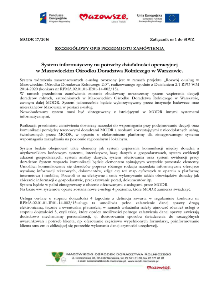 MODR 17/2016 Załącznik nr 1 do SIWZ SZCZEGÓŁOWY OPIS PRZEDMIOTU ZAMÓWIENIA System informatyczny na potrzeby działalności operacyjnej w Mazowieckim Ośrodku Doradztwa Rolniczego w Warszawie. System wdrożenia zaawansowanych e-usług tworzony jest w ramach projektu „Rozwój e-usług w Mazowieckim Ośrodku Doradztwa Rolniczego 2.0”, realizowanego zgodnie z Działaniem 2.1 RPO WM 2014-2020 (konkurs nr RPMA.02.01.01-IP.01-14-002/15). W ramach przedmiotu zamówienia zostanie zbudowany nowoczesny system wspierania decyzji doradców rolnych, zatrudnionych w Mazowieckim Ośrodku Doradztwa Rolniczego w Warszawie, zwanym dalej MODR. System jednocześnie będzie wykorzystywany przez instytucje badawcze oraz mieszkańców Mazowsza w postaci e-usług. Nowobudowany system musi być zintegrowany z istniejącymi w MODR innymi systemami informatycznymi. Realizacja przedmiotu zamówienia dostarczy narzędzi do wspomagania przy podejmowaniu decyzji oraz komunikacji pomiędzy terenowymi doradcami MODR a osobami korzystającymi z nieodpłatnych usług, świadczonych przez MODR, w oparciu o elektroniczne platformy dla zintegrowanego systemu wspomagania zarządzania na poziomie regionalnym i lokalnym. System będzie obejmował takie elementy jak system wspierania komunikacji między doradcą a użytkownikiem końcowym systemu, interaktywną bazę danych o gospodarstwach, system ewidencji zdarzeń gospodarczych, system analizy danych, system ofertowania oraz system ewidencji pracy doradców. System wsparcia komunikacji będzie elementem spinającym wszystkie pozostałe elementy. Umożliwi komunikowanie się doradców poprzez różnego rodzaju narzędzia informatyczne oferujące wymianę informacji tekstowych, dokumentów, zdjęć czy też map cyfrowych w oparciu o platformę internetową i mobilną. Pozwoli to na efektywne i tanie wykonywanie takich obowiązków doradcy jak zbieranie informacji o gospodarstwie, przekazywanie porad, dokumentów itp. System będzie w pełni zintegrowany z obecnie oferowanymi e-usługami przez MODR. Na bazie ww. systemów oparte zostaną nowe e-usługi 4 poziomu, które MODR zamierza świadczyć. Usługa on-line o stopniu dojrzałości 4 (zgodnie z definicją zawartą w regulaminie konkursu nr RPMA.02.01.01-IP.01-14-002/15usługa ta umożliwia pełne załatwienie danej sprawy drogą elektroniczną, łącznie z ewentualną płatnością; w ramach wskaźnika należy ujmować również usługi o stopniu dojrzałości 5, czyli takie, które oprócz możliwości pełnego załatwienia danej sprawy zawierają dodatkowo mechanizmy personalizacji, tj. dostosowania sposobu świadczenia do szczególnych uwarunkowań i potrzeb klienta, np. oferowanie częściowo wypełnionych formularzy, poinformowanie klienta sms-em o zbliżającej się potrzebie wykonania danej czynności urzędowej). 1. Ogólne właściwości systemu 1.1 Skalowalność System nie może posiadać ograniczeń w zakresie liczby aktywnych użytkowników z niego korzystających oraz jest przystosowany do wzrostu liczby użytkowników i rozmiaru przechowywanych danych. System ma być otwarty na rozbudowę, modyfikację oraz integrację z zewnętrznymi systemami. 1.2 Bezpieczeństwo System musi zapewnić bezpieczeństwo danych poprzez autoryzowany dostęp do funkcjonalności oraz do danych, musi także przechowywać hasła użytkowników w postaci zaszyfrowanej, a także umożliwiać automatyczne tworzenie kopii bezpieczeństwa wszystkich danych – możliwość składowania tych kopii na oddzielnym serwerze. Bezpieczeństwo musi być także zorganizowane na poziomie aplikacji – dostęp do Systemu możliwy jest jedynie po poprawnej autoryzacji użytkownika. 1.3 Graficzny interfejs Graficzny interfejs użytkownika powinien być oparty o standardy aplikacji internetowych, powinien także gwarantować intuicyjne poruszanie się po aplikacji, wygodne wprowadzanie danych, bieżącą kontrolę poprawności wprowadzonych danych, przejrzystość danych na ekranie oraz wygodny sposób wyszukiwania danych po określonych kryteriach. 1.4 Konfigurowalność Wnioskodawca oczekuje zapewnienia możliwości modyfikacji systemu we wszystkich obszarach, również przez innych wykonawców. Możliwa również powinna być konfiguracja umożliwiająca odbiorcy końcowemu adaptację, w tym także we własnym zakresie. 2. Ogólne funkcjonalności systemowe 2.1 Spójność i integralność System powinien zapewniać integralność danych poprzez przechowywanie danych w jednorodnej bazie danych (np. Microsoft SQL Server lub równoważnej) – wspólnej dla wszystkich elementów Systemu. System powinien obsługiwać transakcje oraz umożliwić synchronizowanie danych między systemem głównym i urządzeniami mobilnymi pracującymi w trybie off-line. Dane przestrzenne (wektorowe i rastrowe) mogą być przechowywane w przeznaczonym do tego środowisku, oddzielonym od danych aplikacji, z zachowaniem zasad spójności i integralności. W miarę możliwości powinien zapewniać możliwość synchronizacji danych. 2.2 Środowisko sieciowe System powinien pracować w środowisku sieciowym i umożliwiać równoczesny dostęp do funkcjonalności Systemu i przechowywanych danych dla wielu użytkowników, z uwzględnieniem bezpieczeństwa i integralności danych. 2.3 Architektura System powinien być zrealizowany w architekturze klient – serwer z zastosowaniem modelu cienkiego klienta oraz w architekturze klient mobilny - serwer. Preferowany interfejs klienta nie powinien ograniczać się do platformy systemu firmy Microsoft. W przypadku klienta mobilnego interfejs powinien działać na co najmniej trzech najważniejszych platformach, tj. iOS, Android oraz Windows Phone. 2.4 Kontrola dostępu System powinien posiadać mechanizm autentykacji użytkownika (identyfikacja za pomocą loginu i hasła), która umożliwia jednoznaczną identyfikację użytkownika oraz ustalenie daty wprowadzenia i modyfikacji danych. System powinien umożliwiać określanie z