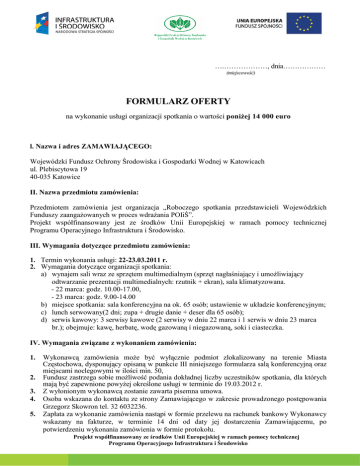 ….………………, dnia……………… (miejscowość) FORMULARZ OFERTY na wykonanie usługi organizacji spotkania o wartości poniŜej 14 000 euro l. Nazwa i adres ZAMAWIAJĄCEGO: Wojewódzki Fundusz Ochrony Środowiska i Gospodarki Wodnej w Katowicach ul. Plebiscytowa 19 40-035 Katowice II. Nazwa przedmiotu zamówienia: Przedmiotem zamówienia jest organizacja „Roboczego spotkania przedstawicieli Wojewódzkich Funduszy zaangaŜowanych w proces wdraŜania POIiŚ”. Projekt współfinansowany jest ze środków Unii Europejskiej w ramach pomocy technicznej Programu Operacyjnego Infrastruktura i Środowisko. III. Wymagania dotyczące przedmiotu zamówienia: 1. Termin wykonania usługi: 22-23.03.2011 r. 2. Wymagania dotyczące organizacji spotkania: a) wynajem sali wraz ze sprzętem multimedialnym (sprzęt nagłaśniający i umoŜliwiający odtwarzanie prezentacji multimedialnych: rzutnik + ekran), sala klimatyzowana. - 22 marca: godz. 10.00-17.00, - 23 marca: godz. 9.00-14.00 b) miejsce spotkania: sala konferencyjna na ok. 65 osób; ustawienie w układzie konferencyjnym; c) lunch serwowany(2 dni; zupa + drugie danie + deser dla 65 osób); d) serwis kawowy: 3 serwisy kawowe (2 serwisy w dniu 22 marca i 1 serwis w dniu 23 marca br.); obejmuje: kawę, herbatę, wodę gazowaną i niegazowaną, soki i ciasteczka. IV. Wymagania związane z wykonaniem zamówienia: 1. 2. 3. 4. 5. Wykonawcą zamówienia moŜe być wyłącznie podmiot zlokalizowany na terenie Miasta Częstochowa, dysponujący opisaną w punkcie III niniejszego formularza salą konferencyjną oraz miejscami noclegowymi w ilości min. 50, Fundusz zastrzega sobie moŜliwość podania dokładnej liczby uczestników spotkania, dla których mają być zapewnione powyŜej określone usługi w terminie do 19.03.2012 r. Z wyłonionym wykonawcą zostanie zawarta pisemna umowa. Osoba wskazana do kontaktu ze strony Zamawiającego w zakresie prowadzonego postępowania Grzegorz Skowron tel. 32 6032236. Zapłata za wykonanie zamówienia nastąpi w formie przelewu na rachunek bankowy Wykonawcy wskazany na fakturze, w terminie 14 dni od daty jej dostarczenia Zamawiającemu, po potwierdzeniu wykonania zamówienia w formie protokołu. Projekt współfinansowany ze środków Unii Europejskiej w ramach pomocy technicznej Programu Operacyjnego Infrastruktura i Środowisko 6. Ze strony Zamawiającego osobą upowaŜnioną do podpisania protokołu i odbioru przedmiotu zamówienia jest Kierownik Zespołu FE lub osoba przez niego wskazana. 7. Zamawiający zastrzega sobie prawo do zamknięcia postępowania bez dokonania wyboru oferty nie podając przyczyny, z zastrzeŜeniem pkt. 8. 8. Zamawiający zamknie postępowanie bez dokonania wyboru, gdy w toku postępowania wpłynie jedna oferta. 9. Kryterium, którym Zamawiający będzie kierował się przy wyborze oferty: cena. 10. W przypadku, gdy w trakcie trwania postępowania wpłyną oferty o tej samej wartości (cenie) Zamawiający zastrzega sobie moŜliwość wezwania wykonawców, którzy złoŜyli te oferty, do złoŜenia ofert dodatkowych. IV. Ofertę naleŜy: a) złoŜyć w formie pisemnej w terminie do dnia 22.02.2012 r. do godziny 12.00 (osobiście, pisemnie - listem, faksem, e-mailem na adres: [email protected] wraz z jednoczesnym przesłaniem wersji papierowej) na Formularzu Oferty( str.1-3), b) wraz z ofertą naleŜy: - złoŜyć odpowiedni dokument uprawniający do wykonania zamówienia oraz podpisania umowy: odpis z właściwego rejestru lub zaświadczenie o wpisie do ewidencji działalności gospodarczej, NIP i REGON, V. Tryb postępowania: ZAPYTANIE OFERTOWE Udzielenie zamówienia publicznego na podstawie ustawy z dnia 29 stycznia 2004 Prawo zamówień publicznych, zgodnie z Art 4. ust. 8. (ustawy nie stosuje się zamówień i konkursów, których wartość nie przekracza wyraŜonej w złotych równowartości kwoty 14 000 euro) oraz Regulaminu Udzielania Zamówień Publicznych w Wojewódzkim Funduszu Ochrony Środowiska i Gospodarki Wodnej w Katowicach. VI. Nazwa i adres WYKONAWCY NIP ................................................. ………………………………… (pieczęć Wykonawcy) 1. Oferuję wykonanie przedmiotu zamówienia za: a) Cena wynajmu sali konferencyjnej w dniach 22 i 23.03.2012 r. wynosi: - netto: ………………………………………………………………………………. - brutto:…………………….......................................................................................... b) Cena 3 bufetów kawowych/osobę wynosi: dla grupy do 50 osób dla grupy od 51 do 65 osób - netto: …………………. netto……………… - brutto:………………… brutto……………… - zakres bufetu (opis).………………………………………………………………… Projekt współfinansowany ze środków Unii Europejskiej w ramach pomocy technicznej Programu Operacyjnego Infrastruktura i Środowisko ………………………………………………………………………………………… c) Cena 2 serwowanych lunchów z deserem/osobę wynosi: dla grupy do 50 osób dla grupy od 51 do 65 osób - netto: …………………. netto……………… - brutto:………………… brutto……………… - opis1 lunchu z deserem……………………………………………………………… ………………………………………………………………………………………… - opis 2 lunchu z deserem……………………………………………………………… ………………………………………………………………………………………… d) Łączny koszt dla 65 osób wraz z wynajmem sali konferencyjnej wynosi: Łączna cena netto wynosi…………………………….. słownie netto:……………………………………………………………………………… Łączna cena brutto wynosi……………………………. słownie brutt