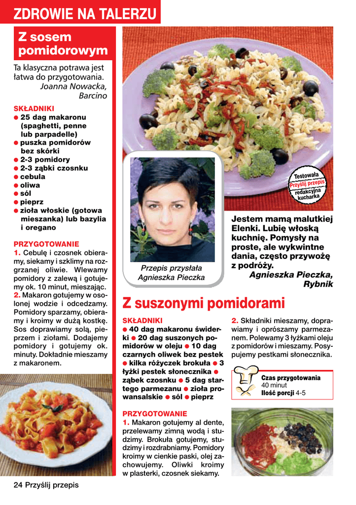 ZDROWIE NA TALERZU Z sosem pomidorowym Ta klasyczna potrawa jest łatwa do przygotowania. Joanna Nowacka, Barcino SKŁADNIKI ● 25 dag makaronu (spaghetti, penne lub parpadelle) ● puszka pomidorów bez skórki ● 2-3 pomidory ● 2-3 ząbki czosnku ● cebula ● oliwa ● sól ● pieprz ● zioła włoskie (gotowa mieszanka) lub bazylia i oregano PRZYGOTOWANIE 1. Cebulę i czosnek obieramy, siekamy i szklimy na rozgrzanej oliwie. Wlewamy pomidory z zalewą i gotujemy ok. 10 minut, mieszając. 2. Makaron gotujemy w osolonej wodzie i odcedzamy. Pomidory sparzamy, obieramy i kroimy w dużą kostkę. Sos doprawiamy solą, pieprzem i ziołami. Dodajemy pomidory i gotujemy ok. minuty. Dokładnie mieszamy z makaronem. Testowała pis Przyślij prze redakcyjna kucharka Przepis przysłała Agnieszka Pieczka Z suszonymi pomidorami SKŁADNIKI ● 40 dag makaronu świderki ● 20 dag suszonych pomidorów w oleju ● 10 dag czarnych oliwek bez pestek ● kilka różyczek brokuła ● 3 łyżki pestek słonecznika ● ząbek czosnku ● 5 dag startego parmezanu ● zioła prowansalskie ● sól ● pieprz PRZYGOTOWANIE 1. Makaron gotujemy al dente, przelewamy zimną wodą i studzimy. Brokuła gotujemy, studzimy i rozdrabniamy. Pomidory kroimy w cienkie paski, olej zachowujemy. Oliwki kroimy w plasterki, czosnek siekamy. 24 Przyślij przepis Jestem mamą malutkiej Elenki. Lubię włoską kuchnię. Pomysły na proste, ale wykwintne dania, często przywożę z podróży. Agnieszka Pieczka, Rybnik 2. Składniki mieszamy, doprawiamy i oprószamy parmezanem. Polewamy 3 łyżkami oleju z pomidorów i mieszamy. Posypujemy pestkami słonecznika. Czas przygotowania 40 minut Ilość porcji 4-5