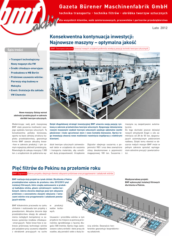Gazeta Bürener Maschinenfabrik GmbH technika transportu · technika filtrów · obróbka tworzyw sztucznych dla wszystkich klientów, osób zainteresowanych, pracowników i partnerów przedsiębiorstwa Lato 2012 Konsekwentna kontynuacja inwestycji: Najnowsze maszyny – optymalna jakość Spis treści BMF-Tworzywa sztuczne Dziesięć nowych urządzeń podkreśla wiodącą pozycję techniki tworzyw sztucznych •T ransport technologiczny: Nowy magazyn dla VW rodki chłodząco-smarujące: •Ś Przebudowa w MB Berlin różniowe usuwanie wiórów: •P Pierwszy etap budowy w Meksyku vent: Gratulacje dla zakładu •E VW Chemnitz Nowe maszyny: Dalszy wzrost zdolności produkcyjnych w zakresie obróbki tworzyw sztucznych. Modernizując swój park maszynowy BMF stale poszerza możliwości swojego wydziału tworzyw sztucznych. Ta konsekwentna polityka biznesowa, oparta na bazie zdrowej struktury kapitału przedsiębiorstwa, gwarantuje firmie BMF zawsze aktualny know-how w zakresie produkcji i tym samym najwyższą zdolność produkcyjną. Równolegle do zakupu maszyny 1.500 ton z urządzeniem do pobierania wy- Dzięki długofalowej strategii inwestycyjnej BMF umacnia swoją pozycję rynkową w zakresie przetwórstwa tworzyw sztucznych. Dysponując dziesięcioma nowymi maszynami wydział tworzyw sztucznych uzyskuje optymalne wyniki jakościowe i może ugruntować stare i nowe kontakty biznesowe. Oprócz tego inwestycja stwarza nowe możliwości rozwinięcia współpracy z niektórymi klientami. dział tworzyw sztucznych zainwestował także w urządzenia do suszenia i transportu materiału, aby umożliwić dużą przepustowość. Urządzenie Digicolor obejmuje suszarnię o pojemności 900 l oraz dwa zewnętrzne silosy dwukomorowe o pojemności magazynowej 100 ton. Suszarnia i maszyna są zaopatrywane automatycznie. Do tego dochodzi jeszcze dziewięć nowych wtryskarek Engel o sile zamknięcia od 28 do 50 ton, dysponujących automatycznym pobieraniem nadlewu. Dzięki temu również w obszarze małych maszyn BMF może w pełnym zakresie sprostać wymaganiom odnośnie precyzji i powtarzalności. Pięć filtrów do Pekinu na przełomie roku BMF-Zagranica Zakres projektu obejmuje również odsysanie próżniowe oraz przygotowanie i załadunek wiórów Międzynarodowy projekt: BMF wykona pięć instalacji filtrowych dla klienta w Pekinie. BMF realizuje duży projekt na rynek chiński. Dla klienta z Pekinu przedsiębiorstwo wykona do przełomu roku 2012/2013 pięć instalacji filtrowych, które znajdą zastosowanie w produkcji kadłubów silnika, głowic cylindrowych i wałów korbowych. Zakres zlecenia obejmuje poza tym odsysanie próżniowe z szesnastoma stacjami odsysania i łamaczami wiórów oraz przygotowanie i załadunek powstających wiórów. BMF kilkakrotnie pracowała na rynku chińskim i realizowała tam projekty z powodzeniem. Aktualne zlecenie daje przedsiębiorstwu okazję do udowodnienia rozległych kompetencji w zakresie systemów środków chłodząco-smarujących. Także know-how w zakresie próżniowej technologii wiórów jest pożądane przy usuwaniu odpadów z obrabiarek pracujących na sucho w produkcji wałów korbowych. Usuwanie i przeróbka wiórów w tym projekcie ma miejsce za pomocą przenośnika zgrzebłowego o łącznej długości 500 metrów. Oprócz tego zastosowano cztery wirówki i dwie prasy do osadów, aby poradzić sobie z dużą ilo- ścią wiórów. Dwanaście kontenerów gwarantuje bezproblemowy załadunek. Innowacje · Następcy BMF-od wydawcy Wykwalifikowani i zmotywowani pracownicy są decydującym czynnikiem przewagi konkurencyjnej i w 21 wieku ten czynnik coraz bardziej zyskuje na znaczeniu. Liczne duże, a także średnie przedsiębiorstwa przekonują się, że w rocznikach niżu demograficznego znacznie trudniej jest pozyskać odpowiednich następców w zawodach technicznych i handlowych. W walce o odpowiednich następców uprzywilejowane są przede wszystkim te przedsiębiorstwa, które zawsze kładły duży nacisk na kształcenie i dokształcanie własnych pracowników. Teraz widać, jak korzystny jest dla BMF fakt, że od wielu lat następcy są wybierani spośród własnych szeregów. Przyczynia się do tego udostępnianie atrakcyjnych miejsc do nauki, a także możliwość rozwijania kariery w przedsiębiorstwie. Długoletni pracownicy są najlepszymi ambasadorami wiedzy, nierzadko więc przynależność do BMF jest niejako „dziedziczona” w rodzinach. Pracownicy, którzy w dużym stopniu identyfikują się ze swoim przedsiębiorstwem, są najlepszym medium reklamowym, które w naszym przypadku bardzo dobrze funkcjonuje. Mimo to instrumenty do pozyskiwania personelu muszą być ciągle sprawdzane. Stare metody uzupełniamy nowymi pomysłami, z którymi już mamy dobre doświadczenia. Należy do nich także możliwość podwójnych studiów i form kształcenia umożliwiających równolegle studia i pracę zawodową. W przyszłości BMF również pozostanie atrakcyjnym pracodawcą, który jest silnie związany z miejscowymi społecznościami. Nowy magazyn rozłączający do końca 2012 roku BMF-Transport technologiczny Kolejne zlecenie w zakresie techniki skidowej w siedzibie VW w Wolfsburgu Wydział transportu technologicznego pogłębia współpracę z VW w Wolfsburgu. Do końca 2012 roku BMF wykona w głównej siedzibie wiodącego producenta samochodów magazyn rozłączający z magazynem karoserii i magazynem piętrowym. Najnowsze zlecenie było poprzedzone licznymi projektami w zakresie techniki skidowej w Wolfsburgu. Ostatnio BMF dostarczyła urządzenia transportu technologicznego dla trasy łączącej montaż surowej karoserii z lakiernią. Długość trasy to 3,5 km, a całkowity ciężar konstrukcji stalowej to 600 ton. Magazyn rozłączający obejmuje odcinek o długości 1 km i składa się z 180 elementów transportujących. Zastępuje on technologię Power & Free, która z powodu wartości emisji nie odpowiada już naszym czasom. Opr
