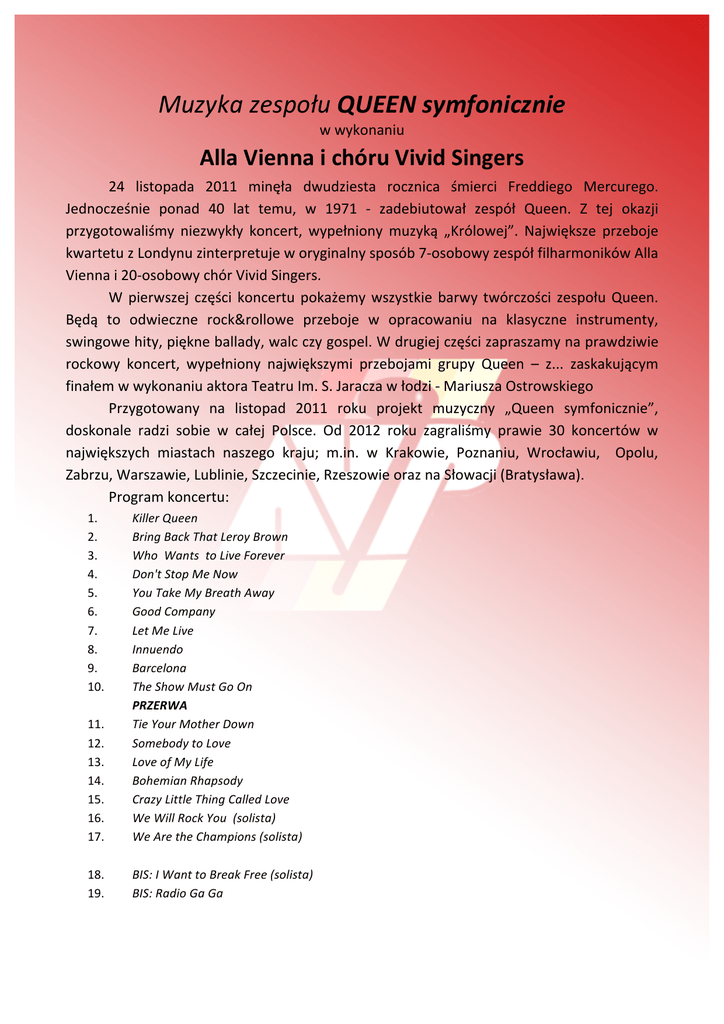 Muzyka zespołu QUEEN symfonicznie w wykonaniu Alla Vienna i chóru Vivid Singers 24 listopada 2011 minęła dwudziesta rocznica śmierci Freddiego Mercurego. Jednocześnie ponad 40 lat temu, w 1971 -‐ zadebiutował zespół Queen. Z tej okazji przygotowaliśmy niezwykły koncert, wypełniony muzyką „Królowej”. Największe przeboje kwartetu z Londynu zinterpretuje w oryginalny sposób 7-‐osobowy zespół filharmoników Alla Vienna i 20-‐osobowy chór Vivid Singers. W pierwszej części koncertu pokażemy wszystkie barwy twórczości zespołu Queen. Będą to odwieczne rock&rollowe przeboje w opracowaniu na klasyczne instrumenty, swingowe hity, piękne ballady, walc czy gospel. W drugiej części zapraszamy na prawdziwie rockowy koncert, wypełniony największymi przebojami grupy Queen – z... zaskakującym finałem w wykonaniu aktora Teatru Im. S. Jaracza w łodzi -‐ Mariusza Ostrowskiego Przygotowany na listopad 2011 roku projekt muzyczny „Queen symfonicznie”, doskonale radzi sobie w całej Polsce. Od 2012 roku zagraliśmy prawie 30 koncertów w największych miastach naszego kraju; m.in. w Krakowie, Poznaniu, Wrocławiu, Opolu, Zabrzu, Warszawie, Lublinie, Szczecinie, Rzeszowie oraz na Słowacji (Bratysława). Program koncertu: 1. 2. 3. 4. 5. 6. 7. 8. 9. 10. 11. 12. 13. 14. 15. 16. 17. 18. 19. Killer Queen Bring Back That Leroy Brown Who Wants to Live Forever Don't Stop Me Now You Take My Breath Away Good Company Let Me Live Innuendo Barcelona The Show Must Go On PRZERWA Tie Your Mother Down Somebody to Love Love of My Life Bohemian Rhapsody Crazy Little Thing Called Love We Will Rock You (solista) We Are the Champions (solista) BIS: I Want to Break Free (solista) BIS: Radio Ga Ga Booking: www.avip.pl email: [email protected] Woytek Mrozek tel.: +48 600 384750 Lidia tel.: +48 790 517 791