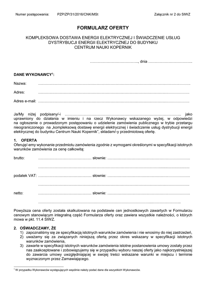Numer postępowania: PZP/ZP/31/2016/CNK/MSt Załącznik nr 2 do SIWZ FORMULARZ OFERTY KOMPLEKSOWA DOSTAWA ENERGII ELEKTRYCZNEJ I ŚWIADCZENIE USŁUG DYSTRYBUCJI ENERGII ELEKTRYCZNEJ DO BUDYNKU CENTRUM NAUKI KOPERNIK ……………………………….., dnia …………………………….. DANE WYKONAWCY1: Nazwa: …………………………………………………………………………………………………………. Adres: …………………………………………………………………………………………………………. Adres e-mail: …………………………………………………………………………………………………………. Ja/My niżej podpisany/-i ……………………………………………………………………………….. jako uprawniony do działania w imieniu i na rzecz Wykonawcy wskazanego wyżej, w odpowiedzi na ogłoszenie o prowadzonym postępowaniu o udzielenie zamówienia publicznego w trybie przetargu nieograniczonego na „kompleksową dostawę energii elektrycznej i świadczenie usług dystrybucji energii elektrycznej do budynku Centrum Nauki Kopernik”, składam/-y przedmiotową ofertę. 1. OFERTA Oferuję/-emy wykonanie przedmiotu zamówienia zgodnie z wymogami określonymi w specyfikacji istotnych warunków zamówienia za cenę całkowitą: brutto: …………………………………… słownie: …………………………………………………………. …………………………………………………………………………………….............................. podatek VAT: …………………………………… słownie: …………………………………………………………. …………………………………………………………………………………………………………. netto: …………………………………… słownie: …………………………………………………………. ……………………………………………………………………………………...………………….. Powyższa cena oferty została skalkulowana na podstawie cen jednostkowych zawartych w Formularzu cenowym stanowiącym integralną część Formularza oferty oraz zawiera wszystkie należności, o których mowa w pkt. 11.4 SIWZ. 2. OŚWIADCZAMY, ŻE 1) zapoznaliśmy się ze specyfikacją istotnych warunków zamówienia i nie wnosimy do niej zastrzeżeń, 2) uważamy się za związanych niniejszą ofertą przez okres wskazany w specyfikacji istotnych warunków zamówienia, 3) zawarte w specyfikacji istotnych warunków zamówienia istotne postanowienia umowy zostały przez nas zaakceptowane i zobowiązujemy się w przypadku wyboru naszej oferty jako najkorzystniejszej do zawarcia umowy uwzględniającej w swojej treści wskazane warunki w miejscu i terminie wyznaczonym przez Zamawiającego. 1 W przypadku Wykonawców występujących wspólnie należy podać dane dla wszystkich Wykonawców. Numer postępowania: PZP/ZP/31/2016/CNK/MSt 3. INFORMUJEMY, ŻE 1) w celu zabezpieczenia niniejszej Załącznik nr 2 do SIWZ Oferty zostało w wniesione wadium w wysokości: ……………………………………. słownie: …………………………………….…………………………… w formie: ………………………………………………………………….. 2) wpłacone wadium prosimy zwrócić na nasz rachunek bankowy2 ………………………………………………………………………………………………………………….......... ..................................................................................................................................................... 3) informacje i dokumenty składające ………………………………………….. się stanowią na Ofertę, tajemnicę zawarte przedsiębiorstwa na w stronach rozumieniu przepisów ustawy o zwalczaniu nieuczciwej konkurencji, co wykazaliśmy w załączniku nr …………. do Oferty, i jako takie nie mogą być ogólnie udostępniane. 4) Oferta została złożona na …………………… kolejno ponumerowanych stronach. 5) wszelką korespondencję w sprawie niniejszego postępowania należy kierować na adres3: ………………………………………………………………………………………………………………….. e-mail: …………………………………………………………………………………………………………. 6) Integralną część Oferty stanowią: Formularz cenowy. Jednolity Europejski Dokument Zamówienia. Pełnomocnictwo do podpisania umowy4 …………………………………………………… …………………………………………………... …………………………………………………… …………………………………………………… …………………………………………………… ………………………………………………………………… data podpis osoby uprawnionej do reprezentacji Wykonawcy 2 Dotyczy Wykonawców, którzy wnieśli wadium w formie pieniężnej. Należy wskazać nazwę banku oraz numer rachunku. Wypełnić w przypadku innego adresu niż wskazany w Formularzu oferty na str. 1 (Dane Wykonawcy). 4 O ile prawo to nie wynika z innych dokumentów lub pełnomocnictw złożonych wraz z ofertą (pkt. 9.5.3 SIWZ). 3 Numer postępowania: PZP/ZP/31/2016/CNK/MSt Załącznik nr 2 do SIWZ FORMULARZ CENOWY KOMPLEKSOWA DOSTAWA ENERGII ELEKTRYCZNEJ I ŚWIADCZENIE USŁUG DYSTRYBUCJI ENERGII ELEKTRYCZNEJ DO BUDYNKU CENTRUM NAUKI KOPERNIK DANE WYKONAWCY1: Nazwa: …………………………………………………………………………………………………………. Adres: …………………………………………………………………………………………………………. Oświadczam/-y, iż wsk