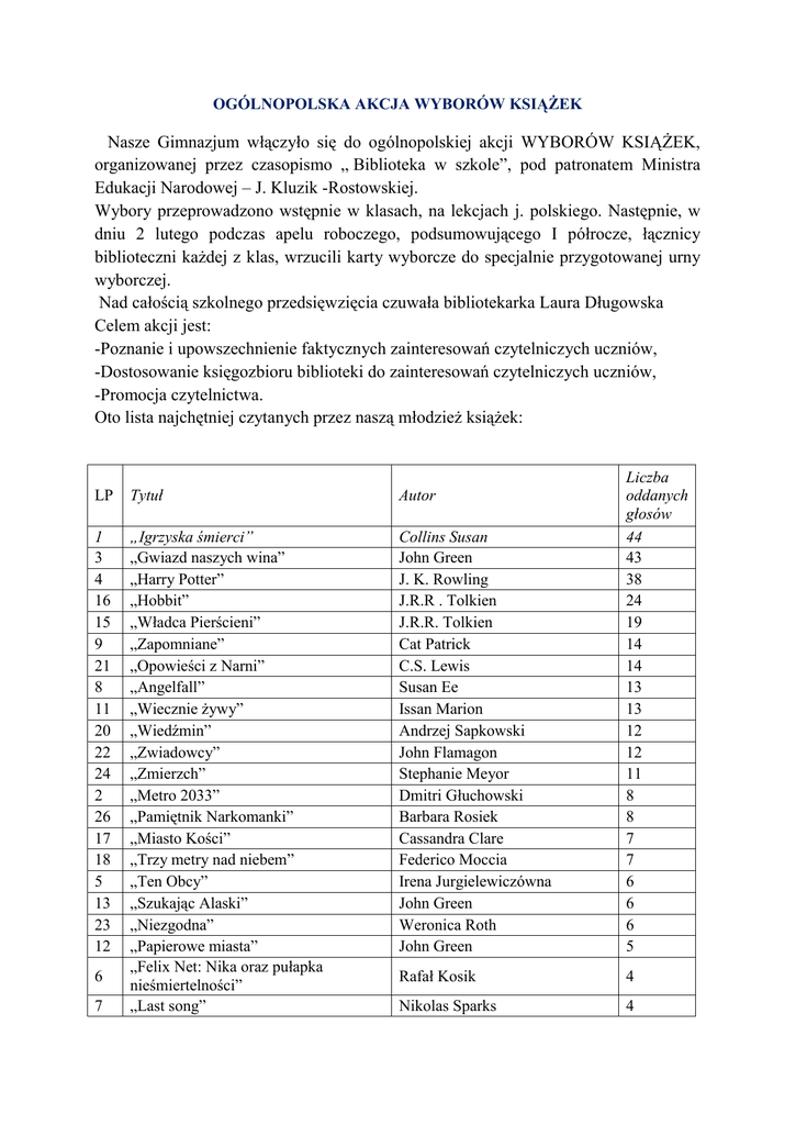 OGÓLNOPOLSKA AKCJA WYBORÓW KSIĄŻEK Nasze Gimnazjum włączyło się do ogólnopolskiej akcji WYBORÓW KSIĄŻEK, organizowanej przez czasopismo „ Biblioteka w szkole”, pod patronatem Ministra Edukacji Narodowej – J. Kluzik -Rostowskiej. Wybory przeprowadzono wstępnie w klasach, na lekcjach j. polskiego. Następnie, w dniu 2 lutego podczas apelu roboczego, podsumowującego I półrocze, łącznicy biblioteczni każdej z klas, wrzucili karty wyborcze do specjalnie przygotowanej urny wyborczej. Nad całością szkolnego przedsięwzięcia czuwała bibliotekarka Laura Długowska Celem akcji jest: -Poznanie i upowszechnienie faktycznych zainteresowań czytelniczych uczniów, -Dostosowanie księgozbioru biblioteki do zainteresowań czytelniczych uczniów, -Promocja czytelnictwa. Oto lista najchętniej czytanych przez naszą młodzież książek: LP Tytuł Autor 1 3 4 16 15 9 21 8 11 20 22 24 2 26 17 18 5 13 23 12 „Igrzyska śmierci” „Gwiazd naszych wina” „Harry Potter” „Hobbit” „Władca Pierścieni” „Zapomniane” „Opowieści z Narni” „Angelfall” „Wiecznie żywy” „Wiedźmin” „Zwiadowcy” „Zmierzch” „Metro 2033” „Pamiętnik Narkomanki” „Miasto Kości” „Trzy metry nad niebem” „Ten Obcy” „Szukając Alaski” „Niezgodna” „Papierowe miasta” „Felix Net: Nika oraz pułapka nieśmiertelności” „Last song” Collins Susan John Green J. K. Rowling J.R.R . Tolkien J.R.R. Tolkien Cat Patrick C.S. Lewis Susan Ee Issan Marion Andrzej Sapkowski John Flamagon Stephanie Meyor Dmitri Głuchowski Barbara Rosiek Cassandra Clare Federico Moccia Irena Jurgielewiczówna John Green Weronica Roth John Green Liczba oddanych głosów 44 43 38 24 19 14 14 13 13 12 12 11 8 8 7 7 6 6 6 5 Rafał Kosik 4 Nikolas Sparks 4 6 7 10 14 19 25 27 28 29 30 31 32 33 34 „Wróć jeśli pamiętasz” „Percy Jackson: Bogowie Olimpijscy” „Zielona mila” „Szczęściarz” „Scherlock Holmes” „Ania z Zielonego Wzgórza” „Ja diablica” „Kwiaty na poddaszu” „Zostań jeśli kochasz” „Kosogłos” „Inferno” „Jesienna miłość” Gayle Forman Rick Riordan Stephen King Christopher Paolini Arthur Conan Doyce Lucy Moud Montgomery Katarzyna Miszczuk Virginia C. Andrews Gayle Forman Suzanne Collins Dan Brown Nicolas Sparks 4 4 4 4 3 3 3 3 3 3 3 3