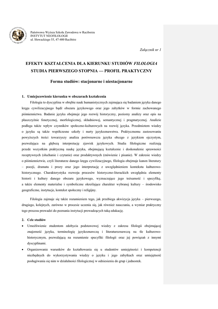 Państwowa Wyższa Szkoła Zawodowa w Raciborzu INSTYTUT NEOFILOLOGII ul. Słowackiego 55, 47-400 Racibórz Załącznik nr 1 EFEKTY KSZTAŁCENIA DLA KIERUNKU STUDIÓW FILOLOGIA STUDIA PIERWSZEGO STOPNIA — PROFIL PRAKTYCZNY Forma studiów: stacjonarne i niestacjonarne 1. Umiejscowienie kierunku w obszarach kształcenia Filologia to dyscyplina w obrębie nauk humanistycznych zajmująca się badaniem języka danego kręgu cywilizacyjnego bądź obszaru językowego oraz jego zabytków w formie zachowanego piśmiennictwa. Badanie języka obejmuje jego rozwój historyczny, poziomy analizy oraz opis na płaszczyźnie fonetycznej, morfologicznej, składniowej, semantycznej i pragmatycznej. Analizie podlega także wpływ czynników społeczno-kulturowych na rozwój języka. Przedmiotem wiedzy o języku są także współczesne szkoły i nurty językoznawstwa. Praktycznemu zastosowaniu powyższych treści towarzyszy analiza porównawcza języka obcego z językiem ojczystym, pozwalająca na głębszą interpretację zjawisk językowych. Studia filologiczne realizują przede wszystkim praktyczną naukę języka, obejmującą kształcenie i doskonalenie sprawności receptywnych (słuchanie i czytanie) oraz produktywnych (mówienie i pisanie). W zakresie wiedzy o piśmiennictwie, czyli literaturze danego kręgu cywilizacyjnego, filologia obejmuje kanon literatury – poezji, dramatu i prozy oraz jego interpretację z uwzględnieniem kontekstu kulturowohistorycznego. Charakterystyka rozwoju procesów historyczno-literackich uwzględnia elementy historii i kultury danego obszaru językowego, wyznaczające jego tożsamość i specyfikę, a także elementy materialne i symboliczne określające charakter wybranej kultury – środowisko geograficzne, instytucje, kontekst społeczny i religijny. Filologia zajmuje się także rozumieniem tego, jak przebiega akwizycja języka – pierwszego, drugiego, kolejnych, zarówno w procesie uczenia się, jak również nauczania, a wymiar praktyczny tego procesu prowadzi do poznania instytucji prowadzących taką edukację. 2. Cele studiów Umożliwienie studentom zdobycia podstawowej wiedzy z zakresu filologii obejmującej znajomość języka, terminologię językoznawczą i literaturoznawczą na tle kulturowohistorycznym, pozwalającą na rozumienie specyfiki filologii oraz jej powiązań z innymi dyscyplinami. Organizowanie warunków do kształtowania się u studentów umiejętności i kompetencji niezbędnych do wykorzystywania wiedzy o języku i jego zabytkach oraz umiejętność posługiwania się nim w działalności filologicznej w odniesieniu do grup i jednostek. Państwowa Wyższa Szkoła Zawodowa w Raciborzu INSTYTUT NEOFILOLOGII ul. Słowackiego 55, 47-400 Racibórz Kształtowanie umiejętności uczenia się i doskonalenia swojej wiedzy, umiejętności i kompetencji filologa z wykorzystaniem nowoczesnych środków i metod pozyskiwania, organizowania i przetwarzania informacji i materiałów. Umożliwienie nabywania umiejętności komunikowania się zarówno ze specjalistami, jak i z osobami spoza grona specjalistów przy użyciu różnych kanałów i technik. Kształtowanie wrażliwości etycznej, refleksyjności oraz postaw prospołecznych i poczucia odpowiedzialności. Praktyczne przygotowanie studentów do realizowania zadań zawodowych w wybranym obszarze i w warunkach właściwych dla zakresu działalności zawodowej filologa, (związanej z posługiwaniem się językiem, na przykład w: działalności medialnej, wydawniczej, turystycznej, edukacyjnej, kulturalnej, itp.) oraz do elastycznego funkcjonowania na rynku pracy. W odniesieniu do specjalności nauczycielskiej – przygotowanie studentów do wykonywania zawodu nauczyciela w przedszkolach i szkołach podstawowych. W odniesieniu do specjalności translatorskiej – przygotowanie studentów do wykonywania zawodu tłumacza. W odniesieniu do specjalności język obcy (angielski/niemiecki) w biznesie – przygotowanie studentów do wykonywania zawodu filologa-specjalisty w placówce danej gałęzi przemysłu i/lub biznesu. 3. Efekty kształcenia Objaśnienie oznaczeń: K (przed podkreślnikiem) kierunkowe efekty kształcenia: W — (po podkreślniku) kategoria wiedzy U — kategoria umiejętności K — kategoria kompetencji społecznych H1P — efekty kształcenia w obszarze kształcenia w zakresie nauk humanistycznych dla studiów pierwszego stopnia S1P — efekty kształcenia w obszarze kształcenia w zakresie nauk społecznych dla studiów pierwszego stopnia 01, 02, 03 i kolejne — numer efektu kształcenia Opis efektów kształcenia Po ukończeniu studiów pierwszego stopnia na kierunku studiów filologia absolwent: Symbol efektu kształcenia dla kierunku Efekty kształcenia dla kierunku studiów filologia (profil praktyczny): Absolwent kierunku filologia: Odniesienie do efektów kształcenia w obszarach kształcenia w zakresie nauk humanistycznych (i społecznych) WIEDZA K_W01 ma podstawową wiedzę o miejscu filologii w systemie nauk, jej specyfice H1P_W01 przedmiotowej i metodologicznej oraz jej interdyscyplinarnym charakterze Państwowa Wyższa Szkoła Zawodowa w Raciborzu INSTYTUT NEOFILOLOGII ul. Słowackiego 55, 47-400 Racibórz K_W02 K_W03 K_W04 K_W05 K_W06 K_W07 K_W08 K_W09 K_W10 K_W11 K_W12 K_W13 K_W14 K_W15 K_W16 zna podstawową terminologię z zakresu filologii, rozumie jej źródła oraz zastosowania w obrębie pokrewnych dyscyplin naukowych, które zostaną wykorzystane w profesji filologa-specjalisty ma uporządkowaną wiedzę na temat języka (i komunikacji), jego kategorii, poziomów analizy i opisu, która zostanie wykorzystana w praktycznych zastosowaniach profesji filologa-specjalisty ma podstawową wiedzę na temat rozwoju języka (historycznego i społecznokulturowego), która zostanie wykorzystana w porozumiewaniu się i przekazywaniu informacji zna terminologię, zasady oraz praktyczne metody analizy porównawczej języków, jak również teorię oraz zastosowania bada
