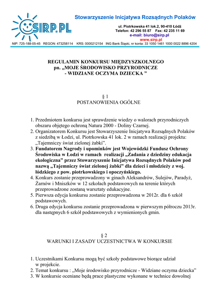 Stowarzyszenie Inicjatywa Rozsądnych Polaków ul. Piotrkowska 41 lok.2, 90-410 Łódź Telefon: 42 296 55 87 Fax: 42 235 11 69 e-mail: [email protected] www.sirp.pl NIP: 725-188-05-45 REGON: 473258114 KRS: 0000212154 ING Bank Śląski, nr konta: 33 1050 1461 1000 0022 8896 4204 REGULAMIN KONKURSU MIĘDZYSZKOLNEGO pn. „MOJE ŚRODOWISKO PRZYRODNICZE - WIDZIANE OCZYMA DZIECKA ” §1 POSTANOWIENIA OGÓLNE 1. Przedmiotem konkursu jest sprawdzenie wiedzy o walorach przyrodniczych obszaru objętego ochroną Natura 2000 - Doliny Czarnej. 2. Organizatorem Konkursu jest Stowarzyszenie Inicjatywa Rozsądnych Polaków z siedzibą w Łodzi, ul. Piotrkowska 41 lok. 2 w ramach realizacji projektu: „Tajemniczy świat zielonej żabki”. 3. Fundatorem Nagrody i upominków jest Wojewódzki Fundusz Ochrony Środowiska w Łodzi w ramach realizacji „Zadania z dziedziny edukacja ekologiczna” przez Stowarzyszenie Inicjatywa Rozsądnych Polaków pod nazwą „Tajemniczy świat zielonej żabki” dla dzieci i młodzieży z woj. łódzkiego z pow. piotrkowskiego i opoczyńskiego. 4. Konkurs zostanie przeprowadzony w ginach Aleksandrów, Sulejów, Paradyż, Żarnów i Mniszków w 12 szkołach podstawowych na terenie których przeprowadzone zostaną warsztaty edukacyjne. 5. Pierwsza edycja konkursu zostanie przeprowadzona w 2012r. dla 6 szkół podstawowych. 6. Druga edycja konkursu zostanie przeprowadzona w pierwszym półroczu 2013r. dla następnych 6 szkół podstawowych z wymienionych gmin. §2 WARUNKI I ZASADY UCZESTNICTWA W KONKURSIE 1. Uczestnikami Konkursu mogą być szkoły podstawowe biorące udział w projekcie. 2. Temat konkursu : „Moje środowisko przyrodnicze - Widziane oczyma dziecka” 3. W konkursie oceniane będą prace plastyczne wykonane w technice dowolnej Stowarzyszenie Inicjatywa Rozsądnych Polaków ul. Piotrkowska 41 lok.2, 90-410 Łódź Telefon: 42 296 55 87 Fax: 42 235 11 69 e-mail: [email protected] www.sirp.pl NIP: 725-188-05-45 REGON: 473258114 KRS: 0000212154 ING Bank Śląski, nr konta: 33 1050 1461 1000 0022 8896 4204 (np. w formie rysunku, wycinanki, malowania) w kategoriach : a) ptaki, b) zwierzęta, c) rośliny – jakie znam ze swojego miejsca zamieszkania. 4. Prace plastyczne wykonane przez dzieci z wszystkich klas ocenione zostaną przez trzyosobowy zespół nauczycieli, który wybierze trzy najlepsze prace. 5. Trzy wybrane prace zostaną przekazane organizatorowi konkursu w dniu realizacji bloku edukacyjno – rozrywkowego w tej placówce szkolnej. 6. W dniu realizacji bloku edukacyjno – rozrywkowego w placówce szkolnej uczestnicy konkursu (uczniowie) otrzymają upominki za uczestnictwo w konkursie międzyszkolnym. 7. Wybrane prace plastyczne – 36 sztuk, zostaną zaprezentowane na WIRTUALNEJ WYSTAWIE zamieszczonej na podstronie internetowej projektu na stronie www.sirp.pl §3 KRYTERIA OCENIANIA 1. Oceny prac dokona jury składające się z 3 osób powołanych przez koordynatora przedmiotowego projektu, a w jego skład wejdą przedstawiciele (po jednej osobie) : Wojewódzkiego Funduszu Ochrony Środowiska i Gospodarki Wodnej w Łodzi, Stowarzyszenia Inicjatywa Rozsądnych Polaków oraz lokalnych mediów. 2. Zwycięzca konkursu – jedna placówka szkolna, otrzyma cyfrowy aparat fotograficzny Sony DSC-RX100 + skórzany futerał LCJ-RXA 3. Wręczenie nagrody przedstawicielom zwycięskiej placówki szkolnej /zaproszona 10 osobowa reprezentacja uczniów wraz z dyrekcją i nauczycielami / w maju – czerwcu 2013r. w czasie co rocznego festynu pn. „Jesteśmy Razem” w Łodzi. §4 POSTANOWIENIA KOŃCOWE 1. Prace przejęte przez organizatora konkursu nie podlegają zwrotowi, a zgłoszenie ich do konkursu jest równoznaczne z przejściem majątkowych praw autorskich na rzecz Organizatora bez prawa do wynagrodzenia twórcy. 2. Organizator jest uprawniony do zmiany postanowień niniejszego Regulaminu, Stowarzyszenie Inicjatywa Rozsądnych Polaków ul. Piotrkowska 41 lok.2, 90-410 Łódź Telefon: 42 296 55 87 Fax: 42 235 11 69 e-mail: [email protected] www.sirp.pl NIP: 725-188-05-45 REGON: 473258114 KRS: 0000212154 ING Bank Śląski, nr konta: 33 1050 1461 1000 0022 8896 4204 o ile nie wpłynie to na pogorszenie warunków uczestnictwa w Konkursie. Dotyczy to w szczególności zmian terminów poszczególnych czynności konkursowych.