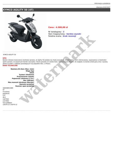 Informacje o produkcie Utworzono 04-03-2017 KYMCO AGILITY 50 (4T) Cena : 4.500,00 zł er m ar k Nr katalogowy : 2 Stan magazynowy : bardzo wysoki Średnia ocena : brak recenzji KYMCO AGILITY 50 OPIS Bardzo ciekawa nowoczesna stylistyka sprawia, że Agility 50 podoba się chyba wszystkim. Współczesny silnik czterosuwowy, wyposażony w katalizator spalin sprawia, że pojazd jest bardzo oszczędny. Skuter posiada 12-calowe koła z aluminiowymi felgami. Ze względu na bardzo atrakcyjną cenę i wysoką jakość to jeden z najlepiej sprzedających się pojazdów 50cc. w Polsce. DANE TECHNICZNE w at Wymiary Dł./Szer./Wys. (mm) Waga (kg) Silnik System chłodzenia Przeniesienie napędu Pojemność skokowa (c.cm.) Moc (KM/obr) Max.moment obrotowy (Nm/obr) Hamulce przód/tył Rozmiar opon przód/tył 1820/685/1085 97 4-suwowy powietrze CVT 49,5 3,6/7500 3,5/7000 Tarcza/Bęben 120/70-12 130/70-12