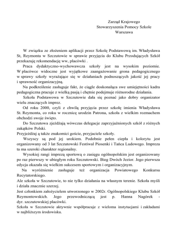 Zarząd Krajowego Stowarzyszenia Pomocy Szkole Warszawa W związku ze złożeniem aplikacji przez Szkolę Podstawową im. Władysława St, Reymonta w Szczutowie w sprawie przyjęcia do Klubu Przodujących Szkół przekazuję rekomendację ww, placówki . Praca dydaktyczno-wychowawcza szkoły jest na wysokim poziomie. W placówce widoczne jest wyjątkowe zaangażowanie grona pedagogicznego w sprawy szkoły wyrażające się w działaniach podnoszących jakość jej pracy i sprawność organizacyjną. Na podkreślenie zasługuje fakt, że ciągle doskonaląca swe umiejętności kadra pedagogiczna pracuje z wielką pasją i chętnie podejmuje różnorodne działania. Szkoła Podstawowa w Szczutowie dała się poznać jako dobry organizator wielu znaczących imprez. Od roku 2000, czyli z chwilą przyjęcia przez szkołę imienia Władysława St. Reymonta, co roku w rocznicę urodzin Patrona, szkoła z wielkim rozmachem obchodzi swoje święto. Do Szczutowa zjeżdżają wówczas delegacje zaprzyjaźnionych szkół z różnych zakątków Polski. Przyjeżdżaj ą także znakomici goście, przyjaciele szkoły. Wszyscy są pod jej urokiem. Podobnie pełen ciepła i kolorytu jest organizowany od 3 lat Szczutowski Festiwal Piosenki i Tańca Ludowego. Impreza ta ma szeroki charakter regionalny. Wysokiej rangi imprezą sportową o zasięgu ogólnopolskim jest organizowany po raz pierwszy w ubiegłym roku Szczutowski. Bieg Dwóch Jezior. Jego pierwsza edycja okazała się wielkim sukcesem sportowym i organizacyjnym. Na wyróżnienie zasługuje też organizacja Powiatowego Konkursu Recytatorskiego. Ale szkoła w Szczutowie, to nie tylko działania na własnym terenie. Szkoła myśli i działa znacznie szerzej. Jest członkiem założycielem utworzonego w 2002r. Ogólnopolskiego Klubu Szkół Reymontowskich. Jego przewodniczącą jest p. Hanna Nagórek dyr. szczutowskiej placówki. Szkoła w Szczutowie aktywnie współpracuje z wieloma instytucjami i zakładami w najbliższym środowisku. Ale nie tylko.... Od kilku lat utrzymuje bliskie kontakty z Wyższa Szkolą Humanistyczną w Pułtusku, Wyższą, Szkołą Zawodową w Płocku, Politechniką Warszawską, Urzędem Marszałkowskim Województwa Mazowieckiego, Krajowym Stowarzyszeniem Pomocy Szkole, Kołem Stowarzyszenia Dziennikarzy im. Władysława St. Reymonta w Otwocku oraz parlamentarzystami: posłem Tadeuszem Samborskim, senatorem Zbigniewem Kruszewskim i posłanką Zofią Grzebisz - Nowicką. Sprawdzonym przyjacielem szkoły od wielu lat jest ksiądz biskup Roman Marcinkowski. Dyrektor oraz rada pedagogiczna bardzo ciepło wyrażają się też o swej współpracy z Muzeum Wsi Mazowieckiej w Sierpcu. Szkoła Podstawowa Szczutowie to miejsce bardzo przyjazne uczniom. Ważne miejsce w jej organizacji pracy zajmuje rozwój zainteresowań i pasji uczniowskich. W związku z tym prowadzone są różnorodne zajęcia pozalekcyjne takie jak: Chór, zespół wokalny „Promyk", Koło Teatralne, Koło Młodych Dziennikarzy, Koło Polonistyczne, Koło Matematyczne, Koło Młodego Ekologa, Koło Przyrodnicze, Kółko Germanistyczne, SKS. Dzięki udziałowi w tego typu zajęciach uczniowie rozwijają swoje zainteresowania, poszerzają wiedzę oraz biorą udział w różnych konkursach, olimpiadach, zawodach - począwszy od szczebla szkolnego, a na szczeblu krajowym skończywszy - i wielokrotnie odnoszą sukcesy. Dużą uwagę zwraca się w szkole na propagowanie i czynne uprawianie turystyki krajoznawczej i sportowej. Przejawia się to w organizacji wycieczek krajoznawczo - turystycznych i imprez wyjazdowych różnej rangi oraz zawodów sportowych, Wizytówką szkoły od lat jest tenis stołowy i lekkoatletyka. Szkoła Podstawowa w Szczutowie to placówka, która uczy twórczego, krytycznego myślenia, pomaga zrozumieć dziecku otaczający go świat, rozwija go społecznie, uczy wrażliwości na potrzeby innych / pomoc dla Kasi i Bartka, Góra grosza, Mikołajki/. Doceniam aktywność oraz efektywność działali edukacyjne wychowawczych szkoły i wyrażam nadzieję, że aplikacja Szkoły Podstawowej w Szczutowie w sprawie przyjęcia do Klubu Przodujących Szkół zyska aprobatę Rady Klubu.