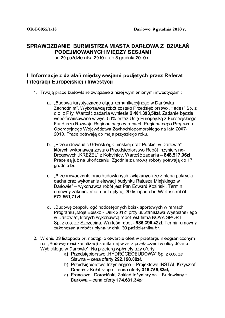 OR-I-0055/1/10 Darłowo, 9 grudnia 2010 r. SPRAWOZDANIE BURMISTRZA MIASTA DARŁOWA Z DZIAŁAŃ PODEJMOWANYCH MIĘDZY SESJAMI od 20 października 2010 r. do 8 grudnia 2010 r. I. Informacje z działań między sesjami podjętych przez Referat Integracji Europejskiej i Inwestycji 1. Trwają prace budowlane związane z niżej wymienionymi inwestycjami: a. „Budowa turystycznego ciągu komunikacyjnego w Darłówku Zachodnim”. Wykonawcą robót zostało Przedsiębiorstwo „Hades” Sp. z o.o. z Piły. Wartość zadania wyniesie 2.401.393,58zł. Zadanie będzie współfinansowane w wys. 50% przez Unię Europejską z Europejskiego Funduszu Rozwoju Regionalnego w ramach Regionalnego Programu Operacyjnego Województwa Zachodniopomorskiego na lata 20072013. Prace potrwają do maja przyszłego roku. b. „Przebudowa ulic Gdyńskiej, Chińskiej oraz Puckiej w Darłowie”, których wykonawcą zostało Przedsiębiorstwo Robót InżynieryjnoDrogowych „KRĘŻEL” z Kobylnicy. Wartość zadania – 848.517,96zł. Prace są już na ukończeniu. Zgodnie z umową roboty potrwają do 17 grudnia br. c. „Przeprowadzenie prac budowlanych związanych ze zmianą pokrycia dachu oraz wykonanie elewacji budynku Ratusza Miejskiego w Darłowie” – wykonawcą robót jest Pan Edward Koziński. Termin umowny zakończenia robót upłynął 30 listopada br. Wartość robót 572.551,71zł. d. „Budowę zespołu ogólnodostępnych boisk sportowych w ramach Programu „Moje Boisko - Orlik 2012” przy ul.Stanisława Wyspiańskiego w Darłowie”, których wykonawcą robót jest firma NOVA SPORT Sp. z o.o. ze Szczecina. Wartość robót - 986.390,42zł. Termin umowny zakończenia robót upłynął w dniu 30 października br. 2. W dniu 03 listopada br. nastąpiło otwarcie ofert w przetargu nieograniczonym na: „Budowę sieci kanalizacji sanitarnej wraz z przyłączami w ulicy Józefa Wybickiego w Darłowie”. Na przetarg wpłynęły trzy oferty: a) Przedsiębiorstwo „HYDROGEOBUDOWA” Sp. z o.o. ze Sławna – cena oferty 292.190,00zł, b) Przedsiębiorstwo Inżynieryjno – Projektowe INSTAL Krzysztof Dmoch z Kołobrzegu – cena oferty 315.755,63zł, c) Franciszek Dorosiński, Zakład Inżynieryjno – Budowlany z Darłowa – cena oferty 174.631,34zł Komisja wybrała ofertę Pana Franciszka Dorosińskiego jako najkorzystniejszą. Przekazanie placu budowy nastąpiło w dniu 30 listopada br. Termin wykonania robót ustalony został na dzień 30 grudnia br. 3. Także w dniu 03 listopada nastąpiło otwarcie ofert w przetargu nieograniczonym na „Zagospodarowanie terenu na cele rekreacyjne na zapleczu ul. Henryka Wieniawskiego w Darłowie”. Na ten przetarg wpłynęła tylko jedna oferta, którą złożyło Przedsiębiorstwo Produkcyjne „SELFA” Sp. z o. o. Wykonawca zaproponował cenę 248.672,26zł. Termin wykonania robót ustalony został na dzień 30 grudnia br. W dniu 09 listopada br. nastąpił odbiór robót związanych z realizacją inwestycji p.n. „Budowa wielofunkcyjnego boiska sportowego przy Zespole Szkół w Darłowie – ul. Zwycięstwa 1”. Wykonawcą była firma Media Stadion II. Referat Gospodarki Nieruchomościami i Planowania 1. Zawarto akt notarialny przeniesienia prawa własności na nieruchomość zabudowaną przeznaczoną do zbiórki przy: - ul. Kotwiczna 8 – za kwotę 619.000,00 zł, - ul. Miodowa 6 – za kwotę 45.850,00 zł, - ul. Miodowa 8 – za kwotę 40.400,00 zł, - ul. Aleje Wojska Polskiego 7 – za kwotę 78.780,00 zł, - ul. Nagietkowa 4 – za kwotę 63.630,00 zł, - ul. Morska 75-79 (garaż – działka 34/22 obręb 10) – za kwotę 6.060,00 zł, - ul. Makowa działka nr 25/55 i 25/56 obręb 7– za kwotę 71.710,00 zł, - ul. Księżnej Zofii 4 – za kwotę 79.790,00 zł, - ul. Księżnej Zofii 11 – za kwotę 64.640,00 zł. W dniu 28 października br. w wyniku przetargów nie wyłoniono nabywcy na nieruchomości niezabudowane przy ulicy: - ul. Makowa działka nr 25/54 obręb 7, - ul. Makowa działka 25/57 obręb 7, - ul. Makowa działka 25/67 obręb 7, - ul. Makowa działka 25/68 obręb 7. W dniu 04 listopada br. w wyniku przetargów nie wyłoniono nabywcy na nieruchomości niezabudowane przy ulicy Morskiej –garaże: - działka 34/18 obręb 10, - działka 34/19 obręb 10, - działka 34/20 obręb 10, - działka 34/21 obręb 10. W dniu 09 listopada br. Gmina Miasto Darłowo podpisała umowę nieodpłatnego przekazania własności nieruchomości (będącej własnością Skarbu Państwa, w imieniu którego działał Wojewoda Zachodniopomorski), oznaczonej w ewidencji gruntów, jako działka nr 1/67 położona w obrębie ewidencyjnym nr 2 m. Darłowo. W dniu 10 listopada br. w wyniku przetargów nie wyłoniono nabywcy na nieruchomości niezabudowane przy ul. Księżnej Zofii 6, ul. Nagietkowej 11. Od 18 października 2010 r. do 08 grudnia br. nieruchomości wytypowane do sprzedaży zostały zbyte w 33 %. 2. Od dnia 18 października br. do dnia 07 grudnia br. sprzedano 3 lokale mieszkalne przy ulicy: - ul. Rynkowa 11A-11C/2 - za kwotę 23.010,00 zł, - ul. Podzamcze 4/9 - za kwotę 28.515,00 zł, - ul. Stefana Żeromskiego 33/1 - za kwotę 4.367,50 zł. 3. Od dnia 18 października br. do dnia 07 grudnia 2 nieruchomości na polepszenie warunków: - ul. Aleja Parkowa działka 60/50 obręb 2 – za kwotę 48.800,00 zł, - ul. Ratuszowa działka 370/18 obręb 10 – za kwotę 7.930,00 zł. br. sprzedano W dniu 25 listopada br. w wyniku przetargu ustnego ograniczonego na polepszenie warunków nieruchomości przyległej wyłoniono nabywcę na nieruchomość niezabudowaną przy ulicy Majora Hubala działka 270/5 obręb 14– za kwotę 5.050,00 zł. 4. Wydano 7 decyzji o przekształcenie prawa użytkowania wieczystego w prawo własności nieruchomości przy: - ul. Morska 17-19 – działka 283 obręb 10, - ul. Kazimierza Pułaskiego 9 – działka 33 obręb 14, - ul. Aleje Wojska Polskiego 42 – działka 53 obręb 12, - ul. Stanisława Dulewicza 10 – działka 69 obr