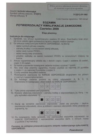 CZĘŚĆ I Zadanie 1. Na zdjęciu przedstawiono A. moduł łączący komputer z UPS. B. modem kablowy. C. kartę telewizyjną. D. kartę sieci bezprzewodowej. Zadanie 2. Na zdjęciu przedstawiono A. zaślepkę kabla światłowodowego. B. zaślepkę gniazda RJ-45. C. zastępczy wtyk RJ-45. D. terminator BNC. Zadanie 3. Zdjęcie przedstawia A. Wtyk kabla koncentrycznego. B. wtyk światłowodu. C. wtyk audio, D. przedłużacz kabla UTP. Zadanie 4. Zdjęcie przedstawia blok A. wejścia/wyjścia. B. startu/stopu. C. operacyjny. D. warunkowy. Strona 2 z 20 Zadanie 5. W szstemie Linux mamz następujące prawa dostępu do pewnego pliku rwxr--rjakim poleceniem zmienimy je na rwxrwx—? A. chmod 221 nazwapliku B. chmod 544 nazwapliku C. chmod 755 nazwapliku D. chmod 770 nazwapliku Zadanie 6. Zerowanie rejestrów procesora odbywa się poprzez A. użycie sygnału RESET. B. wyzerowanie bitów rejestru flag. C. ustawienie parametru w BlOS-ie. D. ustawienie licznika rozkazów na adresie zerowym. Zadanie 7. Nagłówek funkcji: int funkcja(void); wskazuje na to, że ta funkcja A. B. C. D. ma parametr o nazwie void i nie zwraca wartości na zewnątrz. nie ma parametru i nie zwraca wartości na zewnątrz. nie ma parametru i zwraca wartość na zewnątrz. ma parametr o nazwie vold i zwraca wartość na zewnątrz. Zadanie 8. W języku ANSI C łańcuch wprowadza się za pomocą specyflkatora A. %c B. %d C. %l D. %s Zadanie 9. Do porównywania liczb binarnych służą A. demultipleksery. B multipleksery. C. komparatory. D. sumatory. Strona 3 z 20 Zadanie 14. Monitor CRT łączy się z kartą graficzną za pomocą złącza A. PCMCIA B. D-SUB C. D-USB D.BNC Zadanie 15. Urządzenie ADSL służy do uzyskania połączenia A. cyfrowego asymetrycznego. B. cyfrowego symetrycznego. C. satelitarnego. D. radiowego. Zadanie 16. Rejestr mikroprocesora zwany licznikiem rozkazów zawiera A. liczbę cykli zegara liczoną od początku pracy programu. B. adres rozkazu przeznaczonego do wykonania jako następny. C. liczbę rozkazów pozostałych do wykonania do końca programu. D. liczbę rozkazów wykonanych przez procesor do danego momentu. Zadanie 17. Jednostką opisującą szybkość transmisji danych w sieciach komputerowych jest A. mips B. bps C. ips D. dpi Zadanie 18. Układ RAMDAC A. zawiera konwerter analogowo-cyfrowy. B. jest charakterystyczny dla standardu ATA. C. stanowi stopień wyjściowy karty graficznej. D. jest charakterystyczny dla standardu S-ATA. Strona 5 z 20 Zadanie 26. W systemie Linux polecenie ps spowoduje wyświetlenie A. konfiguracji Proxy Server. B. listy aktualnych procesów drukowania. C. konfiguracji serwera drukarek Print Server. D. listy aktualnych procesów zalogowanego użytkownika. Zadanie 27. MFT w systemie plików NTFS to A. plik zawierający Informacje dotyczące poszczególnych plików i folderów na danym woluminie. B. główny plik Indeksowy partycji. C. główny rekord rozruchowy dysku. D. tablica partycji na dysku twardym. Zadanie 2 8 . Z którym ze słów kluczowych w języku C++ wiąże się pojęcie hermetyzacja danych? A. Protected B. Constant C. Volatlle D Static Strona 7 z 20 Zadanie 29. Przekazywanie parametrów funkcji przez tzw. referencję, pozwala tej funkcji na A. usuwanie zmiennych dynamicznych. B. komunikowanie się z drukarką. C. modyfikowanie wartości zmiennych znajdujących się poza tą funkcją. D. przypisanie parametrom wartości typu rzeczywistego. Zadanie 31. W systemie Windows XP na komputerze klienckim, plik hosts jest plikiem tekstowym, który służy do mapowania A. dysków twardych. B. nazw hostów na adresy MAC C. nazw hostów na adresy iP D. nazw hostów przez serwery DNS Zadanie 32. Do połączenia kilku komputerów w sieć lokalną można użyć A. modem. B. most. C. router. D. swltch. Zadanie 33. Rekordy danej bazy danych różnią się między sobą A. treścią danych zapisanych w polach. B. liczbą pól składającą się na rekord. C. strukturą (projektem). D. nazwami pól. Strona 8 z 20 Zadanie 34. Serwer DNS jest serwerem A dzięki któremu nazwy mnemoniczne (opisowe) mogą zostać zamienione na odpowiadające im adresy IP. B. dynamicznie przydzielającym adresy IP. C. zdalnego i szyfrowanego dostępu. D. usług terminalowych. Zadanie 35. Czynności samokontrolujące komputer po włączeniu zasilania oznaczone są skrótem A. BIOS B. POST C.CPU D.MBR Zadanie 36. Magistrala, która łączy w komputerze procesor z kontrolerem pamięci, składająca się z szyny adresowej, szyny danych i linii sterujących, nosi nazwę I A. FSB - Front Side Bus. B. AGP - Accelerated Graphics Port. C. ISA - Industry Standard Architecture. D. PCI - Peripheral Component Interconnect. Zadanie 37. Określ wielkość klastra na podstawie zamieszczonego fragmentu komunikatu systemu WINDOWS wyświetlonego po zakończeniu działania programu format a: A. 12 bitów B. 0,5 KB C 512 KB D. 1 457 664 bajtów Zadanie 38. Numer IP zapisuje się w postaci czterech, oddzielonych od siebie kropkami A. bitów B. oktetów C.dekad D. hełów Strona 9 z 20 Zadanie 39. Komputer ma dostęp do Internetu poprzez sieć lokalną. Wpisując w przeglądarce internetowej adres www.wp.pl użytkownik nie ma dostępu do strony WWW, natomiast wpisanie adresu IP np. 212.77.100.101 pozwala otworzyć tę stronę. Co może być tego przyczyną? A. Brak adresu bramy. B. Brak serwera DNS. C. Brak serwera WINS. D. Brak serwera PROXY. Zadanie 40. Ile linii sygnałowych wykorzystuje Interfejs RS-232C? A. 4 B. 9 C. 12 D. 25 Zadanie 41. Systemy operacyjne z rodziny Unux rozprowadzane są na podstawie licencji A. komercyjnej. B. GNU C. MOLP D. shareware. Zadanie 42. Który z wymienionych adresów IP v.4 jest adresem klasy C? A. 10.0.2.0 B. 223.0.10.1 C. 191.11.0.10 D. 126.110.10.0 Strona 10 z 20 Zadanie 43. Adres IP v.4 ma długość A. 2 bajty. B. 10 bajtów. C. 16 bitów. D. 32 bitów. Zadanie 44. Protokół SMTP służy do A. zdalnej pracy na odległym komputerze. B. odbioru poczty elektronicznej z serwera po