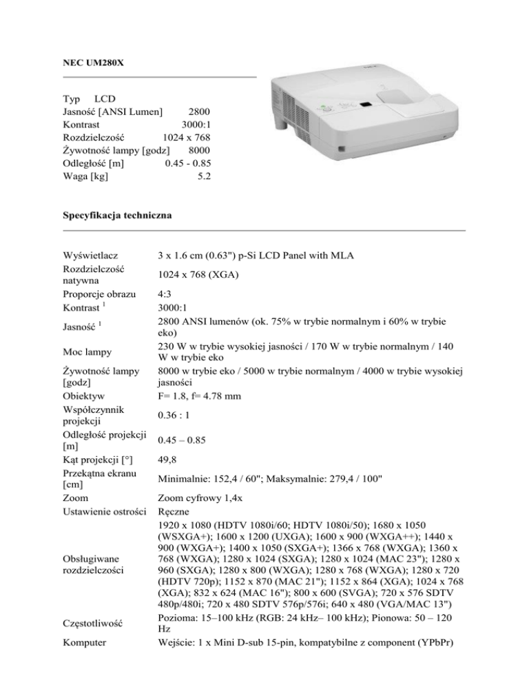 NEC UM280X Typ LCD Jasność [ANSI Lumen] 2800 Kontrast 3000:1 Rozdzielczość 1024 x 768 Żywotność lampy [godz] 8000 Odległość [m] 0.45 - 0.85 Waga [kg] 5.2 Specyfikacja techniczna Wyświetlacz Rozdzielczość natywna Proporcje obrazu Kontrast 1 Jasność 1 Moc lampy Żywotność lampy [godz] Obiektyw Współczynnik projekcji Odległość projekcji [m] Kąt projekcji [°] Przekątna ekranu [cm] Zoom Ustawienie ostrości Obsługiwane rozdzielczości Częstotliwość Komputer 3 x 1.6 cm (0.63") p-Si LCD Panel with MLA 1024 x 768 (XGA) 4:3 3000:1 2800 ANSI lumenów (ok. 75% w trybie normalnym i 60% w trybie eko) 230 W w trybie wysokiej jasności / 170 W w trybie normalnym / 140 W w trybie eko 8000 w trybie eko / 5000 w trybie normalnym / 4000 w trybie wysokiej jasności F= 1.8, f= 4.78 mm 0.36 : 1 0.45 – 0.85 49,8 Minimalnie: 152,4 / 60"; Maksymalnie: 279,4 / 100" Zoom cyfrowy 1,4x Ręczne 1920 x 1080 (HDTV 1080i/60; HDTV 1080i/50); 1680 x 1050 (WSXGA+); 1600 x 1200 (UXGA); 1600 x 900 (WXGA++); 1440 x 900 (WXGA+); 1400 x 1050 (SXGA+); 1366 x 768 (WXGA); 1360 x 768 (WXGA); 1280 x 1024 (SXGA); 1280 x 1024 (MAC 23"); 1280 x 960 (SXGA); 1280 x 800 (WXGA); 1280 x 768 (WXGA); 1280 x 720 (HDTV 720p); 1152 x 870 (MAC 21"); 1152 x 864 (XGA); 1024 x 768 (XGA); 832 x 624 (MAC 16"); 800 x 600 (SVGA); 720 x 576 SDTV 480p/480i; 720 x 480 SDTV 576p/576i; 640 x 480 (VGA/MAC 13") Pozioma: 15–100 kHz (RGB: 24 kHz– 100 kHz); Pionowa: 50 – 120 Hz Wejście: 1 x Mini D-sub 15-pin, kompatybilne z component (YPbPr) (analogowe) HDMI™ Sygnał video S-Video Audio PC Control LAN USB Video Funkcje pilota Zasilanie Pobór mocy [W] Wymiary [mm] Waga [kg] Poziom szumu [dB (A)] Temperatura otoczenia podczes pracy [°C] Wilgotność otoczenia podczas pracy [%] Temperatura przy przechowywaniu [°C] Wilgotność przy przechowywaniu [%] Dostępne akcesoria Bezpieczeństwo i ergonomia Głośniki [W] Na projektor Na lampę Zawartość opakowania Wyjście: 1 x Mini D-sub 15 pin Wejście: 2 x HDMI™ (głębia koloru, synchronizacja obrazu i dźwięku) Wejście: 1 x RCA Wejście: 1 x Mini DIN 4-pin Wejście: 1 x 3.5 mm Stereo Mini Jack; Gniazdo mikrofonowe 3,5 mm: 1 szt.; 2 x RCA Stereo Wyjście: 1 x 3.5 mm Stereo Mini Jack (variable) Wejście: 1 x D-Sub 9 pin (RS-232) (męskie) 1 x RJ45 1 x Type B; 2 x Type A (USB 2.0 high speed) PAL; PAL60; NTSC; NTSC 3.58; SECAM; NTSC 4.43; PAL-N; PALM Automatyczne dostosowanie geometrii obrazu; Bezpośredni wybór wejścia sygnału; Dostosowanie obrazu; Help-function; Kontrola audio; Numer ID; Prezentacja i sterowanie myszką; Proporcje obrazu; Tryb Help Eco; Wyciszenie AV; Zatrzymanie obrazu; Zoom cyfrowy 100-240 V AC; 50 - 60 Hz 304 (tryb wysokiej jasności); 235 (Normal) / 212 (ECO) / 8 (Network Stand-by) / 0,4 (Stand-by) 378 x 112 x 428 (bez nóżek i obiektywu) 5.2 28 / 28 / 35 (w eko / normal / w wysokiej jasności) 5 do 40 20 do 80 non-condensing -10 do 50 20 do 80 non-condensing bezprzewodowy moduł LAN (NP02LM2/3); Lampa (NP16LP-UM); Moduł interaktywny (NP02Wi); Odbiornik myszy (NP01MR) CE; TÜV GS; RoHS ; TCO ; Gost-R 1 x 16 (mono) 3 lata (gwarancja europejska) 6 miesięcy, maksymalnie. 1000 godzin Pilot (RD-448E); Kabel Sygnałowy Mini D-SUB; Kabel zasilający (3 m); Security Sticker; Zestaw do montażu na ścianie NP04WK; Podręcznik użytkownika na płycie CD; Krótka instrukcja obsługi Certyfikaty CE Gost-R RoHS TCO TÜV GS