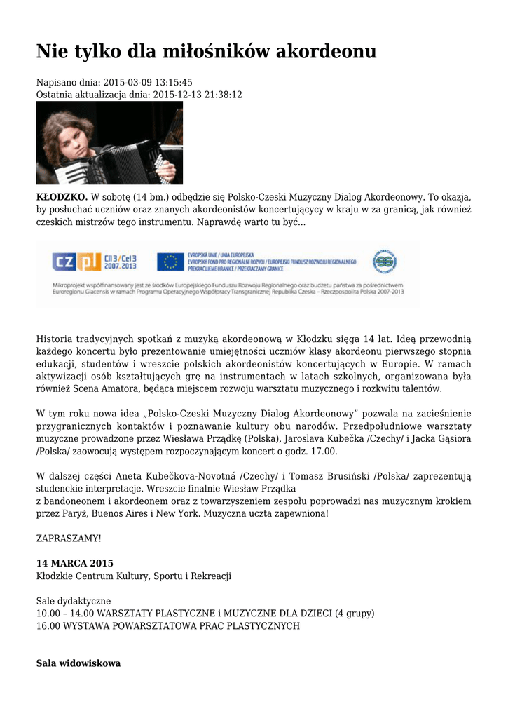 Nie tylko dla miłośników akordeonu Napisano dnia: 2015-03-09 13:15:45 Ostatnia aktualizacja dnia: 2015-12-13 21:38:12 KŁODZKO. W sobotę (14 bm.) odbędzie się Polsko-Czeski Muzyczny Dialog Akordeonowy. To okazja, by posłuchać uczniów oraz znanych akordeonistów koncertującycy w kraju w za granicą, jak również czeskich mistrzów tego instrumentu. Naprawdę warto tu być... Historia tradycyjnych spotkań z muzyką akordeonową w Kłodzku sięga 14 lat. Ideą przewodnią każdego koncertu było prezentowanie umiejętności uczniów klasy akordeonu pierwszego stopnia edukacji, studentów i wreszcie polskich akordeonistów koncertujących w Europie. W ramach aktywizacji osób kształtujących grę na instrumentach w latach szkolnych, organizowana była również Scena Amatora, będąca miejscem rozwoju warsztatu muzycznego i rozkwitu talentów. W tym roku nowa idea „Polsko-Czeski Muzyczny Dialog Akordeonowy” pozwala na zacieśnienie przygranicznych kontaktów i poznawanie kultury obu narodów. Przedpołudniowe warsztaty muzyczne prowadzone przez Wiesława Prządkę (Polska), Jaroslava Kubečka /Czechy/ i Jacka Gąsiora /Polska/ zaowocują występem rozpoczynającym koncert o godz. 17.00. W dalszej części Aneta Kubečkova-Novotná /Czechy/ i Tomasz Brusiński /Polska/ zaprezentują studenckie interpretacje. Wreszcie finalnie Wiesław Prządka z bandoneonem i akordeonem oraz z towarzyszeniem zespołu poprowadzi nas muzycznym krokiem przez Paryż, Buenos Aires i New York. Muzyczna uczta zapewniona! ZAPRASZAMY! 14 MARCA 2015 Kłodzkie Centrum Kultury, Sportu i Rekreacji Sale dydaktyczne 10.00 – 14.00 WARSZTATY PLASTYCZNE i MUZYCZNE DLA DZIECI (4 grupy) 16.00 WYSTAWA POWARSZTATOWA PRAC PLASTYCZNYCH Sala widowiskowa 17.00 PREZENTACJA UCZESTNIKÓW WARSZTATÓW MUZYCZNYCH WYSTĘPY MŁODYCH SOLISTÓW: Aneta Kubečková-Novotná (Czechy) Tomasz Brusiński (Polska) KONCERT QUARTET Wiesława Prządki "Buenos Aires, Paryż, New York" Wiesław Prządka (akordeon, bandoneon) Rafał Karasiewicz (fortepian) Jakub Olejnik (kontrabas) Zbigniew Lewandowski (instrumenty perkusyjne) W programie: tanga Astora Piazzolli, muzyka Richarda Galliano, najpiękniejsze walce Paryża, piosenki Édith Piaf oraz największe przeboje George’a Gershwina Prowadzenie koncertu: Liliana Stopka Wstęp wolny www.centrum.klodzko.pl facebook: F/kcksir Wykonawcy: Jacek Gąsior – dyrektor Państwowej Szkoły Muzycznej I st. w Oławie i nauczyciel w Ogólnokształcącej Szkole Muzycznej I i II st. we Wrocławiu Jaroslav Kubeček – nauczyciel Artystycznej Szkoły Podstawowej w Nachodzie i w Czerwonym Kostelcu Aneta Kubečková-Novotná – ukończyła studia w Państwowym Konserwatorium w Pardubicach i obecnie studiuje na trzecim roku w Wyższej Szkole Sztuk Muzycznych w Bratysławie na Słowacji. Tomasz Brusiński – absolwent PSM I st. w Kłodzku w roku 2013 w klasie akordeonu Liliany Stopki, obecnie student II roku Akademii Muzycznej we Wrocławiu. Wiesław Prządka – twórca i kierownik artystyczny wielu zespołów i projektów muzycznych m.in.: MUSETTE QUARTET, NEW MUSETTE QUARTET, GIPSY SWING. Sam zwykł mawiać, że urodził się po to, aby grać na akordeonie. . Zakochany w muzyce francuskiej artysta, któremu w duszy rozbrzmiewa namiętne tango. Ta muzyka doprowadziła go do kolejnego odkrycia – BANDONEONU, instrumentu charakterystycznego dla tanga. Jak dotąd jest jedynym bandoneonistą w Polsce koncertującym na bandoneonie diatonicznym. Grając tango, a szczególnie muzykę dziś bardzo popularnego Astora Piazzolli, współpracuje z międzynarodowym zespołem Distango. Jako wszechstronny artysta koncertuje na estradach całej Europy, a także w Stanach Zjednoczonych. Ma na swoim koncie wiele płyt nagranych z własnym zespołem New Musette Quartet, z zespołem Hot Swing, New Tango Bridge, oraz wybitnymi wokalistami i orkiestrami. ORGANIZATORZY Kłodzkie Centrum Kultury, Sportu i Rekreacji Artystyczna Szkoła Podstawowa w Nachodzie PATRONAT HONOROWY Burmistrz Miasta Kłodzka Michał Piszko PARTNER Państwowa Szkoła Muzyczna I st. im. F. Chopina w Kłodzku.