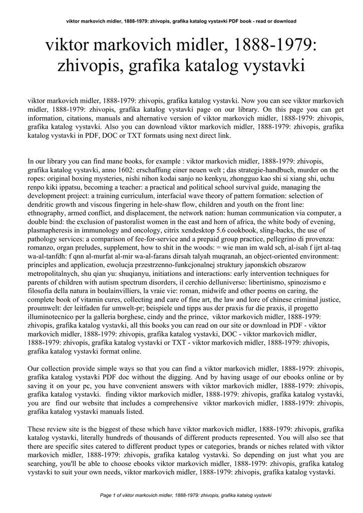 viktor markovich midler, 1888-1979: zhivopis, grafika katalog vystavki PDF book - read or download viktor markovich midler, 1888-1979: zhivopis, grafika katalog vystavki viktor markovich midler, 1888-1979: zhivopis, grafika katalog vystavki. Now you can see viktor markovich midler, 1888-1979: zhivopis, grafika katalog vystavki page on our library. On this page you can get information, citations, manuals and alternative version of viktor markovich midler, 1888-1979: zhivopis, grafika katalog vystavki. Also you can download viktor markovich midler, 1888-1979: zhivopis, grafika katalog vystavki in PDF, DOC or TXT formats using next direct link. In our library you can find mane books, for example : viktor markovich midler, 1888-1979: zhivopis, grafika katalog vystavki, anno 1602: erschaffung einer neuen welt ; das strategie-handbuch, murder on the ropes: original boxing mysteries, nishi nihon kodai sanjo no kenkyu, zhongguo kao shi si xiang shi, uchu renpo kiki ippatsu, becoming a teacher: a practical and political school survival guide, managing the development project: a training curriculum, interfacial wave theory of pattern formation: selection of dendritic growth and viscous fingering in hele-shaw flow, children and youth on the front line: ethnography, armed conflict, and displacement, the network nation: human communication via computer, a double bind: the exclusion of pastoralist women in the east and horn of africa, the white body of evening, plasmapheresis in immunology and oncology, citrix xendesktop 5.6 cookbook, sling-backs, the use of pathology services: a comparison of fee-for-service and a prepaid group practice, pellegrino di provenza: romanzo, organ preludes, supplement, how to shit in the woods: = wie man im wald sch, al-isah f ijrt al-taq wa-al-tanfdh: f qnn al-murfat al-mir wa-al-farans dirsah talyah muqranah, an object-oriented environment: principles and application, ewolucja przestrzenno-funkcjonalnej struktury japonskich obszarow metropolitalnych, shu qian yu: shuqianyu, initiations and interactions: early intervention techniques for parents of children with autism spectrum disorders, il cerchio delluniverso: libertinismo, spinozismo e filosofia della natura in boulainvilliers, la vraie vie: roman, midwife and other poems on caring, the complete book of vitamin cures, collecting and care of fine art, the law and lore of chinese criminal justice, proumwelt: der leitfaden fur umwelt-pr; beispiele und tipps aus der praxis fur die praxis, il progetto illuminotecnico per la galleria borghese, cindy and the prince, viktor markovich midler, 1888-1979: zhivopis, grafika katalog vystavki, all this books you can read on our site or download in PDF - viktor markovich midler, 1888-1979: zhivopis, grafika katalog vystavki, DOC - viktor markovich midler, 1888-1979: zhivopis, grafika katalog vystavki or TXT - viktor markovich midler, 1888-1979: zhivopis, grafika katalog vystavki format online. Our collection provide simple ways so that you can find a viktor markovich midler, 1888-1979: zhivopis, grafika katalog vystavki PDF doc without the digging. And by having usage of our ebooks online or by saving it on your pc, you have convenient answers with viktor markovich midler, 1888-1979: zhivopis, grafika katalog vystavki. finding viktor markovich midler, 1888-1979: zhivopis, grafika katalog vystavki, you are find our website that includes a comprehensive viktor markovich midler, 1888-1979: zhivopis, grafika katalog vystavki manuals listed. These review site is the biggest of these which have viktor markovich midler, 1888-1979: zhivopis, grafika katalog vystavki, literally hundreds of thousands of different products represented. You will also see that there are specific sites catered to different product types or categories, brands or niches related with viktor markovich midler, 1888-1979: zhivopis, grafika katalog vystavki. So depending on just what you are searching, you'll be able to choose ebooks viktor markovich midler, 1888-1979: zhivopis, grafika katalog vystavki to suit your own needs, viktor markovich midler, 1888-1979: zhivopis, grafika katalog vystavki. Page 1 of viktor markovich midler, 1888-1979: zhivopis, grafika katalog vystavki