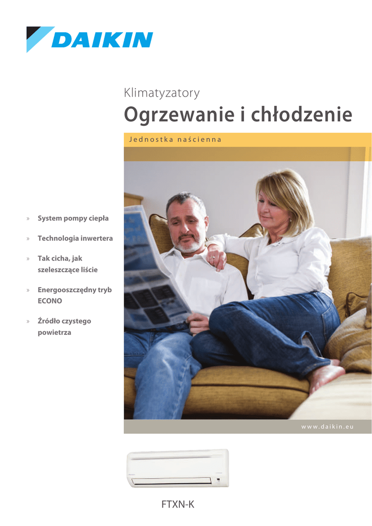 Klimatyzatory Ogrzewanie i chłodzenie Jednostka naścienna » System pompy ciepła » Technologia inwertera » Tak cicha, jak szeleszczące liście » Energooszczędny tryb ECONO » Źródło czystego powietrza w w w.daik in.eu FTXN-K Dla każdego domu, dla każdego pomieszczenia Jednostki naścienne Daikin są idealnym rozwiązaniem przy odnawianiu pomieszczenia. Mają nowoczesne wzornictwo i wygląd oraz działają wyjątkowo cicho. Są energooszczędne i tworzą komfortowy klimat w salonie, kuchni lub sypialni, w dzień i w nocy – przez cały rok. Te montowane na ścianie pompy ciepła są uniwersalnymi rozwiązaniami grzania i chłodzenia zapewniającymi komfortowe ciepło w zimie i chłód w lato. Jednostkę wewnętrzną można używać w układzie pojedynczym, z jednym urządzeniem wewnętrznym połączonym z jednym urządzeniem zewnętrznym. Połączenie najwyższej sprawności Technologia inwertera i całorocznego komfortu Technologia inwertera firmy Daikin to prawdziwa innowacja w sterowaniu klimatyzacją. Zasada jest prosta: inwerter reguluje z systemem pompy ciepła wykorzystywaną moc bieżących wymagań - tylko tyle! Ta technologia daje dwie konkretne korzyści: Komfort Inwerter zapewnia szybki zwrot poniesionych kosztów przez zwiększenie komfortu. System klimatyzacji z inwerterem 3/4 kW reguluje parametry grzania i chłodzenia w celu dostosowania temperatura otoczenia + 4/4 kW do temperatury w pomieszczeniu, podwyższając w ten sposób poziom komfortu. Inwerter skraca czas rozruchu energia systemu pozwalając na osiągniecie wymaganej temperatury 1/4 kW w pomieszczeniu w krótszym czasie. Po uzyskaniu właściwej temperatury, inwerter gwarantuje jej utrzymanie na tym poziomie. elektryczność Energooszczędne Ponieważ inwerter monitoruje i reguluje temperaturę otoczenia wtedy kiedy jest to konieczne, zużycie energii spada o 30% Czy wiesz, że ... w porównaniu do tradycyjnych systemów! (bez inwertera). Klimatyzatory, znane również jako pompy ciepła, 75% mocy uzyskują ze źródeł odnawialnych: powietrza atmosferycznego, które jest zarówno zasobem odnawialnym jak i niewyczerpanym. Oczywiście pompy ciepła do pracy wymagają również elektryczności, Tryb grzania: Temperatura/pobór mocy lecz w coraz większym stopniu tę elektryczność można również generować ze źródeł odnawialnych (energia słoneczna, energia wiatru, hydroenergia i biomasa). Sprawność pompy ciepła określa COP (współczynnik efektywności energetycznej ) dla grzania i EER (wskaźnik efektywności energetycznej chłodniczej) dla chłodzenia. *EU objective COM (2008)/30 Stabilna temperatura Wolny rozruch Klimatyzacja bez inwertera Ustawienie temp. Klimatyzacja z inwerterem Czas Uczucie komfortu dla każdego domu i każdego pomieszczenia Po wybraniu trybu oszczędzania energii ECONO pobór energii elektrycznej spada tak, że można korzystać z innych urządzeń, które potrzebują wyższej mocy (FTXN25,35K). Oszczędność energii w trybie gotowości: w trybie gotowości pobór prądu jest obniżony o około 80% (FTXN25,35K). Oszczędzanie energii dzięki korzystaniu z trybu nocnego, który zapobieganiu przegrzaniu i przechłodzeniu. Tryb komfortowy gwarantuje operację bez przeciągów w trybie ogrzewania; ciepłe powietrze jest kierowane na podłogę. W trybie chłodzenia, zimne powietrze jest kierowane na sufit (FTXN25,35K). Funkcja auto swing w kierunku pionowym: jednostka ta umożliwia wybranie automatycznej zmiany kierunku nawiewu w kierunku pionowym (auto swing), która zapewnia równomierne rozprowadzenie powietrza i jednakową temperaturę w pomieszczeniu. Wbudowana inteligencja Łatwy w obsłudze zdalny sterownik bezprzewodowy wyposażony Zdalny sterownik bezprzewodowy (standard) ARC433A8 jest w programowany włącznik/wyłącznik czasowy. Szybkie podgrzanie lub ochłodzenie pomieszczenia w 20 minut w trybie pełnej mocy. Po tym czasie jednostka wraca do ustawień początkowych. Cicha praca: dźwięk emitowany przez jednostki wewnętrzne jest na tak niskim poziomie, że można go porównywać z szeleszczącymi liśćmi (dla FTXN25K hałas obniżony do 22 dbA). Źródło czystego powietrza Tytanowo-apatytowy fotokatalityczny filtr powietrza nie tylko zatrzymuje kurz i pochłania nieprzyjemne zapachy, ale niszczy także bakterie i wirusy, zapewniając czystsze powietrze. Czyste powietrze Zanieczyszczone powietrze Filtr powietrza: zatrzymuje kurz Tytanowo-apatytowy fotokatalityczny filtr oczyszczający powietrze: pochłania drobne cząsteczki, usuwa nieprzyjemne zapachy oraz likwiduje bakterie i wirusy. Ogrzewanie i chłodzenie Jednostka wewnętrzna Wydajność chłodnicza Min./Nom./Maks. Wydajność grzewcza Min./Nom./Maks. Pobór mocy Chłodzenie Min./Nom./Maks. Ogrzewanie Min./Nom./Maks. EER COP Roczne zużycie energii Klasa energetyczna Chłodzenie / grzanie Obudowa Kolor Wysokość x Szerokość x Długość Wymiary Jednostka Masa Jednostka Wentylator Chłodzenie Wys./Nom./Nis./Cicha - natężenie praca przepływu Ogrzewanie Wys./Nom./Nis./Cicha powietrza praca Poziom ciśnienia Chłodzenie Nom. akustycznego Ogrzewanie Nom. Poziom ciśnienia Chłodzenie Wys./Nom./Nis./Cicha akustycznego praca Ogrzewanie Wys./Nom./Nis./Cicha praca Połączenia Ciecz Śr. zew. instalacji rurowej Gaz Śr. zew. Spust Śr. zew. Zasilanie Liczba faz / Częstotliwość / Napięcie kW kW kW kW kWh FTXN25K 1,3/2,5 (3)/2,8 1,3/2,8 (4)/3,5 0,310/0,795/1,040 0,260/0,82/1,030 3,13 3,41 398 FTXN35K 1,3/3,20 (3)/3,5 1,3/3,5 (4)/3,7 0,310/1,060/1,480 0,260/1,020/1,200 3,02 3,43 530 FTXN50K 1,7/5,0 (3)/5,7 1,7/5,5 (4)/6,8 0,322/1,560/2,005 0,319/1,570/2,285 3,21 3,50 780 A/B B/B FTXN60K 1,7/6,0 (3)/6,5 1,7/6,3 (4)/7,6 0,341/1,990/2,418 0,328/1,850/2,642 3,02 3,41 995 B/B Biały mm kg m³/min m³/min dBA dBA dBA dBA 283x770x198 8 290x1050x238 12 9,2/6,9/4,6/3,9 9,6/7,5/5,6/4,5 14,7/12,4/10,3/9,5 16,2/13,6/11,4/10,2 9,8/7,9/6,0/5,3 10,1/8,3/6,4/5,7 16,1/13,9/11,5/10,2 17,4/15,1/12,7/11,4 56 56 57 57 59