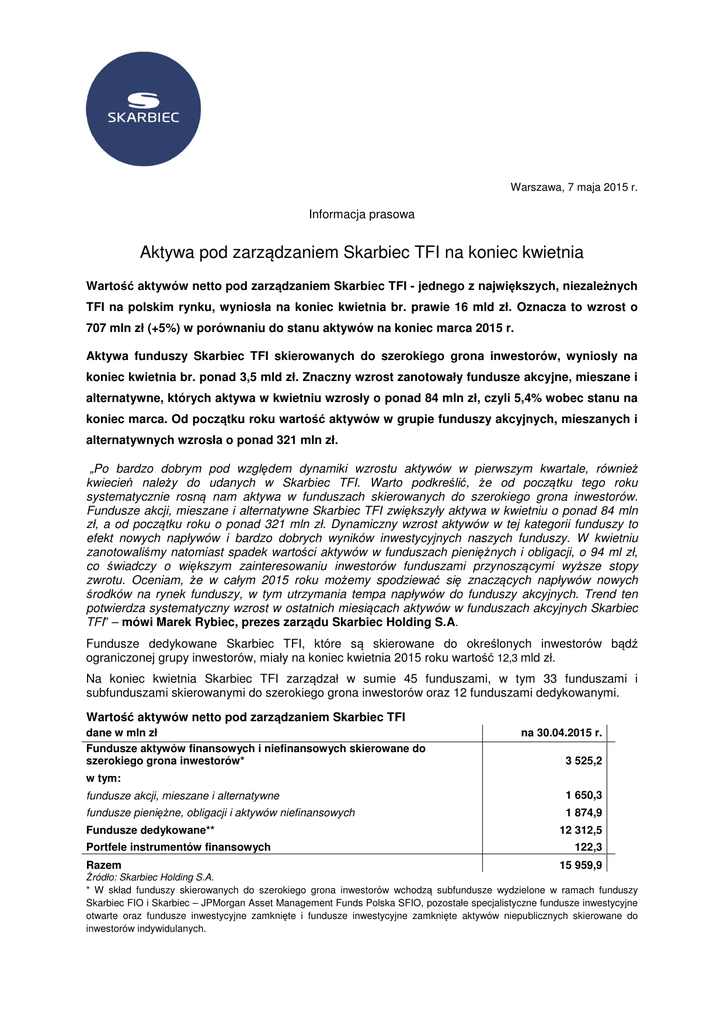 Warszawa, 7 maja 2015 r. Informacja prasowa Aktywa pod zarządzaniem Skarbiec TFI na koniec kwietnia Wartość aktywów netto pod zarządzaniem Skarbiec TFI - jednego z największych, niezależnych TFI na polskim rynku, wyniosła na koniec kwietnia br. prawie 16 mld zł. Oznacza to wzrost o 707 mln zł (+5%) w porównaniu do stanu aktywów na koniec marca 2015 r. Aktywa funduszy Skarbiec TFI skierowanych do szerokiego grona inwestorów, wyniosły na koniec kwietnia br. ponad 3,5 mld zł. Znaczny wzrost zanotowały fundusze akcyjne, mieszane i alternatywne, których aktywa w kwietniu wzrosły o ponad 84 mln zł, czyli 5,4% wobec stanu na koniec marca. Od początku roku wartość aktywów w grupie funduszy akcyjnych, mieszanych i alternatywnych wzrosła o ponad 321 mln zł. „Po bardzo dobrym pod względem dynamiki wzrostu aktywów w pierwszym kwartale, również kwiecień należy do udanych w Skarbiec TFI. Warto podkreślić, że od początku tego roku systematycznie rosną nam aktywa w funduszach skierowanych do szerokiego grona inwestorów. Fundusze akcji, mieszane i alternatywne Skarbiec TFI zwiększyły aktywa w kwietniu o ponad 84 mln zł, a od początku roku o ponad 321 mln zł. Dynamiczny wzrost aktywów w tej kategorii funduszy to efekt nowych napływów i bardzo dobrych wyników inwestycyjnych naszych funduszy. W kwietniu zanotowaliśmy natomiast spadek wartości aktywów w funduszach pieniężnych i obligacji, o 94 ml zł, co świadczy o większym zainteresowaniu inwestorów funduszami przynoszącymi wyższe stopy zwrotu. Oceniam, że w całym 2015 roku możemy spodziewać się znaczących napływów nowych środków na rynek funduszy, w tym utrzymania tempa napływów do funduszy akcyjnych. Trend ten potwierdza systematyczny wzrost w ostatnich miesiącach aktywów w funduszach akcyjnych Skarbiec TFI” – mówi Marek Rybiec, prezes zarządu Skarbiec Holding S.A. Fundusze dedykowane Skarbiec TFI, które są skierowane do określonych inwestorów bądź ograniczonej grupy inwestorów, miały na koniec kwietnia 2015 roku wartość 12,3 mld zł. Na koniec kwietnia Skarbiec TFI zarządzał w sumie 45 funduszami, w tym 33 funduszami i subfunduszami skierowanymi do szerokiego grona inwestorów oraz 12 funduszami dedykowanymi. Wartość aktywów netto pod zarządzaniem Skarbiec TFI dane w mln zł Fundusze aktywów finansowych i niefinansowych skierowane do szerokiego grona inwestorów* na 30.04.2015 r. 3 525,2 w tym: fundusze akcji, mieszane i alternatywne 1 650,3 fundusze pieniężne, obligacji i aktywów niefinansowych 1 874,9 Fundusze dedykowane** Portfele instrumentów finansowych Razem 12 312,5 122,3 15 959,9 Źródło: Skarbiec Holding S.A. * W skład funduszy skierowanych do szerokiego grona inwestorów wchodzą subfundusze wydzielone w ramach funduszy Skarbiec FIO i Skarbiec – JPMorgan Asset Management Funds Polska SFIO, pozostałe specjalistyczne fundusze inwestycyjne otwarte oraz fundusze inwestycyjne zamknięte i fundusze inwestycyjne zamknięte aktywów niepublicznych skierowane do inwestorów indywidulanych. ** Fundusze dedykowane definiowane są jako fundusze, których uczestnikiem jest jeden określony inwestor bądź ograniczona grupa inwestorów. Charakteryzują się indywidualną polityką inwestycyjną oraz warunkami dystrybucji, opracowanymi w porozumieniu z uczestnikami. Skarbiec TFI S.A. jest jedną z najlepiej rozpoznawalnych marek na rynku zarządzania aktywami w Polsce. Od powstania w 1997 roku Skarbiec TFI wyróżniał się innowacyjnością. Jako pierwsze towarzystwo funduszy inwestycyjnych Skarbiec wprowadziło na rynek kilkanaście innowacji produktowych - w tym pierwszy polski fundusz parasolowy, fundusz inwestycyjny zamknięty, fundusz wierzytelności medycznych oraz pierwszy fundusz nieruchomości mieszkaniowych. O sile marki świadczy też nawiązywanie współpracy przez Skarbiec TFI z renomowanymi, światowymi instytucjami finansowymi, takimi jak JP Morgan Asset Management, z którym utworzyło fundusz parasolowy Skarbiec – JPMorgan Asset Management Funds Polska SFIO. Najnowszym w ofercie Skarbiec TFI jest Fundusz Skarbiec-FOOTBALL FIZAN – jedyny tego typu produkt na świecie. Fundusz powstał z myślą o wspieraniu rozwoju polskich klubów piłkarskich przy jednoczesnym zaoferowaniu inwestorom Funduszu, udziału w zyskach z polityki transferowej. Jedną z ważniejszych przewag konkurencyjnych Skarbiec TFI jest dostęp do największej sieci dystrybucji jednostek uczestnictwa funduszy w Polsce. Dystrybucja funduszy Skarbiec TFI prowadzona jest za pośrednictwem 10 banków, 13 domów maklerskich, 15 towarzystw ubezpieczeniowych i kilkudziesięciu innych firm oferujących produkty finansowe. Skarbiec TFI posiada także 2 internetowe kanały dystrybucji – w tym platformę transakcyjną www.Skarbiec24.pl. Kolejną przewagą nad konkurencją jest szeroka paleta produktów dopasowanych do sytuacji makroekonomicznej oraz trendów na rynkach. Umiejętność dywersyfikacji aktywów skutkuje stabilnością biznesu i uzyskiwaniem satysfakcjonujących stóp zwrotu na zarządzanych funduszach. Klienci nabywający jednostki uczestnictwa funduszy Skarbiec TFI charakteryzują się wysoką lojalnością. Średni okres inwestycji przekracza 8 lat. Jednym z najważniejszych czynników, wpływających na rozwój biznesu zarządzania aktywami jest proces podejmowania decyzji inwestycyjnych przez zespół menadżerów i zarządzających. W Skarbiec TFI decyzje inwestycyjne podejmowane są w oparciu o zespołowy model zarządzania. Taki model jest bardzo efektywny i ma pozytywny wpływ na poziom wyników osiąganych przez zarządzane fundusze. *** Skarbiec Holding S.A. jest grupą, której przedmiotem działalności jest zarządzanie funduszami inwestycyjnymi (fundusze inwestycyjne otwarte, specjalistyczne fundusze inwestycyjne otwarte, fundusze inwestycyjne zamknięte) oraz usługi zarządzania portfelami instrumentów finansowych na zlecenie. Skarbiec Holding jes