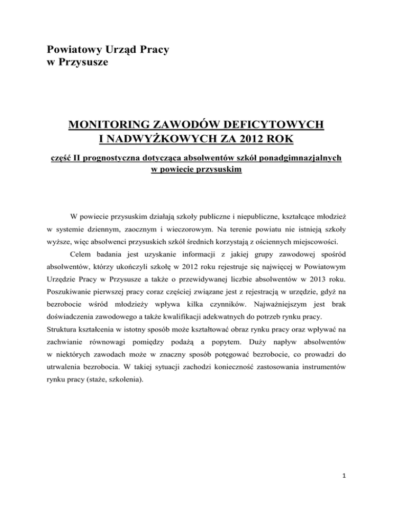 Powiatowy Urząd Pracy w Przysusze MONITORING ZAWODÓW DEFICYTOWYCH I NADWYŻKOWYCH ZA 2012 ROK część II prognostyczna dotycząca absolwentów szkół ponadgimnazjalnych w powiecie przysuskim W powiecie przysuskim działają szkoły publiczne i niepubliczne, kształcące młodzież w systemie dziennym, zaocznym i wieczorowym. Na terenie powiatu nie istnieją szkoły wyższe, więc absolwenci przysuskich szkół średnich korzystają z ościennych miejscowości. Celem badania jest uzyskanie informacji z jakiej grupy zawodowej spośród absolwentów, którzy ukończyli szkołę w 2012 roku rejestruje się najwięcej w Powiatowym Urzędzie Pracy w Przysusze a także o przewidywanej liczbie absolwentów w 2013 roku. Poszukiwanie pierwszej pracy coraz częściej związane jest z rejestracją w urzędzie, gdyż na bezrobocie wśród młodzieży wpływa kilka czynników. Najważniejszym jest brak doświadczenia zawodowego a także kwalifikacji adekwatnych do potrzeb rynku pracy. Struktura kształcenia w istotny sposób może kształtować obraz rynku pracy oraz wpływać na zachwianie równowagi pomiędzy podażą a popytem. Duży napływ absolwentów w niektórych zawodach może w znaczny sposób potęgować bezrobocie, co prowadzi do utrwalenia bezrobocia. W takiej sytuacji zachodzi konieczność zastosowania instrumentów rynku pracy (staże, szkolenia). 1 ABSOLWENCI ZAREJESTROWANI W PUP W POWIECIE PRZYSUSKIM WEDŁUG SZKÓŁ I ZAWODÓW W ROKU 2012 ORAZ PRZEWIDYWANI ABSOLWENCI W ROKU 2013 T-1 Lp Nazwa szkoły 1 1 2 3 4 5 6 7 8 9 10 11 Absolwenci, którzy ukończyli Kod szkołę w zawodu Nazwa zawodu roku 2012 2 3 4 5 Szkoły policealne Prywatna Szkoła Policealna dla Dorosłych w Skrzyńsku Szkoła Policealna dla Dorosłych w Borkowicach Zaoczna Policealna Szkoła Zawodowa dla Dorosłych w Przysusze Zaoczna Policealna Szkoła Zawodowa dla Dorosłych w Przysusze Technikum w Przysusze Technikum w Lipinach Technikum w Borkowicach Technikum w Borkowicach Technikum Uzupełniające dla Dorosłych Towarzystwa Wiedzy Powszechnej w Przysusze Technikum Uzupełniające dla Dorosłych Towarzystwa Wiedzy Powszechnej w Przysusze Technikum w Przysusze Technikum w 12 Przysusze Technikum w 13 Przysusze Bezrobotni absolwenci zarejestrowani w PUP w Przewidywani końcu roku absolwenci w (6):(5) 2012 roku 2013 w% 6 7 8 Technik "334306" administracji* 12 0 8 0 "314207" Technik rolnik* 12 0 15 0 Technik bezpieczeństwa i "325509" higieny pracy* 0 0 25 0 34 0 24 0 0 20 0 0 20 0 1 9 11,1 0 11 0 9 1 12 11,1 15 5 11 33,3 25 7 36 28 61 12 33 19,7 23 3 41 13 Technik "334306" administracji* Szkoły średnie techniczne (technika, licea zawodowe) Technik "351203" informatyk* 18 Technik "331403" ekonomista* 22 Technik "331402" agrobiznesu* 9 Technik "422402" hotelarstwa* 7 Technik żywienia i gospodarstwa "322002" domowego* Technik "311504" mechanik* Technik "311504" mechanik* Technik żywienia i gospodarstwa "322002" domowego* Technik "422402" hotelarstwa* 2 Licea ogólnokształcące 14 15 16 17 18 19 20 21 22 23 Liceum Ogólnokształcące w Borkowicach Liceum Ogólnokształcące w Lipinach Zaoczne Liceum Ogólnokształcące Dla Dorosłych w Przysusze Zaoczne Prywatne Liceum Ogólnokształcące Dla Dorosłych w Skrzyńsku Prywatne Liceum Ogólnokształcące w Mariówce Liceum Ogólnokształcące w Przysusze Liceum Ogólnokształcące w Przysusze Zaoczne Uzupełniające Liceum Ogólnokształcące Dla Dorosłych W Przysusze Uzupełniające Zaoczne Prywatne Liceum Ogólnokształcące Dla Dorosłych W Skrzyńsku Liceum Profilowane w Przysusze "000000" Bez zawodu 22 9 0 40,9 "000000" Bez zawodu 33 7 35 21,2 "000000" Bez zawodu 0 0 30 0 "000000" Bez zawodu 16 6 17 37,5 "000000" Bez zawodu 16 0 12 0 "000000" Bez zawodu 181 90 179 49,7 "000000" Bez zawodu 30 22 22 73,3 "000000" Bez zawodu 0 0 31 0 "000000" Bez zawodu 0 0 25 0 "000000" Bez zawodu 24 6 19 25 47 5 28 10,6 "514101" Fryzjer* 2 0 4 0 "711202" Murarz* Mechanik pojazdów "723103" samochodowych* Mechanik monter maszyn i "723310" urządzeń* 4 0 2 0 13 4 17 30,8 14 2 0 14,3 0 0 0 0 3 3 0 0 Zasadnicze szkoły zawodowe 24 25 26 27 28 29 30 Zasadnicza Szkoła Zawodowa w Przysusze Zasadnicza Szkoła Zawodowa w Przysusze Zasadnicza Szkoła Zawodowa w Przysusze Zasadnicza Szkoła Zawodowa w Przysusze Zasadnicza Szkoła Zawodowa w Przysusze Zasadnicza Szkoła Zawodowa w Przysusze Zasadnicza Szkoła Kucharz małej "512002" gastronomii* "751201" Cukiernik* "751204" Piekarz* 3 Zawodowa w Przysusze Zasadnicza Szkoła Zawodowa w 31 Przysusze Zasadnicza Szkoła Zawodowa w 32 Przysusze "752205" Stolarz* Mechanik operator pojazdów i maszyn "834103" rolniczych* 2 1 7 50 1 0 0 0 STRUKTURA ZAWODOWA ABSOLWENTÓW WEDŁUG POZIOMU WYKSZTAŁCENIA I ZAWODÓW W POWIECIE PRZYSUSKIM W LATACH 2012 I 2013 T-2 Kod zawodu 1 "311504" "314207" "322002" "325509" "331402" "331403" "334306" "351203" "422402" Absolwenci, w tym którzy ukończyli Bezrobotni Bezrobotni szkołę na absolwenci absolwenci terenie zarejestrowani w ze szkół Przewidywani powiatu w PUP w końcu danego absolwenci w (5):(3) Nazwa zawodu roku 2012 roku 2012 powiatu roku 2013 w% 2 3 4 5 6 7 Wykształcenie policealne i średnie zawodowe Technik mechanik* 40 5 5 47 12,5 Technik rolnik* 12 0 0 15 0 Technik żywienia i gospodarstwa domowego* 70 9 1 45 1,4 Technik bezpieczeństwa i higieny pracy* 0 0 0 25 0 Technik agrobiznesu* 9 0 1 9 11,1 Technik ekonomista* 22 1 0 20 0 Technik administracji* 46 1 0 32 0 Technik informatyk* 18 0 0 20 0 Technik hotelarstwa* 30 3 0 52 0 "000000" Bez zawodu Wykształcenie średnie ogólnokształcące 322 218 162 370 50,3 Wykształcenie zasadnicze zawodowe "512002" "514101" "711202" "723103" "723310" Kucharz małej gastronomii* Fryzjer* Murarz* Mechanik pojazdów samochodowych* Mechanik - monter 47 2 4 8 2 0 5 0 0 28 4 2 10,6 0 0 13 14 7 1 4 2 17 0 30,7 14,2 4 maszyn i urządzeń* "751201" Cukiernik* "751204" Piekarz* "752205" Stolarz* Mechanik - operator pojazdów i maszyn "834103" rolniczych* 0 0 2 0 0 2 0