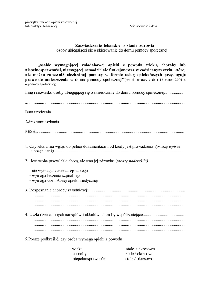 pieczątka zakładu opieki zdrowotnej lub praktyki lekarskiej Miejscowość i data ............................... Zaświadczenie lekarskie o stanie zdrowia osoby ubiegającej się o skierowanie do domu pomocy społecznej „osobie wymagającej całodobowej opieki z powodu wieku, choroby lub niepełnosprawności, niemogącej samodzielnie funkcjonować w codziennym życiu, której nie można zapewnić niezbędnej pomocy w formie usług opiekuńczych przysługuje prawo do umieszczenia w domu pomocy społecznej’’(art. 54 ustawy z dnia 12 marca 2004 r. o pomocy społecznej). Imię i nazwisko osoby ubiegającej się o skierowanie do domu pomocy społecznej.................... ....................................................................................................................................................... Data urodzenia.............................................................................................................................. Adres zamieszkania ..................................................................................................................... PESEL.......................................................................................................................................... 1. Czy lekarz ma wgląd do pełnej dokumentacji i od kiedy jest prowadzona (proszę wpisać miesiąc i rok)........................................................................................................................... 2. Jest osobą przewlekle chorą, ale stan jej zdrowia: (proszę podkreślić) - nie wymaga leczenia szpitalnego - wymaga leczenia szpitalnego - wymaga wzmożonej opieki medycznej 3. Rozpoznanie choroby zasadniczej:........................................................................................... .................................................................................................................................................. .................................................................................................................................................. .................................................................................................................................................. 4. Uszkodzenia innych narządów i układów, choroby współistniejące:....................................... .................................................................................................................................................. .................................................................................................................................................. .................................................................................................................................................. 5.Proszę podkreślić, czy osoba wymaga opieki z powodu: - wieku - choroby - niepełnosprawności stale / okresowo stale / okresowo stale / okresowo 6. Proszę podkreślić zakres świadczeń niezbędnych do zapewnienia prawidłowego funkcjonowania w środowisku osoby badanej: - pielęgnacja chorego - pielęgnacja i opieka nad niepełnosprawnym - leczenie, badania i porady lekarskie - rehabilitacja lecznicza - badania i terapia psychologiczna - wzmożona opieka medyczna stale / okresowo stale / okresowo stale / okresowo stale / okresowo stale / okresowo stale / okresowo 7. Czy istnieje konieczność konsultacji pacjenta przez: - lekarza psychiatrę tak nie - psychologa tak nie 8. Proszę podkreślić czy istnieje możliwość samodzielnego funkcjonowania w codziennym życiu przy pomocy wsparcia w formie usług opiekuńczych świadczonych w miejscu zamieszkania : tak nie 9. W przypadku domu pomocy społecznej należy określić (proszę podkreślić) typ domu ze względu na występujące schorzenia: - dla osób w podeszłym wieku - dla osób przewlekle somatycznie chorych - dla osób przewlekle psychicznie chorych - dla dorosłych niepełnosprawnych intelektualnie - dla osób niepełnosprawnych fizycznie - dla dzieci i młodzieży niepełnosprawnej intelektualnie Proszę podkreślić czy w/w Pan/i wymaga/ nie wymaga opieki osoby drugiej ze względu na niemożność samodzielnej egzystencji. ..................................................... podpis i pieczątka lekarza ZAŚWIADCZENIE PSYCHOLOGA 1. Imię i nazwisko osoby ubiegającej się o skierowanie do domu pomocy społecznej....… ……………………………………………………………………………………….….. 2. Stwierdza się upośledzenie umysłowe w stopniu…………………… IQ……………… 3. Charakterystyka osoby ubiegającej się o skierowanie do domu pomocy społecznej pod względem: a) intelektualnym……………………………………………………………………… ……………………………………………………………………………………… ……………………………………………………………………………………… ……………………………………………………………………………………… b) emocjonalnym……………………………………………………………………… ……………………………………………………………………………………… ……………………………………………………………………………………… ……………………………………………………………………………………… c) społecznym………………………………………………………………….……… ……………………………………………………………………………………… ……………………………………………………………………………………… ……………………………………………………………………………………… 4. Najbardziej charakterystyczne cechy osobowości i zachowań……………………….… …