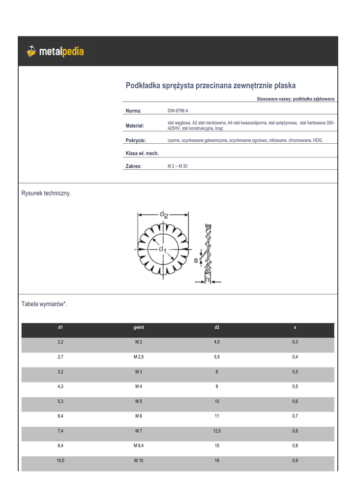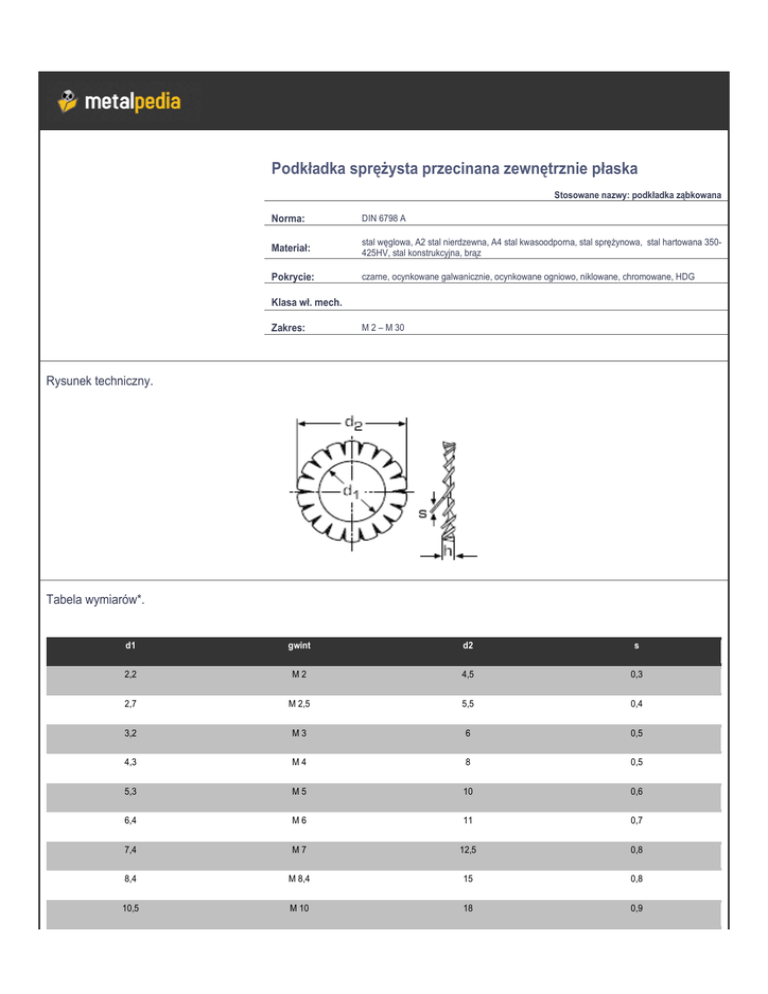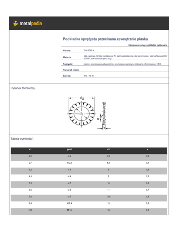 Podkładka sprężysta przecinana zewnętrznie płaska Stosowane nazwy: podkładka ząbkowana Norma: DIN 6798 A Materiał: stal węglowa, A2 stal nierdzewna, A4 stal kwasoodporna, stal sprężynowa, stal hartowana 350425HV, stal konstrukcyjna, brąz Pokrycie: czarne, ocynkowane galwanicznie, ocynkowane ogniowo, niklowane, chromowane, HDG Klasa wł. mech. Zakres: M 2 – M 30 Zastosowanie: Rysunek techniczny. Tabela wymiarów*. d1 gwint d2 s 2,2 M2 4,5 0,3 2,7 M 2,5 5,5 0,4 3,2 M3 6 0,5 4,3 M4 8 0,5 5,3 M5 10 0,6 6,4 M6 11 0,7 7,4 M7 12,5 0,8 8,4 M 8,4 15 0,8 10,5 M 10 18 0,9 13 M 12 20,5 1 15 M 14 24 1 17 M 16 26 1,2 19 M 18 30 1,4 21 M 20 33 1,4 23 M 22 36 1,5 25 M 24 38 1,5 28 M 27 44 1,6 31 M 30 48 1,6 * Prezentowane informacje stanowią wyłącznie materiał poglądowy. Serwis zastrzega sobie prawo do wystąpienia różnic w ofercie handlowej producenta.