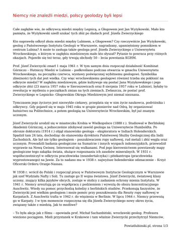 Niemcy nie znaleźli miedzi, polscy geolodzy byli lepsi Całe zagłębie wie, że odkrywcą miedzi między Legnicą, a Głogowem jest Jan Wyżykowski. Mało kto pamięta, że Wyżykowski szedł szukać tych złóż po śladach prof. Józefa Zwierzyckiego Kto naprawdę odkrył złoża miedzi między Lubinem, a Głogowem? Czy rzeczywiście Jan Wyżykowski, geolog z Państwowego Instytutu Geologii w Warszawie, nagradzany, upamiętniony pomnikiem w centrum Lubina? A może to zasługa także geologa prof. Józefa Zwierzyckiego z Uniwersytetu Wrocławskiego, o którym w zagłębiu miedziowym mało kto słyszał? Pytanie to powraca przy różnych okazjach. Pojawiło się też teraz, gdy trwają obchody 50 – lecia powstania KGHM. Prof. Józef Zwierzycki zmarł 1 maja 1961 r. W tym samym dniu rozpoczął działalność Kombinat Górniczo – Hutniczy Miedzi w Lubinie – podkreślano podczas otwarcia w gmachu Uniwersytetu Wrocławskiego, na początku czerwca, wystawy poświęconej wybitnemu geologowi. Symbolika zbieżności tych dat jest wielka. Czy więc wrocławskiemu geologowi również trzeba się pokłonić na odkrycie miedzi? W zagłębiu miedziowym, gdzie kultywuje się postać Jana Wyżykowskiego i jego odkrycie złóż (23 marca 1957 roku w Sieroszowicach oraz 8 sierpnia 1957 roku w Lubinie), byłaby to rewolucja w myśleniu o początkach zmian na tych ziemiach. Zwłaszcza, że postać prof. Zwierzyckiego w Legnicko- Głogowskim Okręgu Miedziowym jest niemal nieznana. Tymczasem jego życiorys jest niezwykle ciekawy, przeplata się w nim życie naukowca, podróżnika i odkrywcy. Gdy pojawił się w maju 1945 roku w grupie pionierów nad Odrą, by organizować hutnictwo na Politechnice, a potem geologią na Uniwersytecie Wrocławskim, był już znanym uczonym. Józef Zwierzycki urodził się w miasteczku Krobia w Wielkopolsce (1888 r.). Studiował w Berlińskiej Akademii Górniczej, a jednocześnie zdobywał zawód geologa na Uniwersytecie Humboldta. Po obronie doktoratu (1914 r.) objął stanowisko geologa – eksploratora w Indiach Holenderskich. Spędził tam 24 lata, dochodząc do stanowiska dyrektora Państwowej Służby Geologicznej dla Indii Zachodnich. Ale był nie tylko geologiem – poszukiwaczem ropy naftowej, rud metali i złóż węgla oraz uczonym. Prowadzili badania geologiczne na Sumatrze i innych wyspach indonezyjskich, przewodził wyprawie na Nową Gwineę. Interesował się wulkanami. Pod jego kierownictwem powstawały mapy geologiczne tego zakątka świata, służące rozpoznaniu ich zasobów mineralnych. W 1931 r. współuczestniczył w odkryciu praczłowieka (neandertalczyka) i pitekantropa (praczłowieka wyprostowanego) na Jawie. Za to nadano mu w 1938 r. najwyższe holenderskie odznaczenie – Krzyż Oficerski Orderu Oranje-Nassau. W 1938 r. wrócił do Polski i rozpoczął pracę w Państwowym Instytucie Geologicznym w Warszawie jak szef Wydziału Nafty i Soli. Tu zastaje go II wojna światowa. Józef Zwierzycki, światowej klasy uczony, znający kilka języków obcych, zostaje w stolicy z zadaniem ochrony mienia Instytutu. W 1941 r. Niemcy aresztują go za współpracę z podziemiem i wywożą do obozu koncentracyjnego Auschwitz. Wtedy na pomoc przychodzą koledzy z berlińskich studiów. Przekonują faszystów, że Zwierzycki jest wielkim geologiem i może pomóc przy poszukiwaniu dla Reszty ropy naftowej w Karpatach. Z Auschwitz trafia w 1942 r. do więzienia w Berlinie. W lipcu 1944 r. Niemcy przewożą go w Karpaty. I w tym momencie rozpoczyna się dla Józefa Zwierzyckiego nowy okres życia, związany także z miedzią. Jak to możliwe? – To była akcja jak z filmu – opowiada prof. Michał Sachanbiński, wrocławski geolog. Profesora wieziono pociągiem. Mieli przystanek w Krakowie i tam właśnie Zwierzycki przechytrzył Niemców, Powiatlubinski.pl, strona 1/3 uciekając im znanymi sobie zaułkami. Trafił tam do swojego dalekiego krewnego, prof. Kazimierza Maślankiewicza, także słynnego geologa. Ukrywał się w jego mieszkaniu do końca wojny, w… szafie, jak opowiadał prof. Maślankiewicz. Gospodarz zaopatrywał go w książki na temat geologii. Wtedy Zwierzycki zapoznał się z niemiecką literaturą dotyczącą także Dolnego Śląska – dodaje prof. Sachanbiński. Geolodzy zgadzają się co do jednego: Niemcy dobrze rozpoznali Sudety, odkryli złoża rud miedzi w rejonie Złotoryja – Bolesławiec, gdzie zbudowali kopalnie. Jednak tereny położone dalej na północy wschód uznali generalnie za surowcową białą plamę. – Główną zasługą prof. Zwierzyckiego było dokonanie reinterpretacji wyników badań geologów niemieckich – mówi prof. S Sachanbiński. Niemcy uznali, że obszary cechsztyńskie, zwykle bogate w miedź, kończą się na linii Złotoryja – Bolesławiec. Prof. Zwierzycki wskazywał na możliwość znalezienia złóż miedzi w monoklinie przedsudeckiej, czyli na północny wschód od linii Złotoryja – Bolesławiec, w 1951 roku, jeszcze przed rozpoczęciem systematycznych polskich badań geologiczno – poszukiwawczych na tym terenie. Ale pracami poszukiwawczymi kierował tam doc. Wyżykowski – dodaje prof. Sachanbiński. W czasach powojennej odbudowy kraju nasilały się apele władz do naukowców, by szukali złóż surowcowych. Była nawet uchwała rządu, nakazująca geologom odkrycie takich złóż! Dziś to brzmi jak żart, ale w latach 50 otwierała ona możliwości uzyskania pieniędzy na wiercenia. W takiej atmosferze postanowiono poszukać surowców mineralnych nie tylko w rejonie Sudetów czy Karpat, ale też na Niżu Polskim. W pierwszej połowie lat 50 wiele poszukiwań zakończyło się tam niepowodzeniem albo sukcesem połowiczym. Bo np. Wyżykowski odkrył ślady miedzi koło Nowej Rudy, ale była ona zbyt uboga, by ją eksploatować. Dlatego przeniósł się dalej na północny wschód, na tereny wskazywane przez prof. Zwierzyckiego. Nie od razu były sukcesy. W 1955 r. Jan Wyżykowski wykon