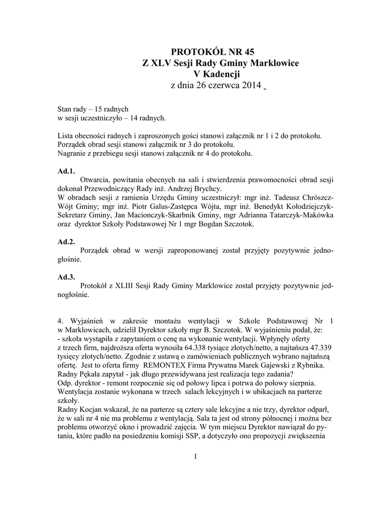PROTOKÓŁ NR 45 Z XLV Sesji Rady Gminy Marklowice V Kadencji z dnia 26 czerwca 2014 Stan rady – 15 radnych w sesji uczestniczyło – 14 radnych. Lista obecności radnych i zaproszonych gości stanowi załącznik nr 1 i 2 do protokołu. Porządek obrad sesji stanowi załącznik nr 3 do protokołu. Nagranie z przebiegu sesji stanowi załącznik nr 4 do protokołu. Ad.1. Otwarcia, powitania obecnych na sali i stwierdzenia prawomocności obrad sesji dokonał Przewodniczący Rady inż. Andrzej Brychcy. W obradach sesji z ramienia Urzędu Gminy uczestniczył: mgr inż. Tadeusz ChrószczWójt Gminy; mgr inż. Piotr Galus-Zastępca Wójta, mgr inż. Benedykt KołodziejczykSekretarz Gminy, Jan Macionczyk-Skarbnik Gminy, mgr Adrianna Tatarczyk-Makówka oraz dyrektor Szkoły Podstawowej Nr 1 mgr Bogdan Szczotok. Ad.2. Porządek obrad w wersji zaproponowanej został przyjęty pozytywnie jednogłośnie. Ad.3. Protokół z XLIII Sesji Rady Gminy Marklowice został przyjęty pozytywnie jednogłośnie. 4. Wyjaśnień w zakresie montażu wentylacji w Szkole Podstawowej Nr 1 w Marklowicach, udzielił Dyrektor szkoły mgr B. Szczotok. W wyjaśnieniu podał, że: - szkoła wystąpiła z zapytaniem o cenę na wykonanie wentylacji. Wpłynęły oferty z trzech firm, najdroższa oferta wynosiła 64.338 tysiące złotych/netto, a najtańsza 47.339 tysięcy złotych/netto. Zgodnie z ustawą o zamówieniach publicznych wybrano najtańszą ofertę. Jest to oferta firmy REMONTEX Firma Prywatna Marek Gajewski z Rybnika. Radny Pękała zapytał - jak długo przewidywana jest realizacja tego zadania? Odp. dyrektor - remont rozpocznie się od połowy lipca i potrwa do połowy sierpnia. Wentylacja zostanie wykonana w trzech salach lekcyjnych i w ubikacjach na parterze szkoły. Radny Kocjan wskazał, że na parterze są cztery sale lekcyjne a nie trzy, dyrektor odparł, że w sali nr 4 nie ma problemu z wentylacją. Sala ta jest od strony północnej i można bez problemu otworzyć okno i prowadzić zajęcia. W tym miejscu Dyrektor nawiązał do pytania, które padło na posiedzeniu komisji SSP, a dotyczyło ono propozycji zwiększenia 1 środków w celu włączenia do tego zadania, wykonania klimatyzacji. Dyrektor poinformował, że wykonawca zadania zapewnił, że przepływ powietrza będzie na tyle intensywny, że wymiana powietrza będzie skuteczna, tym samym zdąży schłodzić powietrze. Natomiast pojawiła się inna koncepcja, aby zwiększyć środki na ten cel o 15 tysięcy złotych i zabudować wentylację dwu funkcyjną, tj. ocieplania powietrza w zimie i schładzania powietrza w lecie. Radny Pękała dodał, że na komisji rewizyjnej dyskutowano na ten temat, że nie wystarczy samo schładzanie powietrza, że powinna być klimatyzacja. Odp. dyrektor - owszem, było tak mówione, ale wtedy, gdy nie brano pod uwagę systemu schładzania powietrza w lecie. Przewodniczący Rady zapytał - w jaki sposób zostanie zamontowana ta wentylacja, tzn. czy nawiewy, kratki będą zamontowane pod sufitem czy nad podsadzką, bo jest to zasadnicza różnica. Odp. dyrektor odpowiedział, że się nie zna na tym, ale rozezna tę kwestię. Radny Chrószcz zapytał - jaki będzie obieg powietrza, czy wymuszony oraz jaki będzie poziom hałasu? Odp. dyrektor - będzie to obieg wymuszony, zostanie zabudowana centrala wentylacyjna, którą pierwotnie planowano zabudować w ubikacji dla osób niepełnosprawnych, ale że tam jest za mało miejsca, ze względu na dodatkowe elementy chłodnicze, centrala zostanie zabudowana w korytarzu, pod sufitem. Jeśli chodzi o poziom szumu, to tak zostaną poszczególne elementy wentylacji zabudowane, że nie będzie z tego powodu żadnego problemu. Sterownik będzie zabudowany w sekretariacie szkoły, natomiast wyciągi wentylacyjne będą sukcesywnie obudowywane, aby nie szpeciły klas. Wentylacja zostanie wykonana tylko na parterze, aby sprawdzić, jak będzie ona funkcjonowała, jeśli się sprawdzi, wtedy szkoła wystąpi do rady o wyrażenie zgody na wykonanie wentylacji na pozostałych kondygnacjach szkoły. Radny Zając wskazał - jest to kwota 50 tysięcy złotych i żeby ktoś to sprawdził i zweryfikował, żeby za rok się nie okazało, że nie spełnia swojego zadania, radny zasugerował dołożyć do tego zadania montaż klimatyzacji. Przewodniczący Brychcy zaproponował, aby zorganizować spotkanie z oferentem, wypytać go o wszystko, aby nie zostawić dyrektora szkoły samego z tym problemem, bo im dłużej się dyskutuje, tym więcej pojawia się niejasności. Zastępca W. wskazał, aby ewentualnie przyznać większą kwotę, natomiast ostateczną decyzję pozostawić w gestii dyrektora, bo to on będzie za wszystko odpowiadał. Jeśli po wszystkich konsultacjach okaże się, że gra nie jest warta świeczki, lub że wentylacja spełniła oczekiwania, wtedy dyrektor sam zdecyduje o rozbudowie wentylacji na pozostałych kondygnacjach. W wyniku przyjętych wyjaśnień Przewodniczący Rady poddał pod głosowanie wniosek, aby przekazać 60 tysięcy złotych na wykonanie wentylacji na parterze szkoły, tj. w trzech salach lekcyjnych i w ubikacjach. Wniosek został przegłosowany pozytywnie 14 głosami. W głosowaniu udział brało 14 radnych. 2 Ad. 5. Interpelacje i zapytania radnych. Przewodniczący Rady poinformował, że w dniu dzisiejszym przed sesją wpłynęły dwa zapytania. Odpowiedzi na zapytania zostaną przygotowane na następną sesję, tj. w miesiącu sierpniu. Ad. 6. Sprawozdania: a) Sprawozdanie Wójta o wydanych zarządzeniach i decyzjach przedstawił Sekretarz Gminy. Sprawozdanie to stanowi załącznik do protokołu. Pytań do sprawozdania nie było. b) Sprawozdanie Wójta na temat zamówień publicznych i realizacji zadań inwestycyjnych przedstawił Zastępca Wójta, który wskazał, że od ostatniej sesji nie udzielono żadnego zamówienia. Zastępca W. będąc przy głosie udzielił informacji w zakresie przebiegu robót przy szkole podstawowej nr 2 w Marklowica