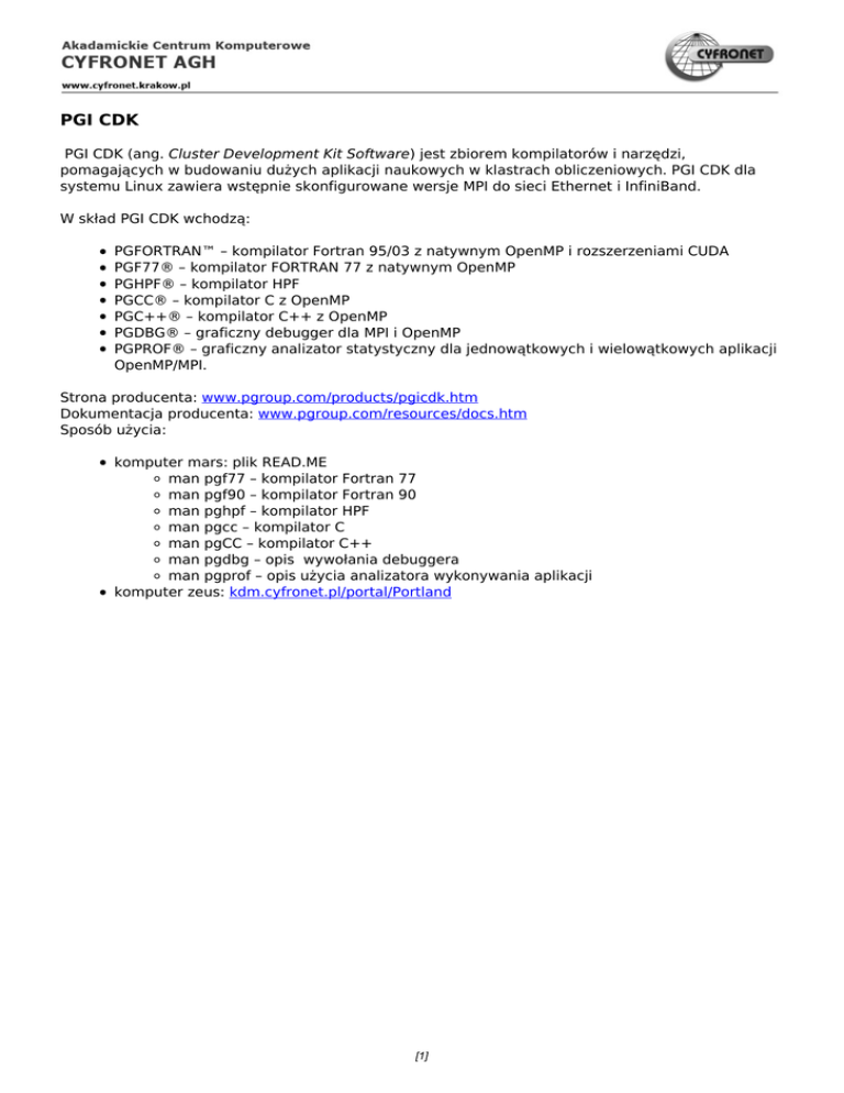 PGI CDK PGI CDK (ang. Cluster Development Kit Software) jest zbiorem kompilatorów i narzędzi, pomagających w budowaniu dużych aplikacji naukowych w klastrach obliczeniowych. PGI CDK dla systemu Linux zawiera wstępnie skonfigurowane wersje MPI do sieci Ethernet i InfiniBand. W skład PGI CDK wchodzą: PGFORTRAN™ – kompilator Fortran 95/03 z natywnym OpenMP i rozszerzeniami CUDA PGF77® – kompilator FORTRAN 77 z natywnym OpenMP PGHPF® – kompilator HPF PGCC® – kompilator C z OpenMP PGC++® – kompilator C++ z OpenMP PGDBG® – graficzny debugger dla MPI i OpenMP PGPROF® – graficzny analizator statystyczny dla jednowątkowych i wielowątkowych aplikacji OpenMP/MPI. Strona producenta: www.pgroup.com/products/pgicdk.htm Dokumentacja producenta: www.pgroup.com/resources/docs.htm Sposób użycia: komputer mars: plik READ.ME man pgf77 – kompilator Fortran 77 man pgf90 – kompilator Fortran 90 man pghpf – kompilator HPF man pgcc – kompilator C man pgCC – kompilator C++ man pgdbg – opis wywołania debuggera man pgprof – opis użycia analizatora wykonywania aplikacji komputer zeus: kdm.cyfronet.pl/portal/Portland [1] Powered by TCPDF (www.tcpdf.org)