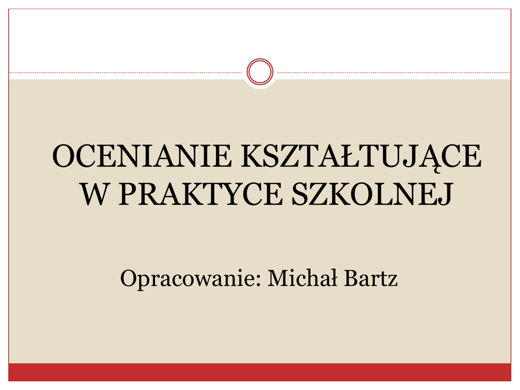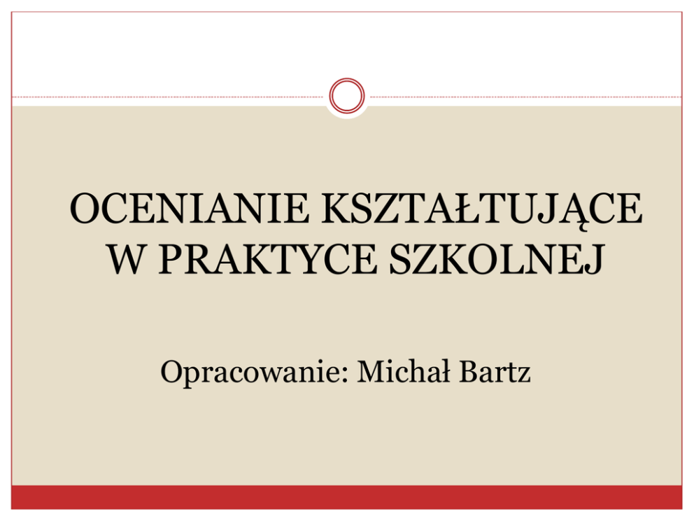 OCENIANIE KSZTAŁTUJĄCE W PRAKTYCE SZKOLNEJ Opracowanie: Michał Bartz 1. Rzeczywistość szkolna i ocenianie uczniów Uczniowie nie są głupi, nauczyciele nie są leniwi, a nasze szkoły nie są do niczego. Ale od jakiegoś czasu wszyscy podejrzewamy, że coś jest nie tak.” „ (Manfred Spitzer) 1. Rzeczywistość szkolna i ocenianie uczniów 1. Nauczyciel - urzędnik Podporządkowujemy działania (w tym) ocenianie zbieraniu informacji. Biurokratyczny pęd ku statystykom (zapominamy o przeniesieniu informacji w perspektywę komunikacji). Brak przełożenia na działanie (nie osiągniemy tego wydaniem kolejnych rozporządzeń). Chaos informacyjny (nauczyciele chcą osiągnąć porównywalność). Ułuda ucieczki od subiektywizmu oceniania. 1. Rzeczywistość szkolna i ocenianie uczniów 2. Kult oceny Oszukiwanie się, że uczeń zna kryteria oceniania (zapisy czytelne dla nauczyciela). Ocena: narzędzie nieczytelne dla ucznia. Wybiórcze traktowanie aktywności uczniowskich. Wiara w to, że ocena motywuje uczniów, choć nie motywuje (podporządkowujemy się kultowi oceny i presji rodziców, by przygotować do egzaminów zewnętrznych). 1. Rzeczywistość szkolna i ocenianie uczniów 3. Demotywatory Utożsamienie ucznia z oceną szkolną i demotywowanie; zaniżanie samooceny ucznia. Etykietowanie. Utrwalanie poczucia klęski (rzadko poczucia sukcesu). Wystawienie oceny zamyka chęć poprawienia i doskonalenia (zakuć, zdać, zapomnieć). 1. Wykorzystywanie motywacji do osiągania celów Błędny model motywacji wewnętrznej motywowanie Nauczyciel Zadanie Uczeń Prawidłowy model motywacji wewnętrznej motywowanie Nauczyciel Zadanie Uczeń motywowanie 1. Rzeczywistość szkolna i ocenianie uczniów Cele lekcji (założone a zrealizowane) Pomylenie sytuacji egzaminacyjnej i codziennej (rola aktywności, poszerzenie aspektu oceny o kwestie nieporównywalne, ale czytelne dla ucznia) Nauczanie na etapie przedszkola i I etapu edukacyjnego – bez sprawdzianów, bez ocen, a dzieci uczą się. Uczymy, żeby oceniać czy oceniamy, żeby uczyć? 1. Rzeczywistość szkolna i ocenianie uczniów „ (...) nauczyciele zazwyczaj oceniają, lecz nie diagnozują, przede wszystkim z powodu presji czasu i nacisku, jaki kładzie się na wyniki dzieci, a nie na procesy i strategie, które są przyczyną takich wyników. (...) Ocena bez diagnozy ma ograniczoną wartość i może być w rzeczywistości bezproduktywna, jeżeli jej wyrazem są słabe stopnie i niechętne komentarze nauczyciela, a nie uświadomienie dziecku przyczyn takich wyników i podanie sposobów zapobieżenia podobnej sytuacji w przyszłości.” (D. Fontana) 2. Ocenianie kształtujące – założenia i zasady Celem jest motywacja i stymulowanie uczniów. Uwzględnienie samooceny i oceny koleżeńskiej (nauczyciel nie jest sędzią, ale wymaga, pobudza, stymuluje – rola mistrza). Odroczenie oceny w czasie. Komentarz ważniejszy od samej oceny wyrażonej w przyjętej skali. Dokumentacja: teczki z pracami uczniów w szkole. Portfolio do wglądu dla ucznia, rodzica, nauczyciela. 2. Ocenianie kształtujące – założenia i zasady Lekcja: nauczyciel elastyczny, otwarty na dialog. Założenie, że uczeń coś wie (przedwiedza); umiejętność reagowania; dynamizm. Stymulująca i strukturalizująca rola pytania kluczowego. Cele wyrażone w języku zrozumiałym dla ucznia. Kryteria oceniania wywiedzione z celów (czytelność dla ucznia i nauczyciela). Język informacji zwrotnej dostosowany do ucznia. 3. Podsumowanie Działanie zgodne z Rozporządzeniem w sprawie oceniania, klasyfikowania i promowania. Nieoddzielanie sytuacji nauczania i oceniania. Poszerzenie aspektów oceniania i jednoczesna czytelność kryteriów. Nadzór powinien dotyczyć nie tylko zgodności w dokumentacji, ale przede wszystkim czytelności działań nauczycieli i uczniów. Prawdziwa indywidualizacja (ta się dokonuje zawsze, gdy nauczyciel wyraża gotowość – dyrektor powinien skupić się na umiejętnościach psychologicznych i pedagogicznych nauczycieli). Ocenianie kształtujące wymaga rzetelnego przygotowania, zmiany warsztatu pracy, nakładu sił. 3. Podsumowanie „Najlepszy nauczyciel nie włoży w biernego ucznia ani wiedzy, ani rozwoju umysłowego, ani wykształcenia. Żadnego z tych dóbr nie można otrzymać z zewnątrz. Każde z nich trzeba zdobywać własną pracą. O wynikach nauczania, jednym słowem, rozstrzyga przede wszystkim praca ucznia. Nauczanie może stworzyć tylko pomyślne warunki dla tego procesu rozwojowego, który odbywa się w uczniu. Może nim do pewnego stopnia pokierować, ale nigdy nie zdoła go zastąpić.” Bogdan Nawroczyński, Zasady nauczania