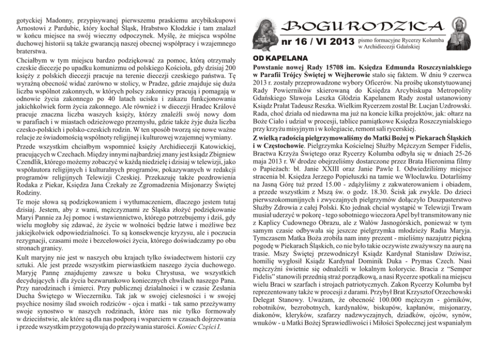 gotyckiej Madonny, przypisywanej pierwszemu praskiemu arcybikskupowi Arnostowi z Pardubic, który kochał Śląsk, Hrabstwo Kłodzkie i tam znalazł w końcu miejsce na swój wieczny odpoczynek. Myślę, że miejsca wspólne duchowej historii są także gwarancją naszej obecnej współpracy i wzajemnego braterstwa. Chciałbym w tym miejscu bardzo podziękować za pomoc, którą otrzymały czeskie diecezje po upadku komunizmu od polskiego Kościoła, gdy dzisiaj 200 księży z polskich diecezji pracuje na terenie diecezji czeskiego państwa. Tę wyraźną obecność widać zarówno w stolicy, w Pradze, gdzie znajduje się duża liczba wspólnot zakonnych, w których polscy zakonnicy pracują i pomagają w odnowie życia zakonnego po 40 latach ucisku i zakazu funkcjonowania jakichkolwiek form życia zakonnego. Ale również i w diecezji Hradec Králové pracuje znaczna liczba waszych księży, którzy znaleźli swój nowy dom w parafiach i w miastach odzieżowego przemysłu, gdzie także żyje duża liczba czesko-polskich i polsko-czeskich rodzin. W ten sposób tworzą się nowe ważne relacje ze świadomością wspólnoty religijnej i kulturowej wzajemnej wymiany. Przede wszystkim chciałbym wspomnieć księży Archidiecezji Katowickiej, pracujących w Czechach. Między innymi najbardziej znany jest ksiądz Zbigniew Czendlik, którego możemy zobaczyć w każdą niedzielę i dzisiaj w telewizji, jako współautora religijnych i kulturalnych programów, pokazywanych w redakcji programów religijnych Telewizji Czeskiej. Przekazuję także pozdrowienia Rodaka z Piekar, Księdza Jana Czekały ze Zgromadzenia Misjonarzy Świętej Rodziny. Te moje słowa są podziękowaniem i wytłumaczeniem, dlaczego jestem tutaj dzisiaj. Jestem, aby z wami, mężczyznami ze Śląska złożyć podziękowanie Maryi Pannie za Jej pomoc i wstawiennictwo, którego potrzebujemy i dziś, gdy wielu mogłoby się zdawać, że życie w wolności będzie łatwe i możliwe bez jakiejkolwiek odpowiedzialności. To są konsekwencje kryzysu, ale i poczucia rezygnacji, czasami może i bezcelowości życia, którego doświadczamy po obu stronach granicy. Kult maryjny nie jest w naszych obu krajach tylko świadectwem historii czy sztuki. Ale jest przede wszystkim pierwiastkiem naszego życia duchowego. Maryję Pannę znajdujemy zawsze u boku Chrystusa, we wszystkich decydujących i dla życia bezwarunkowo koniecznych chwilach naszego Pana. Przy narodzinach i śmierci. Przy publicznej działalności i w czasie Zesłania Ducha Świętego w Wieczerniku. Tak jak w swojej cielesności i w swojej psychice nosimy ślad swoich rodziców - ojca i matki - tak samo przeżywamy swoje synostwo w naszych rodzinach, które nas nie tylko formowały w dzieciństwie, ale które są dla nas podporą i wsparciem w czasach dojrzewania i przede wszystkim przygotowują do przeżywania starości. Koniec Części I. nr 16 / VI 2013 pismo formacyjne Rycerzy Kolumba w Archidiecezji Gdańskiej OD KAPELANA Powstanie nowej Rady 15708 im. Księdza Edmunda Roszczynialskiego w Parafii Trójcy Świętej w Wejherowie stało się faktem. W dniu 9 czerwca 2013 r. zostały przeprowadzone wybory Oficerów. Na prośbę ukonstytuowanej Rady Powierników skierowaną do Księdza Arcybiskupa Metropolity Gdańskiego Sławoja Leszka Głódzia Kapelanem Rady został ustanowiony Ksiądz Prałat Tadeusz Reszka. Wielkim Rycerzem został Br. Lucjan Uzdrowski. Rada, choć działa od niedawna ma już na koncie kilka projektów, jak: ołtarz na Boże Ciało i udział w procesji, tablice pamiątkowe Księdza Roszczynialskiego przy krzyżu misyjnym i w kolegiacie, remont sali rycerskiej. Z wielką radością pielgrzymowaliśmy do Matki Bożej w Piekarach Śląskich i w Częstochowie. Pielgrzymka Kościelnej Służby Mężczyzn Semper Fidelis, Bractwa Krzyża Świętego oraz Rycerzy Kolumba odbyła się w dniach 25-26 maja 2013 r. W drodze obejrzeliśmy dostarczone przez Brata Hieronima filmy o Papieżach: bł. Janie XXIII oraz Janie Pawle I. Odwiedziliśmy miejsce stracenia bł. Księdza Jerzego Popiełuszki na tamie we Włocławku. Dotarliśmy na Jasną Górę tuż przed 15.00 - zdążyliśmy z zakwaterowaniem i obiadem, a przede wszystkim z Mszą św. o godz. 18.30. Ścisk jak zwykle. Do dzieci pierwszokomunijnych i zwyczajnych pielgrzymów dołączyło Duszpasterstwo Służby Zdrowia z całej Polski. Kto jednak chciał wystąpić w Telewizji Trwam musiał uderzyć w pokorę - tego sobotniego wieczora Apel był transmitowany nie z Kaplicy Cudownego Obrazu, ale z Wałów Jasnogórskich, ponieważ w tym samym czasie odbywała się jeszcze pielgrzymka młodzieży Radia Maryja. Tymczasem Matka Boża zrobiła nam inny prezent - mieliśmy nazajutrz piękną pogodę w Piekarach Śląskich, co nie było takie oczywiste zważywszy na aurę na trasie. Mszy Świętej przewodniczył Ksiądz Kardynał Stanisław Dziwisz, homilię wygłosił Ksiądz Kardynał Dominik Duka - Prymas Czech. Nasi mężczyźni świetnie się odnaleźli w lokalnym kolorycie. Bracia z “Semper Fidelis” stanowili przednią straż porządkową, a nasi Rycerze spotkali na miejscu wielu Braci w szarfach i strojach patriotycznych. Zakon Rycerzy Kolumba był reprezentowany także w procesji z darami. Przybył Brat Krzysztof Orzechowski Delegat Stanowy. Uważam, że obecność 100.000 mężczyzn - górników, robotników, bezrobotnych, kardynałów, biskupów, kapłanów, misjonarzy, diakonów, kleryków, szafarzy nadzwyczajnych, dziadków, ojców, synów, wnuków - u Matki Bożej Sprawiedliwości i Miłości Społecznej jest wspaniałym świadectwem wiary i to trzeba przeżyć, trzeba tam przynajmniej raz pojechać dla zapamiętania, że w naszej rycerskiej, męskiej sprawie, nie jesteśmy sami. Że wiarą i kościołem w Polsce interesują się nie tylko kobiety, ale wielka rzesza mężczyzn różnych stanów i zawodów. “Wojsko Chrystusa” - tak napisał o nas Gdański Gość Niedzielny w numerze 24/2013 z niedzie