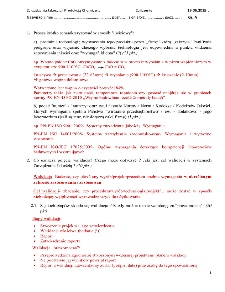 Zarządzanie Jakością i Produkcją Chemiczną Zaliczenie Nazwisko i imię …………………………………………………… pdgr. …. z dnia tyg. ……………. , godz. ……. 16.06.2015r. Gr. A 1. Proszę krótko scharakteryzować w sposób "ilościowy": a) produkt i technologię wytwarzania tego produktu przez „firmę” którą „założyła” Pani/Pana podgrupa oraz wyjaśnić dlaczego wybrana technologia jest odpowiednia z punktu widzenia zapewnienia jakości oraz "wymagań klienta" (?) (15 pkt.) np. Wapno palone CaO otrzymywane z dolomitu w procesie wypalania w piecu wapienniczym w temperaturze 900-1100°C CaCO3 CaO + CO2 kruszywo przesiewanie (32-63mm) wypalanie (900-1100°C) kruszenie (2-10mm) gotowe wapno dolomitowe Wytwarzane jest wapno o czystości powyżej 84% Parametry takie jak ziarnistość, temperatura topnienia czy gęstość znajdują się w granicach normy PN-EN 459-2:2010 „Wapno budowlane- część 2: metody badań” b) podać "numer" / "numery: oraz tytuł / tytuły Normy / Norm / Kodeksu / Kodeksów Jakości, których wymagania spełnia Państwa "wirtualne przedsiębiorstwo' / ew. - dodatkowo - jego laboratorium (jeśli są inne, niż dotyczą całej firmy) (5 pkt.) np. PN-EN ISO 9001:2009- Systemy zarządzania jakością. Wymagania PN-EN ISO 14001:2005- Systemy zarządzania środowiskowego. Wymagania i wytyczne stosowania PN-EN ISO/IEC 17025:2005- Ogólne wymagania dotyczące kompetencji laboratoriów badawczych i wzorcujących 2. Co oznacza pojęcie walidacja? Czego może dotyczyć ? Jaki jest cel walidacji w systemach Zarządzania Jakością ? (10 pkt.) Walidacja- Badanie, czy określony wyrób/projekt/procedura spełnia wymagania w określonym zakresie zastosowania / zastosowań Cel walidacji- zbadanie, czy procedura/wyrób/technologia/projekt/... może zostać w sposób niebudzący wątpliwości wprowadzona/y/e do użytkowania 2.1. Z jakich etapów składa się walidacja ? Kiedy można uznać walidację za "prawomocną" (20 pkt) Etapy walidacji: Stworzenie projektu i jego zatwierdzenie Walidacja właściwa (badania (!)) Raport Zatwierdzenie raportu Walidacja „prawomocna”: Przeprowadzona zgodnie ze stworzonym wcześniej projektem/ planem walidacji Na podstawie jej wyników powstał raport Raport z walidacji zatwierdzony został (podpis, data) prze osobę do tego upoważnioną 1 Zarządzanie Jakością i Produkcją Chemiczną Zaliczenie Nazwisko i imię …………………………………………………… pdgr. …. z dnia tyg. ……………. , godz. ……. 16.06.2015r. Gr. A Badanie zostało przeprowadzone w całym zakresie: stosowanej zmienności metody/ użytkowania produktu 3. Proszę opisać na czym może polegać "kontrola jakości badań" w laboratorium (?). (10 pkt) Kontrola jakości badań: badania międzylaboratoryjne badania wykonywane z zastosowaniem tych samych odczynników przez różnych pracowników badanie próbek kontrolnych (o znanej zawartości danej substancji/ danej wartości parametru) 4. Proszę uzupełnić treść pytań (jeśli dotyczy ......................... ) zaznaczyć poprawną odpowiedź / poprawne odpowiedzi w poniższych pytaniach "wielokrotnego wyboru" dotyczących Systemów Zarządzania Jakością (do 5 pkt.) 4.1. „Najwyższe kierownictwo”, tzn., osoba lub grupa osób, które na najwyższym szczeblu kierują organizacją i ją nadzorują, w/g Normy "9001" odpowiada m.in. za: a. Ustanowienie i zakomunikowanie Polityki Jakości b. Napisanie instrukcji i procedur Systemu Zapewnienia Jakości c. Zapewnienie "zaangażowania" pod względem poziomu dbałości o "Jakość" d. Za ustanowienie i aktualizację "Polityki Jakości" oraz za "zakomunikowanie" jej, natomiast, nie ma potrzeby dbałości o "zaangażowanie" 4.2. Organizacja powinna: a. określić infrastrukturę techniczną potrzebną do osiągnięcia zgodności z wymaganiami dla wyrobu / usługi b. zapewnić i utrzymywać w stanie funkcjonalności infrastrukturę potrzebną do osiągnięcia zgodności z wymaganiami wyrobu c. określić infrastrukturę potrzebną do osiągnięcia zgodności z wymaganiami wyrobu, ale nie musi jej utrzymywać w stanie funkcjonalności bieżącej d. udoskonalać (po analizie takiej potrzeby, dokonywanej systematycznie zgodnie z Planem Jakości) infrastrukturę potrzebną do osiągnięcia zgodności z wymaganiami wyrobu oraz klienta 4.3. Walidacja, czyli potwierdzenie, przez przedstawienie dowodu obiektywnego, że zostały spełnione wymagania dotyczące konkretnego, zamierzonego użycia lub zastosowania, to np.: a. sprawdzenie zgodności z projektem prototypu projektowanego wyrobu, b. zbadanie przydatności procesu technologicznego do otrzymania wyrobu spełniającego założenia projektowe oraz oczekiwania klienta, w przewidywanym zakresie zastosowania wyrobu, c. zbadanie przydatności metody analitycznej do wykonywania oznaczeń w określonym zakresie zastosowania procedury analitycznej d. sprawdzenie poprawności określonej procedury / instrukcji operacyjnej 4.4. W związku z wymaganiami dotyczącymi punktu 6.2.2 Normy PN-EN ISO 9001: "kompetencje, świadomość, szkolenia", organizacja zobowiązana jest do: 2 Zarządzanie Jakością i Produkcją Chemiczną Zaliczenie Nazwisko i imię …………………………………………………… pdgr. …. z dnia tyg. ……………. , godz. ……. 16.06.2015r. Gr. A a. oceny skuteczności szkolenia pracowników b. prowadzenia zapisów dotyczących odbytych szkoleń, wykształcenia i umiejętności pracowników c. określenia kompetencji wymaganych od pracownika d. planowania szkoleń na podstawie potrzeb e. przechowywania (archiwizacji) wykazów obecności pracowników podczas szkoleń, mających miejsce poza siedzibą firmy 4.5. Aspekt środowiskowy to: a. Negatywny wpływ działalności organizacji na środowisko b. Pozytywny lub negatywny wpływ działalności organizacji na środowisko c. Najbardziej szkodliwy czynnik oddziaływania przedsiębior