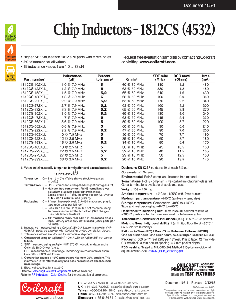 Document 105-1 Chip Inductors – 1812CS (4532) • Higher SRF values than 1812 size parts with ferrite cores • 5% tolerances for all values • 19 inductance values from 1.0 to 33 µH Inductance2 Part number1 (µH) 1812CS-102XJL_ 1.0 @ 7.9 MHz 1812CS-122XJL_ 1.2 @ 7.9 MHz 1812CS-152X_L_ 1.5 @ 7.9 MHz 1812CS-182XJL_ 1.8 @ 7.9 MHz 1812CS-222X_L_ 2.2 @ 7.9 MHz 1812CS-272X_L_ 2.7 @ 7.9 MHz 1812CS-332X_L_ 3.3 @ 7.9 MHz 1812CS-392X_L_ 3.9 @ 7.9 MHz 1812CS-472XJL_ 4.7 @ 7.9 MHz 1812CS-562XJL_ 5.6 @ 7.9 MHz 1812CS-682XJL_ 6.8 @ 7.9 MHz 1812CS-822X_L_ 8.2 @ 7.9 MHz 1812CS-103XJL_ 10 @ 7.9 MHz 1812CS-123XJL_ 12 @ 2.5 MHz 1812CS-153X_L_ 15 @ 2.5 MHz 1812CS-183XJL_ 18 @ 2.5 MHz 1812CS-223X_L_ 22 @ 2.5 MHz 1812CS-273XJL_ 27 @ 2.5 MHz 1812CS-333X_L_ 33 @ 2.5 MHz Request free evaluation samples by contacting Coilcraft or visiting www.coilcraft.com. Percent SRF min5 DCR max6 Q min4 (MHz)(Ohms) 5 60 @ 50 MHz 310 1.2 5 62 @ 50 MHz 230 1.2 5,2 65 @ 50 MHz 210 1.6 5 68 @ 50 MHz 190 2.0 5,2 63 @ 50 MHz 170 2.2 5,2 63 @ 50 MHz 160 3.2 5,2 65 @ 50 MHz 145 3.8 5,2 69 @ 50 MHz 130 5.0 5 63 @ 50 MHz 115 5.4 5 59 @ 50 MHz 100 5.7 5 60 @ 50 MHz 90 6.6 5,2 47 @ 50 MHz 80 7.0 5 36 @ 50 MHz 70 7.7 5 35 @ 10 MHz 60 8.7 5,2 34 @ 10 MHz 50 9.6 5 30 @ 10 MHz 45 10.5 5,2 32 @ 10 MHz 40 11.5 5 29 @ 10 MHz 30 12.5 5,2 20 @ 10 MHz 20 13.5 tolerance3 1. When ordering, specify tolerance, termination and packaging codes: 1812CS-333XGLC Tolerance: G=2% J = 5% (Table shows stock tolerances in bold.) Termination:L=RoHS compliant silver-palladium-platinum-glass frit. E=Halogen free component. RoHS compliant silverpalladium-platinum-glass frit terminations. Special order: T = RoHS tin-silver-copper (95.5/4/0.5) or S = non-RoHS tin-lead (63/37). Packaging:C =7″ machine-ready reel. EIA-481 embossed plastic tape (600 parts per full reel). B=Less than full reel. In tape, but not machine ready. To have a leader and trailer added ($25 charge), use code letter C instead. D =13″ machine-ready reel. EIA-481 embossed plastic tape. Factory order only, not stocked (2200 parts per full reel). 2. Inductance measured using a Coilcraft SMD-A fixture in an Agilent/HP 4286A impedance analyzer with Coilcraft-provided correlation pieces. 3. Tolerances in bold are stocked for immediate shipment. 4. Q measured using an Agilent/HP 4291A with an Agilent/HP 16193 test fixture. 5. SRF measured using an Agilent/HP 8753D network analyzer and a Coilcraft SMD-D test fixture. 6. DCR measured on a Cambridge Technology micro-ohmmeter and a Coilcraft CCF859 test fixture. 7. Current that causes a 15°C temperature rise from 25°C ambient. This information is for reference only and does not represent absolute maximum ratings. 8. Electrical specifications at 25°C. Refer to Soldering Coilcraft Components before soldering. Refer to RF Inductors – Color Coding for the explanation of color dots. Irms7 (mA) 480 480 430 380 340 300 270 240 230 220 210 200 190 180 170 160 155 150 145 Designer’s Kit C337 contains 10 of each 5% part Core material Ceramic Environmental RoHS compliant, halogen free optional Terminations RoHS compliant silver-palladium-platinum-glass frit. Other terminations available at additional cost. Weight 109 – 128 mg Ambient temperature –40°C to +125°C with Irms current Maximum part temperature +140°C (ambient + temp rise). Storage temperature Component: –40°C to +140°C. Tape and reel packaging: –40°C to +80°C Resistance to soldering heat Max three 40 second reflows at +260°C, parts cooled to room temperature between cycles Temperature Coefficient of Inductance (TCL) +25 to +125 ppm/°C Moisture Sensitivity Level (MSL) 1 (unlimited floor life at <30°C / 85% relative humidity) Failures in Time (FIT) / Mean Time Between Failures (MTBF) One per billion hours / one billion hours, calculated per Telcordia SR-332 Packaging 600 per 7″ reel; 2200 per 13″ reel. Plastic tape: 12 mm wide, 0.3 mm thick, 8 mm pocket spacing, 3.7 mm pocket depth PCB washing Tested to MIL-STD-202 Method 215 plus an additional aqueous wash. See Doc787_PCB_Washing.pdf. Document 105-1 Revised 10/12/15 Document 105-2 Chip Inductors – 1812CS Series (4532) Typical Q vs Frequency Typical L vs Frequency 80 40 1.8 µH 33.0 µH 3.9 µH 70 30 Q Factor 50 Inductance (µH) 60 8.2 µH 40 30 15.0 µH 22.0 µH 22.0 µH 20 15.0 µH 8.2 µH 10 20 33.0 µH 3.9 µH 1.8 µH 10 0 0 1 100 10 Frequency (MHz) C B overall D F A E terminal F I 1000 Recommended Land Pattern Terminal wraparound: approx 0.015/0,38 both ends F 100 Frequency (MHz) I J E 10 H Pick and place material G ABCD maxmaxmax ref 1 G H IJ 0.1950.1500.1350.0700.1000.0250.1280.1200.0450.118inches 4,953,813,431,782,540,643,253,051,143,00 mm Note: Height dimension (C) is before optional solder application. For maximum height dimension including solder, add 0.006 in / 0,152 mm. Document 105-2 Revised 10/12/15