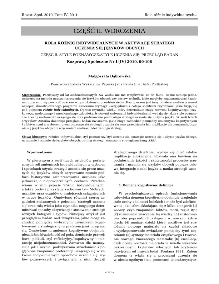 Rozpr. Społ. 2010, Tom IV, Nr 1 Rola różnic indywidualnych... CZĘŚĆ II. WDROŻENIA ROLA RÓŻNIC INDYWIDUALNYCH W AKTYWACJI STRATEGII UCZENIA SIĘ JĘZYKÓW OBCYCH CZĘŚĆ II. STYLE POZNAWCZE/STYLE UCZENIA SIĘ: PRZEGLĄD BADAŃ Rozprawy Społeczne Nr I (IV) 2010, 90-108 Małgorzata Dąbrowska Państwowa Szkoła Wyższa im. Papieża Jana Pawła II w Białej Podlaskiej Streszczenie: Począwszy od lat siedemdziesiątych XX wieku nie ma wątpliwości co do faktu, że nie istnieje jedna, uniwersalna metoda nauczania/uczenia się języków obcych czy zestaw technik, jakie mogłyby zagwarantować każdemu uczącemu się pewność sukcesu w tym złożonym przedsięwzięciu. Każdy uczeń jest inny i dlatego realizacja nawet najlepiej skonstruowanego programu nauczania wymaga uwzględnienia całego spektrum czynników, jakie kryją się pod pojęciem różnic indywidualnych. Oprócz czynnika wieku, który determinuje etapy rozwoju kognitywnego, językowego, społecznego i emocjonalnego człowieka, istotnymi zmiennymi indywidualnymi wydają się także style poznawcze i cechy osobowości uczącego się oraz preferowane przez niego strategie uczenia się i użycia języka. W serii trzech artykułów Autorka dokonuje przeglądu badań związków, jakie mogą zachodzić pomiędzy zmiennymi kognitywnymi i afektywnymi a wyborem przez uczącego się strategii uczenia się oraz przedstawia ich implikacje dla nauczania/uczenia się języków obcych z włączeniem realizacji idei treningu strategii. Słowa kluczowe: różnice indywidualne, styl poznawczy/styl uczenia się, strategie uczenia się i użycia języka obcego, nauczanie i uczenie się języków obcych, trening strategii, nauczanie strategiczne (ang. SSBI). Wprowadzenie W pierwszym z serii trzech artykułów poświęconych roli zmiennych indywidualnych w wyborze i sposobach użycia strategii uczenia się przez uczących się języków obcych zarysowane zostało podłoże historyczne zainteresowania uczniem jako jednostką o niepowtarzalnych cechach. Przedstawiono w nim pojęcie ‘różnic indywidualnych’, a także cechy i przykłady zachowań tzw. ‘dobrych’ uczniów oraz uczniów o mniejszych osiągnięciach w nauce języków. Omówiono również szereg zagadnień związanych z pojęciem ‘strategii uczenia się’ oraz rolą wieku jako czynnika mogącego determinować sposoby aktywizacji i stosowania strategii różnych kategorii i typów. Niniejszy artykuł jest przeglądem badań nad związkami, jakie mogą zachodzić pomiędzy wybranymi czynnikami kognitywnymi a strategicznymi preferencjami uczącego się. Omówione tu zmienne kognitywne obejmują: niezależność/zależność od pola, dominację prawej/ lewej półkuli, styl refleksyjny/impulsywny i tolerancję niejednoznaczności. Zarówno dla nauczyciela jak i ucznia, podwyższona świadomość i pogłębiona znajomość preferencji uczącego się w zakresie indywidualnych sposobów uczenia się, stylów poznawczych i związanych z nimi decyzji strategicznego działania, wydaje się mieć istotne implikacje edukacyjne. Pozwala ona bowiem na podniesienie jakości i skuteczności procesów nauczania i uczenia się języków obcych poprzez celową integrację nauki języka z nauką strategii uczenia się. 1. Domena kognitywna: definicja W psychologicznych opisach funkcjonowania człowieka domena kognitywna obejmuje względnie stałe cechy zdolności ludzkich i może być zdefiniowana jako sfera składająca się z kilku kategorii: (1) wiedzy, czyli znajomości faktów, teorii, reguł, itp.; (2) rozumienia znaczenia tej wiedzy; (3) zastosowania obu poprzednich kategorii w nowych sytuacjach; (4) analizy, dzięki której możliwe jest rozłożenie nowego materiału na części składowe i wyeksponowanie związków pomiędzy tymi częściami; (5) syntezy materiału cząstkowego i tworzenia nowego, znaczącego materiału; (6) ewaluacji, czyli oceny wartości materiału w świetle wyraźnie nakreślonych kryteriów własnych lub kryteriów przyjętych od innych ludzi (Fontana 1981). Zatem domena ta wiąże się z procesami uczenia się w ujęciu ogólnym (tzn. procesami charakterystycz- – 90 – Rozpr. Społ. 2010, Tom IV, Nr 1 Rola różnic indywidualnych... nymi dla wszystkich ludzi) i dotyczy wyników czynności poznawczych. Obejmuje jednak także szereg niepowtarzalnych różnic w sposobach nabywania czy przyswajania wiedzy przez poszczególne jednostki. Kognitywne różnice indywidualne powodują, iż jednostka z własnej perspektywy postrzega i zajmuje się nowymi faktami oraz podchodzi do nowych problemów w sobie szczególny sposób. Różnice te obejmują procesy, style i strategie, jakie każdy z nas wykorzystuje indywidualnie w różnorodnych sytuacjach w celu uczenia się i rozwiązywania problemów (Fontana, 1981; Brown, 2000). 2. Style kognitywne/style uczenia się Style to inaczej typowe dla danej jednostki i raczej niezmienne zestawy preferencji, tendencji, czy sposobów, w jakie wykonuje ona określone czynności. Preferowane przez jednostkę style poznawcze/style uczenia się powiązane są z cechami jej osobowości i stanami afektywnymi. (Warto dodać, że w psychologii style uczenia się stanowią właśnie część obszaru badań nad osobowością.) Ponadto, istnieją związki pomiędzy charakterystycznymi dla danej osoby stylami, czy profilem stylów, a jej motywacją i ulubionymi strategiami myślowymi wykorzystywanymi do rozwiązywania problemów (Child, 1986; Brown, 2000). Style kognitywne można zdefiniować jako „niezmienne różnice indywidualne w (…) sposobach organizowania oraz przetwarzania informacji i doświadczeń (…) rozumiane jako stałe postawy, preferencje czy nawykowe strategie determinujące typowe dla danej osoby sposoby postrzegania, zapamiętywania, myślenia i rozwiązywania problemów” (Messick, 1976, cyt. w: Child, 1986:262; tłum. własne). Ausubel (1968) dodaje, że termin ten odnosi się zarówno do czynników związanych z 