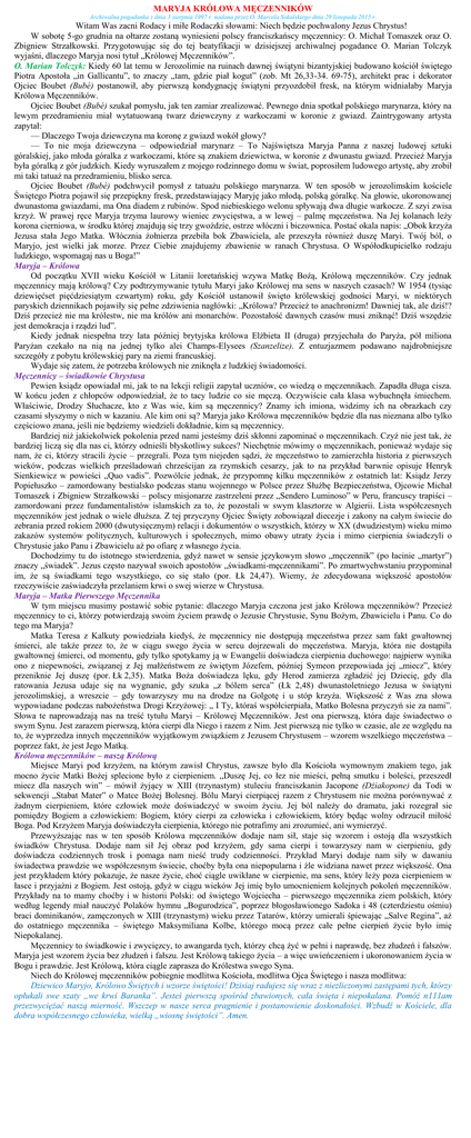 MARYJA KRÓLOWA MĘCZENNIKÓW Archiwalna pogadanka z dnia 3 sierpnia 1997 r. nadana przez O. Marcela Sokalskiego dnia 29 listopada 2015 r. Witam Was zacni Rodacy i miłe Rodaczki słowami: Niech będzie pochwalony Jezus Chrystus! W sobotę 5-go grudnia na ołtarze zostaną wyniesieni polscy franciszkańscy męczennicy: O. Michał Tomaszek oraz O. Zbigniew Strzałkowski. Przygotowując się do tej beatyfikacji w dzisiejszej archiwalnej pogadance O. Marian Tolczyk wyjaśni, dlaczego Maryja nosi tytuł „Królowej Męczenników”. O. Marian Tolczyk: Kiedy 60 lat temu w Jerozolimie na ruinach dawnej świątyni bizantyjskiej budowano kościół świętego Piotra Apostoła „in Gallicantu”, to znaczy „tam, gdzie piał kogut” (zob. Mt 26,33-34. 69-75), architekt prac i dekorator Ojciec Boubet (Bubé) postanowił, aby pierwszą kondygnację świątyni przyozdobił fresk, na którym widniałaby Maryja Królowa Męczenników. Ojciec Boubet (Bubé) szukał pomysłu, jak ten zamiar zrealizować. Pewnego dnia spotkał polskiego marynarza, który na lewym przedramieniu miał wytatuowaną twarz dziewczyny z warkoczami w koronie z gwiazd. Zaintrygowany artysta zapytał: — Dlaczego Twoja dziewczyna ma koronę z gwiazd wokół głowy? — To nie moja dziewczyna – odpowiedział marynarz – To Najświętsza Maryja Panna z naszej ludowej sztuki góralskiej, jako młoda góralka z warkoczami, które są znakiem dziewictwa, w koronie z dwunastu gwiazd. Przecież Maryja była góralką z gór judzkich. Kiedy wyruszałem z mojego rodzinnego domu w świat, poprosiłem ludowego artystę, aby zrobił mi taki tatuaż na przedramieniu, blisko serca. Ojciec Boubet (Bubé) podchwycił pomysł z tatuażu polskiego marynarza. W ten sposób w jerozolimskim kościele Świętego Piotra pojawił się przepiękny fresk, przedstawiający Maryję jako młodą, polską góralkę. Na głowie, ukoronowanej dwunastoma gwiazdami, ma Ona diadem z rubinów. Spod niebieskiego welonu spływają dwa długie warkocze. Z szyi zwisa krzyż. W prawej ręce Maryja trzyma laurowy wieniec zwycięstwa, a w lewej – palmę męczeństwa. Na Jej kolanach leży korona cierniowa, w środku której znajdują się trzy gwoździe, ostrze włóczni i biczownica. Postać okala napis: „Obok krzyża Jezusa stała Jego Matka. Włócznia żołnierza przebiła bok Zbawiciela, ale przeszyła również duszę Maryi. Twój ból, o Maryjo, jest wielki jak morze. Przez Ciebie znajdujemy zbawienie w ranach Chrystusa. O Współodkupicielko rodzaju ludzkiego, wspomagaj nas u Boga!” Maryja – Królowa Od początku XVII wieku Kościół w Litanii loretańskiej wzywa Matkę Bożą, Królową męczenników. Czy jednak męczennicy mają królową? Czy podtrzymywanie tytułu Maryi jako Królowej ma sens w naszych czasach? W 1954 (tysiąc dziewięćset pięćdziesiątym czwartym) roku, gdy Kościół ustanowił święto królewskiej godności Maryi, w niektórych paryskich dziennikach pojawiły się pełne zdziwienia nagłówki: „Królowa? Przecież to anachronizm! Dawniej tak, ale dziś!? Dziś przecież nie ma królestw, nie ma królów ani monarchów. Pozostałość dawnych czasów musi zniknąć! Dziś wszędzie jest demokracja i rządzi lud”. Kiedy jednak niespełna trzy lata później brytyjska królowa Elżbieta II (druga) przyjechała do Paryża, pół miliona Paryżan czekało na nią na jednej tylko alei Champs-Elysees (Szanzelize). Z entuzjazmem podawano najdrobniejsze szczegóły z pobytu królewskiej pary na ziemi francuskiej. Wydaje się zatem, że potrzeba królowych nie zniknęła z ludzkiej świadomości. Męczennicy – świadkowie Chrystusa Pewien ksiądz opowiadał mi, jak to na lekcji religii zapytał uczniów, co wiedzą o męczennikach. Zapadła długa cisza. W końcu jeden z chłopców odpowiedział, że to tacy ludzie co sie męczą. Oczywiście cała klasa wybuchnęła śmiechem. Właściwie, Drodzy Słuchacze, kto z Was wie, kim są męczennicy? Znamy ich imiona, widzimy ich na obrazkach czy czasami słyszymy o nich w kazaniu. Ale kim oni są? Maryja jako Królowa męczenników będzie dla nas nieznana albo tylko częściowo znana, jeśli nie będziemy wiedzieli dokładnie, kim są męczennicy. Bardziej niż jakiekolwiek pokolenia przed nami jesteśmy dziś skłonni zapominać o męczennikach. Czyż nie jest tak, że bardziej liczą się dla nas ci, którzy odnieśli błyskotliwy sukces? Niechętnie mówimy o męczennikach, ponieważ wydaje się nam, że ci, którzy stracili życie – przegrali. Poza tym niejeden sądzi, że męczeństwo to zamierzchła historia z pierwszych wieków, podczas wielkich prześladowań chrześcijan za rzymskich cesarzy, jak to na przykład barwnie opisuje Henryk Sienkiewicz w powieści „Quo vadis”. Pozwólcie jednak, że przypomnę kilku męczenników z ostatnich lat: Ksiądz Jerzy Popiełuszko – zamordowany bestialsko podczas stanu wojennego w Polsce przez Służbę Bezpieczeństwa, Ojcowie Michał Tomaszek i Zbigniew Strzałkowski – polscy misjonarze zastrzeleni przez „Sendero Luminoso” w Peru, francuscy trapiści – zamordowani przez fundamentalistów islamskich za to, że pozostali w swym klasztorze w Algierii. Lista współczesnych męczenników jest jednak o wiele dłuższa. Z tej przyczyny Ojciec Święty zobowiązał diecezje i zakony na całym świecie do zebrania przed rokiem 2000 (dwutysięcznym) relacji i dokumentów o wszystkich, którzy w XX (dwudziestym) wieku mimo zakazów systemów politycznych, kulturowych i społecznych, mimo obawy utraty życia i mimo cierpienia świadczyli o Chrystusie jako Panu i Zbawicielu aż po ofiarę z własnego życia. Dochodzimy tu do istotnego stwierdzenia, gdyż nawet w sensie językowym słowo „męczennik” (po łacinie „martyr”) znaczy „świadek”. Jezus często nazywał swoich apostołów „świadkami-męczennikami”. Po zmartwychwstaniu przypominał im, że są świadkami tego wszystkiego, co się stało (por. Łk 24,4