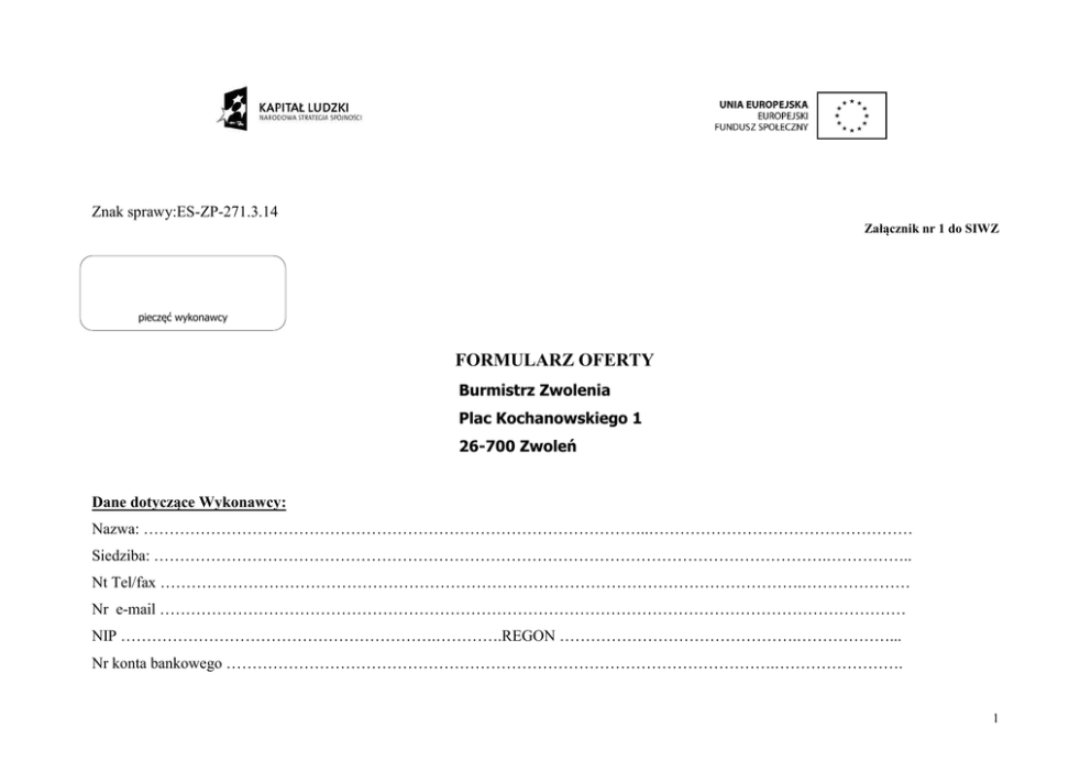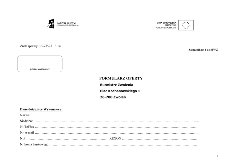 Znak sprawy:ES-ZP-271.3.14 Załącznik nr 1 do SIWZ pieczęć wykonawcy FORMULARZ OFERTY Burmistrz Zwolenia Plac Kochanowskiego 1 26-700 Zwoleń Dane dotyczące Wykonawcy: Nazwa: ……………………………………………………………………………………..…………………………………………… Siedziba: ………………………………………………………………………………………………………………….…………….. Nt Tel/fax …………………………………………………………………………………………………………….………………… Nr e-mail ……………………………………………………………………………………………………………………………… NIP …………………………………………………….………….REGON ……………………………………….………………... Nr konta bankowego …………………………………………………………………………………………….……………………. 1 Nawiązując do ogłoszonego przetargu nieograniczonego na wyłonienie Wykonawcy na zakup i dostawę sprzętu ICT do prowadzenia zajęć dydaktyczno – wyrównawczych w Publicznym Gimnazjum w Strykowicach Górnych i Sydole oraz sprzętu do biura projektu w ramach realizacji projektu pn. „Moja wiedza - moja przyszłość”. I. Oferujemy wykonanie przedmiotu zamówienia, zgodnie z wymogami zawartymi w Specyfikacji Istotnych Warunków Zamówienia za wynagrodzenie ryczałtowe obejmujące podatek VAT ( jeśli dotyczy) oraz pozostałe składniki cenotwórcze. Zadanie 1 : Zakup i dostawa sprzętu ICT niezbędnego do realizacji zajęć dydaktyczno-wyrównawczych w Publicznym Gimnazjum w Strykowicach Górnych i Publicznym Gimnazjum w Sydole Kalkulacja kosztów Lp. Przedmiot zamówienia Opis przedmiotu zamówienia Ilość Cena jednostkowa netto PLN Podatek VAT PLN 1 2 3 4 5 6 Cena jednostkowa brutto PLN (kol.5+6) 7 Cena łączna brutto PLN (kol.4x7) 8 Typ, model ………………………………………………………………………………………………………………………………………. 1. Laptop z oprogramowaniem Laptop z oprogramowaniem Microsoft Office Professional Plus 2013 MOLP AE OfficeProPlus 2013 SNGL OLP NL Acdmc . Przekątna ekranu LCD min. 15,6 cali, nominalna rozdzielczość LCD: min. 1366 x 768 pikseli, wydajność wg testów Passmark CPU Mark dostępnych na stronie: http://www.cpubenchmark.net/ cpu_list.php nie gorsze niż 3127 pkt. na dzień 28.11.2013r., wielkość pamięci RAM: min. 8 GB, pojemność dysku magnetycznego: min. 500 GB, napęd optyczny: DVD+/-RW DL, zintegrowana karta graficzna, wyjścia 2 sztuki 2 karty graficznej: wyjście HDMI i DSub, pojemność akumulatora: min. 2950 mAh, czytnik kart pamięci: SD, WiFi IEEE 802.11b/g/n, komunikacja: Bluetooth, LAN 1 Gbps, interfejsy: min. 2 x USB 2.0, min. 1 x USB 3.0, dodatkowo kamera min. 1.3 Mpix, zainstalowany system operacyjny Windows 8 PL 64bit, Waga max. 2,3 kg, Typ, model ………………………………………………………………………………………………………………………………………. 2. Drukarka laserowa Drukarka laserowa o min. wymiarach 371 x 384 x 245 mm z automatycznym dupleksem, czas wydruku 1 strony: min. 8,5 sekund, w zestawie toner na min. 3000 stron, miesięczne obciążenie max. 50000 stron, procesor: min. 400 MHz, interfejs startowy: min. USB 2.0, min. 10/100 Ethernet Base, podajnik papieru na min. 250 arkuszy, podajnik wielofunkcyjny na min. 50 arkuszy, poziom hałasu: przy drukowaniu max. 59 dB, stan gotowości: max. 34 dB, rozdzielczość druku: min. 1200x1200 dpi, min. HQ1200 (2400x600 dpi), min. 600x600 dpi, drukarka posiada ręczny dupleks, waga min. 10,5 kg, Emulacje: PCL, BRScript, Epson FX-850, IBM Pro-Printer XL, pamięć standardowa min. 64 MB, pamięć opcjonalna min. 320 MB, min. wielkość cartridge z tonerem na 8000 stron przy 5% pokryciu. 1 sztuka 3 Typ, model ………………………………………………………………………………………………………………………………………. 3. Urządzenie wielofunkcyjne Urządzenie wielofunkcyjne z zastosowaną technologią atramentową, ekran LCD min. 8,3 cm, podajnik papieru na nim. 250 arkuszy papieru, jeden podajnik wielofunkcyjny, podajnik dokumentów ADF na min. 35 arkuszy papieru, formaty papieru: A3, A4, LTR, LGL, EXE, A5, A6, Postcard, koperty + dodatkowe rozmiary, gramatury papieru min. 60-220 g/m2 , interfejs standardowy min. 10/100 Ethernet Base TX, 802.11 b wireless, pamięć RAM min. 64 MB, prędkość faksu min. 33,600 bps, posiada podwójny dostęp, szybki skan: prędkość dla formatu A4 min. 4 sekundy, pamięć według stron: min. 400 stron, szybkie wybieranie min 100 numerów, wybieranie grupowe min. 6 grup, tryb korekcji błędów ECM, PC-FAX, prędkość druku: mono min. 35, w kolorze min. 27, rozdzielczość druku: min. 1200x6000 dpi, prędkość kopiowania min. 23 strony na minutę mono i min. 20 stron na minutę w kolorze, rozdzielczość kopiowania (skan) 1200x1200 dpi, zmniejszanie/ powiększanie kopii: min. 25% - 400% co 1%, możliwość kopiowania wielokrotnego, rozdzielczość skanowania : optyczna min. 2400 x 2400 dpi, interpolowa min. 19200 x 19200 dpi, możliwość skanowani do: obrazu, OCR, E-maila, pliku, pamięci USB, serwera pocztowego, FTP, folderu 1 sztuka 4 sieciowego, media (karta), kompatybilność z TWAIN, skala szarości min. 256 poziomów, czytnik kart pamięci, PictBridge, pobór mocy: stan gotowości min. 7,5 W, druk min. 26 W, uśpienie max.4 W, waga min. 15,6 kg, wymiary ok. 540 x 489 x 257 mm. Typ, model ………………………………………………………………………………………………………………………………………. 4. Aparat Fotograficzny Aparat fotograficzny o rozdzielczości z