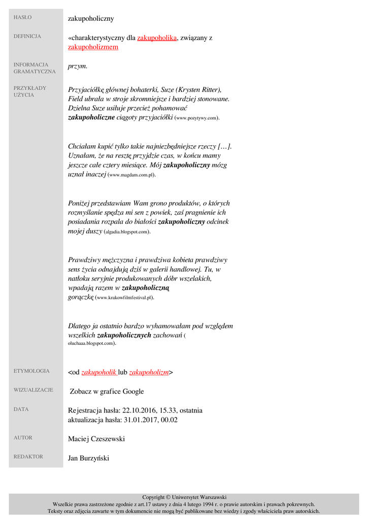 HASŁO zakupoholiczny DEFINICJA «charakterystyczny dla zakupoholika, związany z zakupoholizmem» INFORMACJA GRAMATYCZNA przym. PRZYKŁADY UŻYCIA Przyjaciółkę głównej bohaterki, Suze (Krysten Ritter), Field ubrała w stroje skromniejsze i bardziej stonowane. Dzielna Suze usiłuje przecież pohamować zakupoholiczne ciągoty przyjaciółki (www.pozytywy.com). Chciałam kupić tylko takie najniezbędniejsze rzeczy […]. Uznałam, że na resztę przyjdzie czas, w końcu mamy jeszcze całe cztery miesiące. Mój zakupoholiczny mózg uznał inaczej (www.magdam.com.pl). Poniżej przedstawiam Wam grono produktów, o których rozmyślanie spędza mi sen z powiek, zaś pragnienie ich posiadania rozpala do białości zakupoholiczny odcinek mojej duszy (algadia.blogspot.com). Prawdziwy mężczyzna i prawdziwa kobieta prawdziwy sens życia odnajdują dziś w galerii handlowej. Tu, w natłoku seryjnie produkowanych dóbr wszelakich, wpadają razem w zakupoholiczną gorączkę (www.krakowfilmfestival.pl). Dlatego ja ostatnio bardzo wyhamowałam pod względem wszelkich zakupoholicznych zachowań ( oluchaaa.blogspot.com). ETYMOLOGIA WIZUALIZACJE <od zakupoholik lub zakupoholizm> Zobacz w grafice Google DATA Rejestracja hasła: 22.10.2016, 15.33, ostatnia aktualizacja hasła: 31.01.2017, 00.02 AUTOR Maciej Czeszewski REDAKTOR Jan Burzyński Copyright © Uniwersytet Warszawski Wszelkie prawa zastrzeżone zgodnie z art.17 ustawy z dnia 4 lutego 1994 r. o prawie autorskim i prawach pokrewnych. Teksty oraz zdjęcia zawarte w tym dokumencie nie mogą być publikowane bez wiedzy i zgody właściciela praw autorskich. Powered by TCPDF (www.tcpdf.org)