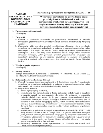 ZARZĄD INFRASTRUKTURY KOMUNALNEJ I TRANSPORTU W KRAKOWIE Karta usługi / procedura zewnętrzna nr ZIKiT - 50 Wydawanie zezwolenia na prowadzenie przez przedsiębiorców działalności w zakresie prowadzenia grzebowisk zwłok zwierzęcych i ich części na terenie Gminy Miejskiej Kraków (nie dotyczy gminnych jednostek organizacyjnych) 1. Załatw sprawę elektronicznie Nie dotyczy. 2. Załączniki 1) Wniosek o udzielenie zezwolenia na prowadzenie działalności w zakresie prowadzenia grzebowisk zwłok zwierzęcych i ich części na terenie Gminy Miejskiej Kraków, 2) Wymagania, jakie powinien spełniać przedsiębiorca ubiegający się o uzyskanie zezwolenia na prowadzenie działalności w zakresie prowadzenia grzebowisk zwłok zwierzęcych i ich części na terenie Gminy Miejskiej Kraków wprowadzonych uchwałą Nr XCII/1233/10 Rady Miasta Krakowa z dnia 17 lutego 2010 r. w sprawie określenia wymagań, jakie powinien spełniać przedsiębiorca ubiegający się o uzyskanie zezwolenia na prowadzenie działalności w zakresie prowadzenia grzebowisk i spalarni zwłok zwierzęcych i ich części na terenie Gminy Miejskiej Kraków. 3. Wersja w języku migowym Nie dotyczy. 4. Sprawę załatwia Zarząd Infrastruktury Komunalnej i Transportu w Krakowie, ul. Za Torem 22, 30-542 Kraków, Dział Utrzymania Czystości 5. Dokumenty od wnioskodawcy (klienta) 1) Wniosek (na druku stanowiącym załącznik nr 1 do niniejszej procedury) o udzielenie zezwolenia na prowadzenie działalności w zakresie prowadzenia grzebowisk zwłok zwierzęcych i ich części na terenie Gminy Miejskiej Kraków. 2) Załączniki do wniosku: a) dowód wpłaty opłaty skarbowej, b) oświadczenie lub zaświadczenie o braku zaległości podatkowych i zaległości w płaceniu składek na ubezpieczenie zdrowotne lub społeczne; w przypadku złożenia oświadczenia, składa się je pod rygorem odpowiedzialności karnej za składanie fałszywych zeznań; składający oświadczenie zobowiązany jest do zawarcia w nim klauzuli następującej treści: „Jestem świadomy odpowiedzialności karnej za złożenie fałszywego oświadczenia” (oświadczenia i zaświadczenia winny dotyczyć firmy, a w przypadku zawarcia spółki cywilnej, każdego ze wspólników z osobna), c) oświadczenie o spełnieniu wymagań wprowadzonych uchwałą Nr XCII/1233/10 Rady Miasta Krakowa z dnia 17 lutego 2010 r. w sprawie określenia wymagań, jakie powinien spełniać przedsiębiorca ubiegający się o uzyskanie zezwolenia na prowadzenie działalności w zakresie prowadzenia grzebowisk i spalarni zwłok zwierzęcych i ich części na terenie Gminy Miejskiej Kraków – na druku stanowiącym załącznik nr 1 do wniosku, d) dokumenty wskazujące osoby upoważnione do składania oświadczeń woli i podpisów w imieniu przedsiębiorcy, e) kserokopie dowodów rejestracyjnych pojazdów przeznaczonych do prowadzenia działalności objętej zezwoleniem wraz z potwierdzeniem aktualnych badań technicznych (w przypadku, gdy właścicielem pojazdu jest inna osoba niż wnioskodawca, należy załączyć kserokopię np. umowy dzierżawy, leasingu lub użyczenia), f) kserokopia dokumentu potwierdzającego, że wnioskodawca jest uprawniony do występowania w obrocie prawnym, g) kserokopia dokumentu potwierdzającego posiadanie tytułu prawnego do nieruchomości na której będzie prowadzona działalność na terenie przewidzianym na ten cel w miejscowym planie zagospodarowania przestrzennego lub ustalonym ostateczną decyzją o warunkach zabudowy dla planowanej inwestycji, h) oświadczenie wnioskodawcy potwierdzające prawo do dysponowania chłodnią do czasowego przetrzymywania zwłok zwierząt lub w przypadku jego braku pisemne oświadczenie o gotowości do odbioru zwłok zwierzęcych przez oddzielny podmiot prowadzący działalność w zakresie zbierania, przechowywania, przetwarzania, wykorzystywania lub usuwania ubocznych produktów zwierzęcych, i) kserokopia decyzji Państwowego Powiatowego Lekarza Weterynarii zatwierdzająca zakład do prowadzenia działalności w zakresie grzebowiska zwłok zwierzęcych i ich części, j) oświadczenie wnioskodawcy o dysponowaniu odpowiednio przygotowanym personelem gwarantującym stałe świadczenie usługi, zgodnie z wnioskowanym zakresem działalności, k) dla spółki cywilnej kserokopia umowy spółki zarejestrowanej we właściwym Urzędzie Skarbowym, upoważnienie wspólników do reprezentowania spółki przed organami administracji dla wspólnika składającego wniosek i odbierającego decyzje administracyjną. Dokumenty urzędowe należy składać w oryginale, kserokopii potwierdzonej za zgodność z oryginałem notarialnie lub przez organ, który go wydał. 6. Opłaty 1) Opłata skarbowa: a) za udzielenie zezwolenia wynosi 616 zł, b) za zmianę lub kontynuację zezwolenia wynosi 308 zł, c) od złożenia dokumentu stwierdzającego udzielenie pełnomocnictwa lub prokury albo jego odpisu, wypisu lub kopii wynosi 17 zł (z wyłączeniem pełnomocnictwa udzielanego małżonkowi, wstępnemu, zstępnemu lub rodzeństwu, lub gdy mocodawcą jest podmiot zwolniony z opłaty skarbowej). 2) Wpłat z tytułu opłaty skarbowej można dokonywać na rachunek bankowy Urzędu Miasta Krakowa (np. na poczcie, przelewem bankowym) lub bez ponoszenia dodatkowych opłat w placówkach Pekao S.A. na terenie Krakowa, kasie Zarządu Infrastruktury Komunalnej i Transportu w Krakowie (kasa ZIKiT czynna jest w godzinach od 9.00 do 14.30), kasach Urzędu Miasta Krakowa. Dowód zapłaty należnej opłaty skarbowej należy załączyć do wniosku. 3) Internetowy dowód wpłaty powinien precyzyjnie określić przedmiot tej opłaty oraz to, w którym urzędzie/jednostce/wydziale ma być dokonana czynność urzędowa. NUMER KONTA Opłata skarbowa - 04 1240 2092 9462 3005 0000 0000 7. Forma załatwienia Decyzja administracyjna. 8. Termin załatwienia Do 30 dni od dnia złożenia przez stronę kompletu wymaganych dokumentów. 9. Dokumenty uzyskiwane w post