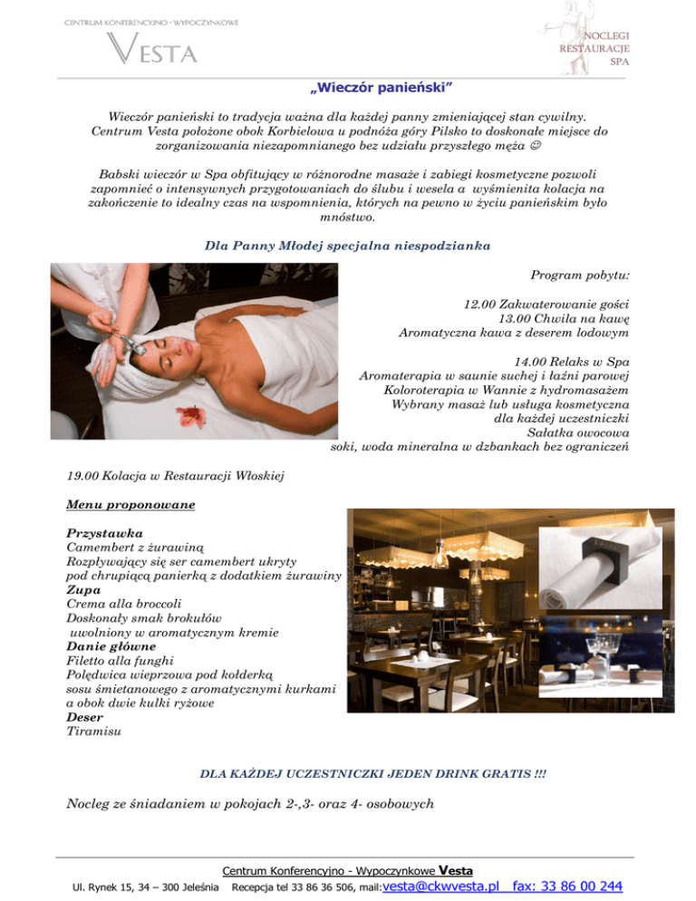 NOCLEGI RESTAURACJE SPA „Wieczór panieński” Wieczór panieński to tradycja ważna dla każdej panny zmieniającej stan cywilny. Centrum Vesta położone obok Korbielowa u podnóża góry Pilsko to doskonałe miejsce do zorganizowania niezapomnianego bez udziału przyszłego męża Babski wieczór w Spa obfitujący w różnorodne masaże i zabiegi kosmetyczne pozwoli zapomnieć o intensywnych przygotowaniach do ślubu i wesela a wyśmienita kolacja na zakończenie to idealny czas na wspomnienia, których na pewno w życiu panieńskim było mnóstwo. Dla Panny Młodej specjalna niespodzianka Program pobytu: 12.00 Zakwaterowanie gości 13.00 Chwila na kawę Aromatyczna kawa z deserem lodowym 14.00 Relaks w Spa Aromaterapia w saunie suchej i łaźni parowej Koloroterapia w Wannie z hydromasażem Wybrany masaż lub usługa kosmetyczna dla każdej uczestniczki Sałatka owocowa soki, woda mineralna w dzbankach bez ograniczeń 19.00 Kolacja w Restauracji Włoskiej Menu proponowane Przystawka Camembert z żurawiną Rozpływający się ser camembert ukryty pod chrupiącą panierką z dodatkiem żurawiny Zupa Crema alla broccoli Doskonały smak brokułów uwolniony w aromatycznym kremie Danie główne Filetto alla funghi Polędwica wieprzowa pod kołderką sosu śmietanowego z aromatycznymi kurkami a obok dwie kulki ryżowe Deser Tiramisu DLA KAŻDEJ UCZESTNICZKI JEDEN DRINK GRATIS !!! Nocleg ze śniadaniem w pokojach 2-,3- oraz 4- osobowych Centrum Konferencyjno - Wypoczynkowe Vesta Ul. Rynek 15, 34 – 300 Jeleśnia Recepcja tel 33 86 36 506, mail:[email protected] fax: 33 86 00 244