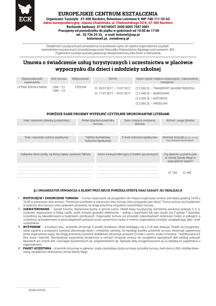 EUROPEJSKIE CENTRUM KSZTAŁCENIA Organizator Turystyki: 47-400 Racibórz, Bolesława Leśmiana 9, NIP 748-111-53-63 Adres korespondencyjny: Joanna Chudzińska, ul. Chełmońskiego 32/6, 47-400 Racibórz Rachunek bankowy: 37 84740007 2000 0005 7587 0001 Pracujemy od poniedziałku do piątku w godzinach od 10:00 do 17:00 tel. 32 726 25 33, e-mail: [email protected] koloniena5.pl, zwiadowcy.pl __________________________________________________________________________________________________________________________ Działalność turystyczna jest prowadzona na podstawie wpisu do rejestru organizatorów turystyki i pośredników turystycznych prowadzonego przez Marszałka Województwa Śląskiego pod numerem 802. Organizator turystyki posiada gwarancję ubezpieczeniową AXA Direct w Warszawie ______________________________________________________________________________________________________________________________________________________________________________________ Umowa o świadczenie usług turystycznych i uczestnictwa w placówce wypoczynku dla dzieci i młodzieży szkolnej Nazwa placówki wypoczynku Kod turnusu Miejscowość LETNIA SZKOŁA MAGII LSM – C1 LSM – C2 CZOCHA Termin □ □ Cena i wybór miejsca rozpoczęcia i zakończenia transportu 03.07.2017 – 15.07.2017 17.07.2017 – 29.07.2017 □ 2.260 ZŁ – TRANSPORT WŁASNY RODZICA □ 2.440 ZŁ – WARSZAWA □ 2.420 ZŁ – KATOWICE □ 2.360 ZŁ – WROCŁAW PONIŻSZE DANE PROSIMY WYPEŁNIĆ CZYTELNIE DRUKOWANYMI LITERAMI Imię i nazwisko dziecka (uczestnika) Pesel dziecka/uczestnika turnusu Data i miejsce urodzenia dziecka Wzrost i waga dziecka …............................................................................... ….................................................... …................................................... …................................................. Imię i nazwisko rodzica (opiekuna) Telefon kontaktowy rodziców/opiekunów E-mail rodziców/opiekunów Rozmiar koszulki (s, m, l, xl, xxl) ….................................................... …................................................... …............................................................................... wg rozmiarów dla dorosłych Dokładne dane osoby, na którą należy wystawić fakturę Adres korespondencyjny (z kodem pocztowym) ….......................................................................................................... ............................................................................................................ ............................................................................................................ ............................................................................................................ …..................................................................................... ........................................................................................ ........................................................................................ ........................................................................................ …................................................. Czy dziecko uczestniczyło w Letniej Szkole Magii w poprzednich latach? □ TAK □ NIE § 1 ORGANIZATOR OŚWIADCZA A KLIENT PRZYJMUJE PONIŻSZĄ OFERTĘ ORAZ ZASADY JEJ REALIZACJI 1. ROZPOCZĘCIE I ZAKOŃCZENIE TURNUSU – Turnus rozpoczyna się przyjazdem do miejsca organizacji turnusu pomiędzy godziną 14.00 a 16.00 w pierwszym dniu turnusu. Pierwszym posiłkiem w pierwszym dniu turnusu (dniu przyjazdu) jest obiad. Turnus kończy się śniadaniem w ostatnim dniu turnusu oraz wydaniem prowiantu na drogę powrotną wszystkim uczestnikom turnusu. 2. ZAKWATEROWANIE – Zamek Czocha, Stankowice-Sucha w gminie Leśna. Obiekt klasy turystycznej, dormitoria zamkowe (pokoje) 3, 4, 5, osobowe, wyposażone w łóżka, szafki, stolik, krzesła, gniazdko elektryczne – pokoje z łazienkami lub typu studio (na 2 pokoje 1 łazienka). Uczestnicy są zakwaterowani w budynkach zamkowych. Organizator turnusu nie prowadzi indywidualnych rezerwacji miejsc w pokojach, a uczestnicy są kwaterowani w poszczególnych pokojach przez uprawnione osoby w imieniu organizatora turystyki, uwzględniając płeć i wiek uczestników. 3. WYŻYWIENIE – w każdym dniu uczestnik otrzymuje 3 posiłki (śniadanie, obiad składający się z 2-ch dań, kolacja). Posiłki są przygotowy wane zgodnie z przepisami żywienia zbiorowego dzieci i młodzieży szkolnej. Do każdego posiłku uczestnik turnusu otrzymuje zapewniony przez organizatora napój. Na drogę powrotną uczestnik dodatkowo otrzymuje prowiant (2 bułki z serem, woda mineralna – butelkowana 0,5 litra, owoc i batonik). Standardowe wyżywienie świadczone w ramach niniejszej umowy nie uwzględnia specjalnych diet według wskazań lekarskich ani innych diet i wymagań żywieniowych np. wegetariańskich itp. Specjale diety przygotowywane są za dopłatą po uzgodnieniu z organizatorem. 4. PAKIET UCZESTNIKA - Uczestnik otrzymuje w pakiecie: szatę czarodzieja szytą na miarę, koszulkę turnusu, herb domu LSM, różdżkę drewnianą, świadectwo ukończenia Letniej Szkoły Magii. ….............................................................. (podpis klienta) 5. PROGRAM TEMATYCZNO-DYDAKTYCZNY TURNUSU – – Przydział do domów Letniej Szkoły Magii przy udziale „Tiary Przydziału” podczas uczty początkowej, prezentacja początkowa i prezentacja końcowa (międzydomowy konkurs przedstawień), bieg po różdżkę, gry tematyczne w konwencji świata Harry’ego Pottera, dyskoteki i bal magicznych postaci, konkurs talentów, turniej szachowy z udziałem żywych szachów, wieczór debat, ognisko, nocne zwiedzanie zamku, quiz wiedzy o książkach z serii „Harry Potter”. Dwie projekcje filmu. Wycieczka statkiem po Kwisie. Przedmioty nauczane podczas trwania turnusu: quidditch (gra sportowa na zasadach Międzynarodoweg